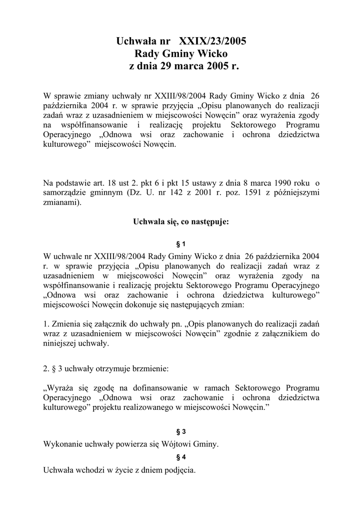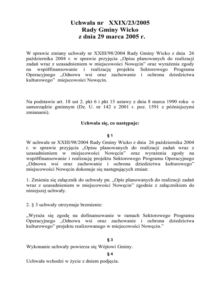 Uchwała nr XXIX/23/2005 Rady Gminy Wicko z dnia 29 marca 2005 r. W sprawie zmiany uchwały nr XXIII/98/2004 Rady Gminy Wicko z dnia 26 października 2004 r. w sprawie przyjęcia „Opisu planowanych do realizacji zadań wraz z uzasadnieniem w miejscowości Nowęcin” oraz wyrażenia zgody na współfinansowanie i realizację projektu Sektorowego Programu Operacyjnego „Odnowa wsi oraz zachowanie i ochrona dziedzictwa kulturowego” miejscowości Nowęcin. Na podstawie art. 18 ust 2. pkt 6 i pkt 15 ustawy z dnia 8 marca 1990 roku o samorządzie gminnym (Dz. U. nr 142 z 2001 r. poz. 1591 z późniejszymi zmianami). Uchwala się, co następuje: §1 W uchwale nr XXIII/98/2004 Rady Gminy Wicko z dnia 26 października 2004 r. w sprawie przyjęcia „Opisu planowanych do realizacji zadań wraz z uzasadnieniem w miejscowości Nowęcin” oraz wyrażenia zgody na współfinansowanie i realizację projektu Sektorowego Programu Operacyjnego „Odnowa wsi oraz zachowanie i ochrona dziedzictwa kulturowego” miejscowości Nowęcin dokonuje się następujących zmian: 1. Zmienia się załącznik do uchwały pn. „Opis planowanych do realizacji zadań wraz z uzasadnieniem w miejscowości Nowęcin” zgodnie z załącznikiem do niniejszej uchwały. 2. § 3 uchwały otrzymuje brzmienie: „Wyraża się zgodę na dofinansowanie w ramach Sektorowego Programu Operacyjnego „Odnowa wsi oraz zachowanie i ochrona dziedzictwa kulturowego” projektu realizowanego w miejscowości Nowęcin.” §3 Wykonanie uchwały powierza się Wójtowi Gminy. §4 Uchwała wchodzi w życie z dniem podjęcia. OPIS PLANOWANYCH DO REALIZACJI ZADAŃ WRAZ Z UZASADNIENIEM MIEJSCOWOŚCI NOWĘCIN 2004-2014 GMINA WICKO NOWĘCIN, czerwiec 2004 TROCHĘ HISTORII We wsi rodowej Wejherów znajduje się park podworski z pałacem, który zbudował Mikołaj Wejher w 1497 roku. Pałac przebudowano w XVI i XIX wieku po to, by otrzymał neogotycki charakter. W parku zachowały się kaplica gotycka tzw. Jerozolimska, kaplica grobowa z połowy XIX wieku fragmenty umocnień obronnych w postaci wałów i fosy. Na zboczu fosy, od strony bramy wjazdowej do parku, rośnie gęsiówka wieżyczkowata Arabis gabra, nieczęsta roślina we florze północnej Polski. NASZA MIEJSCOWOŚĆ Nasza miejscowość leży nad kryptodepresyjnym jeziorem SARBSKO, które jest jednym z większych jezior Polski (6580 m długości, 1240 m szerokości i 677 ha powierzchni) o charakterystycznej dla jezior przymorskich niewielkiej głębokości maksymalnej (3,2 m) i bardzo małej głębokości średniej (1,2 m). Nowęcin jest wiodącym sołectwem pod względem turystycznym Gminy Wicko dysponującym infrastrukturą hotelowo – noclegową. Bazę noclegową stanowią tu prywatne kwatery, pensjonat, ośrodki wypoczynkowe, domki letniskowe, pola namiotowe oraz gospodarstwa agroturystyczne, których liczba wciąż wzrasta. Ciekawą ofertę przedstawiają ośrodki hippiczne w Nowęcinie (wczasy w siodle, kolonie). ANALIZA ZASOBÓW WSI KLUCZOWE OPIS JAK JEST ? ZAGADNIENIE Stan otoczenia -miejscowość położone - ogrzewanie domów i środowiska nad jeziorem Sarbsko w większości drze-sąsiadujące z Łebą wem lub węglem -otoczone łąkami i lasami Jaki wygląd ma - wieś o zabudowie wieś ? elipsowatej położona nad jeziorem Sarbsko Jakie funkcje pełni - turystyczną wieś - handlową -usługową -w małym stopniu rolniczą JAK MA BYĆ ? -zmiana ogrzewania na olejowe lub gazowe -sortowanie odpadów -nasadzenie drzew i krzewów ozdobnych - zadbane posesje - ukwiecone i zadbane obejścia - nie zagospodarowa- - założone i wykoszone trawnine miejsca publiczne ki - poprawione elewacje - położony chodnik - nasadzone krzewy ozdobne i kwiaty - dostosowane obejścia i mieszkania do standardów europejskich - zagospodarowane miejsca publiczne, boisko, plac zabaw, plaża - zagospodarowane działki prywatne - prawidłowa - utrzymać istniejący stan - podnieść jakość oferty turystycznej - rozbudować usługi i handel - stworzyć nowe miejsca pracy Kim mieszkańcy są - osadnicy z Polski Centralnej i wschodniej oraz ich potomkowie - ludność napływowa - ludność niemieckojęzyczna Co daje -turystyka 50 % utrzymanie -handel 10 % -renty i emerytury 10 % -rolnictwo 5 % -praca poza miej miej – scem zamieszkania 5 % - zasiłki dla bezrobotnych 5% -bez prawa do zasiłku 15 % Jak jest -Rada Sołecka zorganizowane -Rada Kościelna sołectwo ? -Grupa Odnowy Wsi -SSA „Pomorzanie i Kaszubi” -SKW ,,Ziemia Lęborska’’ Co proponuje się -boisko sportowe dzieciom -pomost i młodzieży ? -plac zabaw Z kim rozwiązuje -Rada Sołecka się problemy ? -Rada Gminy -Urząd Gminy -Ośrodek Pomocy Społecznej -GKRPA -SSA „Pomorzanie i Kaszubi” DANE SZCZEGÓŁOWE Oświetlenie uliczne Jezioro „Sarbsko” - kontakty sąsiedzkie prawidłowe - zintegrowana wieś celem wspólnego działania - brak możliwości stałej pracy - zbyt mała promocja turystyczna - słaba infrastruktura wsi - zwiększyć dochody z turystyki - rozwinąć handel i usługi - dostosowywać się do zmieniających się sytuacji gospodarczych i ekonomicznych -organizacje działające dorywczo -zaangażowane tylko nieliczne osoby -wszyscy mieszkańcy biorą udział w organizowaniu imprez -bardzo aktywna młodzież -rozpowszechniona pomoc sąsiedzka -reaktywować KGW -boiska do piłki nożnej siatkowej i koszykówki -kort do tenisa ziemnego -plac zabaw dla dzieci -utworzenie salki internetowej -koła zainteresowań -utrwalanie i pogłębianie dotychczasowej współpracy -aktywniejsze działania mieszkańców na rzecz wsi -dobrze działające organizacje wiejskie -uboga oferta zajęć pozaszkolnych -uboga oferta dla młodzieży -uboga oferta dla małych dzieci -współpraca układa się dość dobrze JAK JEST ? -częściowy brak oświetlenia JAK MA BYĆ ? -wykonanie instalacji elektrycznych -zakupienie lamp ulicznych -nie zagospodarowana -zagospodarowana plaża plaża -brak dojścia i dojazdu -wyposażona w urządzenia - br