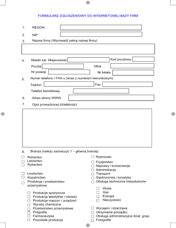 FORMULARZ ZGŁOSZENIOWY DO INTERNETOWEJ BAZY FIRM 1. REGON 2. NIP 3. Nazwa firmy (Wprowadź pełną nazwę firmy) 4. Poczta Nr posesji 5. Kod pocztowy Miasto lub Miejscowość Ulica Nr lokalu Numer telefonu i FAXu (wraz z numerem kierunkowym) Telefon Fax Telefon komórkowy 6. Adres strony WWW. 7. Opis prowadzonej działalności 8. Branża (należy zaznaczyć 1 – główną branżę) Rolnictwo Leśnictwo Rybactwo Łowiectwo Kopalnictwo Produkcja i przetwórstwo przemysłowe Produkcja spożywcza Produkcja tekstyliów i odzieży Produkcja maszyn i urządzeń Wyroby chemiczne Przetwórstwo przemysłowe Poligrafia Farmaceutyka Pozostała produkcja Rzemiosło Fryzjerstwo Naprawy i konserwacje Administracja Transport Gastronomia i turystyka Obsługa techniczna mieszkańców Woda Gaz Energia Nieczystości Wynajem i dzierżawa Utrzymanie porządku Obsługa administracyjna dział. gosp. Fotografia Pośrednictwo pracy Budownictwo Motoryzacja Handel Handel hurtowy Sklepy spożywcze Sklepy wielobranżowe Stragany i targowiska Handel internetowy Inny handel Lecznictwo i zdrowie Weterynarz Apteka Służba zdrowia Praktyka lekarska Kultura Pomoc społeczna Rozrywka i sport Organizacje i stowarzyszenia Ochrona Informacja i komunikacja Finanse Bankowość Agencje pośredniczące Ubezpieczenia Obsługa biznesu i ludności Nieruchomości Prawo Rachunkowość i księgowość Doradztwo, rzeczoznawstwo Reklama Pracownie projektowe Nauka Edukacja Szkoły językowe INNA (jaka?) 9. Adres email*(Ten adres będzie używany do logowania – brak adresu mailowego uniemożliwi wprowadzenie firmy do BAZY ) Jeśli wypełnisz tę część formularza, Twoja firma zostanie zapisana do BAZY KOOPERACYJNEJ (OFERUJEMY/POSZUKUJEMY) Poszukujemy Oferujemy OŚWIADCZAM, ŻE ZAPOZNAŁEM SIĘ Z REGULAMINEM INTERNETOWEJ BAZY FIRM I AKCEPTUJĘ WARUNKI W NIM ZAPISANE. _____________________________ Podpis właściciela firmy Do zgłoszenia można dołączyć logo firmy/ zdjęcia zapisane na nośniku – płycie CD lub DVD. Wymagane rozmiary pliku to 250px x 100px. Dozwolone są następujące rozszerzenia plików: gif, png, jpg, jpeg