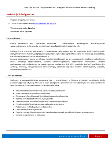Zaoczne Studia Inżynierskie na Odległość w Politechnice Warszawskiej Instalacje Inteligentne Program przygotowany przez: • dr inż. Krzysztof Duszczyk ([email protected]), Wymiar przedmiotu: 6 punkty Forma zaliczenia: Egzamin Cel przedmiotu Celem przedmiotu jest zapoznanie studentów z nowoczesnymi technologiami wykorzystywanymi w sterowaniu, monitoringu i wizualizacji instalacji budynkowych. informatycznymi Podręcznik ma charakter elementarny – przeglądowy. Adresowany jest do studentów uczelni technicznych, różnych kierunków studiów, pragnących w przyszłości zajmować się projektowaniem, modernizacją, eksploatacją, czy administrowaniem instalacji budynkowych. Zawiera podstawową wiedzę w zakresie instalacji znajdujących się w nowoczesnych obiektach budowlanych (HVAC, instalacje bezpieczeństwa, zasilanie elektroenergetyczne, okablowanie strukturalne). Omawia podstawowe, najpopularniejsze na świecie systemy inteligentne (EIB, LCN, LonWorks, BACnet), pod kątem ich aplikacji, struktury, oprogramowania narzędziowego, transmisji sygnałów, mediów transmisyjnych, urządzeń, monitoringu i wizualizacji. Treść przedmiotu Rachunek prawdopodobieństwa powiązany jest z przedmiotami w których występują zagadnienia błędu pomiarowego oraz estymacji. Oznacza to ścisłe powiązanie z przedmiotami laboratoryjnymi oraz eksperymentami w których wyniki podlegają ścisłemu opracowaniu i analizie. • • • • • • • • • • Zdarzenia elementarne i losowe, relacje miedzy zdarzeniami Klasyczna definicja prawdopodobieństwa Zastosowanie kombinatoryki do obliczania prawdopodobieństw Rozkład prawdopodobieństwa .Dystrybuanta Zmienne losowe dyskretne i ciągłe oraz ich parametry rozkładu Prawdopodobieństwo warunkowe, całkowite, wzór Bayesa Podstawowe rozkłady prawdopodobieństwa Centralne twierdzenia graniczne Elementy statystyki matematycznej -zagadnienia estymacji -weryfikacja hipotez statystycznych Metody komputerowe w statystyce www.okno.pw.edu.pl Strona 1 Zaoczne Studia Inżynierskie na Odległość w Politechnice Warszawskiej Bibliografia Bibliografia 1. • Praca dyplomowa K.Nowacki, M.Sekuła „System wizualizacji i sterowania instalacją inteligentnego budynku z wykorzystaniem komputera przemysłowego CX 9000”. PW - ISEP, Warszawa 2007 • http://zs3.dhs.org/szkola/aktualnosci/strona1/media_transmisyjne.htm • http://hulko.info/Wyklad%209%20-%20TT%20(Media%20transmisyjne).doc • • • • • Bibliografia 2. Praca dyplomowa E. Turowska „Systemy bezpieczeństwa w inteligentnym budynku”. PW - ISEP, Warszawa 2006 Praca dyplomowa M. Sienkiewicz, S. Fedorowicz „Monitoring i zdalne sterowanie układu gwarantowanego zasilania inteligentnego budynku”. PW - ISEP, Warszawa 2007 Praca dyplomowa G.Selwant „Integracja systemów bezpieczeństwa w inteligentnym budynku”. PW - ISEP, Warszawa 2007 http://www.e-instalacje.pl/159_1496.htm http://www.e-instalacje.pl/93_2569.htm Bibliografia 3 • http://www.zabezpieczenia.com.pl/archiwum/1_2006/zintegrowane-standardy-komunikacji.html • Praca dyplomowa G. Oskroba, R. Sobolewski: “ Zarządzanie inteligentnym budynkiem • na przykładzie systemu METASYS firmy Johnson Controls”, PW - ISEP, Warszawa 2006. • • • • Bibliografia 4 P. Petykiewicz “Technika systemowa budynku instabus EIB. Podstawy projektowania”, Warszawa 1999. P. Petykiewicz "Nowoczesna zintegrowana instalacja elektryczna systemu Instabus EIB w Inteligentnych budynkach", Warszawa 2001. Praca dyplomowa: P. Heldt, T. Osewski „Stanowisko laboratoryjne z wykorzystaniem systemu EIB.”, PW - ISEP , Warszawa 2002. Praca dyplomowa T.Basaj, A.Włastowski: “Realizacja funkcji inteligentnego budynku w oparciu o technologię EIB.” , PW - ISEP , Warszawa 2003. Bibliografia 5 • LCN-Polska, Opis systemu LCN ISSENDORFF Mikroelektronik GmbH, 2006 • K. Mittnacht, R. Merten, „Inteligentne instalacje elektryczne – świat instalacji elektrycznych w XXI wieku.”, Technika budowlana 2000. • T. Niedziałkowski, „Projektowanie i programowanie instalacji w systemie LCN”, LCN POLSKA Biuro Wielkopolska 2005. • H. Möbus, „LCN – Technika automatyzacji budynków”, Elektroinstalator 5/2005. • • • • Bibliografia 6 LonMark Application Layer Interoperability Guidelines, LonMark Interoperability Association, Version 3.1, 1998. A. Ożadowicz . Zastosowanie technologii LonWorks w układzie oszczędności energii – wstępne wyniki eksperymentu, Elektrotechnika i Elektronika, tom 20, zeszyt 1, 2001 W. Roroń.: Lokalna sieć sterowania LON. Pomiary Automatyka Kontrola, 1993, nr l http://www.echelon.com Bibliografi 7 • Praca dyplomowa T. Pikora, M. Gacioch: “ Zastosowanie standardu BACnet w realizacji inteligentnego budynku”, PW - ISEP, Warszawa 2006. • Praca dyplomowa R. Matwiejczuk, B. Waleska: “ Zastosowanie systemu BACnet w realizacji sterowania, monitoringu i wizualizacji centrali klimatyzacyjnej”, PW - ISEP, Warszawa 2007. www.okno.pw.edu.pl Strona 2 Zaoczne Studia Inżynierskie na Odległość w Politechnice Warszawskiej • Praca dyplomowa B. Dąbrowski, L Nesseldt: “ Symulacja oraz wizualizacja działania centrali klimatyzacyjnej z wykorzystaniem protokołu BACnet”, PW - ISEP, Warszawa 2007. • http://www.bacnetassociation.org/ Bibliografia 8 • Praca dyplomowa G. Oskroba, R. Sobolewski: “ Zarządzanie inteligentnym budynkiem na przykładzie systemu METASYS firmy Johnson Controls”, PW - ISEP, Warszawa 2006. • Praca dyplomowa T. Krakowski, R. Prus: “ Zastosowanie oprogramowania Metasys firmy Johnson Controls do wizualizacji systemu BACnet”, PW - ISEP, Warszawa 2007. Bibliografia 9 • Praca dyplomowa K. Maliszewski, J. Steczkowski: “ Koncepcja instalacji elektrycznej domku jednorodzinnego w oparciu o technologię LEXEL IHC”, PW - ISEP, Warszawa 2007. • Mariusz Tomaszewski – „Programowanie systemu Xcomfort - program MRF” Automatyka, marzec 2007 • http://www.xcomfort.pl 
