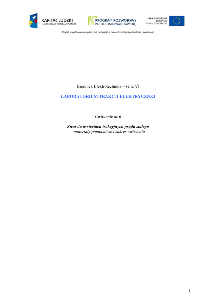 Projekt współfinansowany przez Unię Europejską w ramach Europejskiego Funduszu Społecznego Kierunek Elektrotechnika – sem. VI LABORATORIUM TRAKCJI ELEKTRYCZNEJ Ćwiczenie nr 6 Zwarcia w sieciach trakcyjnych prądu stałego - materiały pomocnicze i zakres ćwiczenia 1 Projekt współfinansowany przez Unię Europejską w ramach Europejskiego Funduszu Społecznego Cel ćwiczenia: Zapoznanie się z zagadnieniami związanymi ze zjawiskami zwarciowymi w sieciach trakcyjnych prądu stałego oraz metodami obliczania prądów zwarciowych. Przeprowadzenie obliczeń prądów zwarć i wpływu poszczególnych parametrów na ich wartości. Dobór nastaw w.sz.. Wyznaczenie stałych czasowych narastania prądu w obwodzie zwarcia. 1. Wstęp W układzie zasilania trakcji elektrycznej prądu stałego można wyodrębnić trzy obwody charakteryzujące się specyficznymi warunkami pracy i parametrami elektrycznymi. Obwód pierwszy stanowi część zasilającego systemu elektroenergetycznego prądu przemiennego (źródła energii, sieci rozdzielcze, linie zasilające podstacje trakcyjne), obwód drugi obejmuje przekształtnikową podstację trakcyjną przetwarzającą energię prądu przemiennego na energię prądu stałego (transformator, prostownik, filtry wygładzające), zaś obwód trzeci, pełni rolę sieci rozdzielczej prądu stałego doprowadzającej energię prądu stałego do elektrycznych pojazdów trakcyjnych (rozdzielnia prądu stałego, sieć trakcyjna). Rys.1 Schemat dostawy energii elektrycznej do pojazdów trakcyjnych w systemie prądu stałego 3kV DC. Źródłem zasilania podstacji trakcyjnych jest system elektroenergetyczny (1). Podstacje trakcyjne PKP są zasilane napięciem 15, 20, 30 lub 110 kV. W innych krajach są stosowane również napięcia 10, 35, 66 i 132 kV. Dla warunków zasilania podstacji trakcyjnych istotna jest moc zwarciowa w stacji energetycznej zasilającej podstację trakcyjną oraz poziom napięcia zasilającego podstację. Linie zasilające (2) w zależności od lokalizacji podstacji względem stacji energetycznej mają długość od 0.1 km (stacja energetyczna przy podstacji) do ok. 20 km, mogą być wykonane jako napowietrzne, kablowe lub napowietrzne - kablowe, a ich przekrój wynosi najczęściej od 70 do 240 mm2. Rozdzielnia prądu przemiennego (3) składa się przeważnie z następujących pól: dopływowych (linii zasilających), linii potrzeb nietrakcyjnych, zespołów prostownikowych, potrzeb własnych, sprzęgła. W polach znajdują się z zależności od potrzeb wyłączniki prądu zasilania powoduje automatyczne wyłączenie wyłącznika w drugim obiekcie zasilania). Po wyłączeniu nadprądowym lub uzależnionym następuje próba linii i w przypadku jej pozytywnego wyniku - samoczynne ponowne załączenie wyłącznika. Zostanie to szerzej opisane w dalszej części pracy. Poprzez kable zasilaczy (9) lub zasilacze napowietrzne prąd płynie od wyłączników szybkich do sieci trakcyjnej. Po obu stronach kabla zasilacza tj. zarówno od strony wyłącznika szybkiego jak i 2 Projekt współfinansowany przez Unię Europejską w ramach Europejskiego Funduszu Społecznego od strony sieci trakcyjnej znajdują się ograniczniki przepięć. Sieć trakcyjna (10) składa się z sieci górnej i powrotnej (szyn kolejowych). Poprzez sieć trakcyjną prąd jest doprowadzany do pojazdów trakcyjnych (11). Szyny kolejowe są połączone kablami powrotnymi z szyną minusową podstacji (rys. 2). Do szyny minusowej są przyłączone bieguny „-" prostowników. Przy szynie minusowej znajduje się urządzenie ochrony ziemnozwarciowej Efektywność wyłączania zwarć i trwałość wyłącznika szybkiego zależy od zdolności ograniczenia prądu zwarciowego. Na zdolność tą, z kolei wpływa typ konstrukcji mechanicznej (czas własny) wyłącznika oraz skuteczność przerywania łuku elektrycznego (układ gaszenia łuku – cewka i komora). Dodatkowym elementem ograniczającym wartość przerywanego przez wyłącznik szybki prądu jest dławik urządzenia wygładzającego zmniejszający stromość narastania prądu płynącego w obwodzie zwarciowym. Wpływ dławika na jakość przebiegu prądu zwarcia jest szczególnie istotny przy zwarciach bliskich, gdy indukcyjność pętli zwarcia stanowią wyłącznie reaktancje obwodu zasilającego i transformatorów prostownikowych o niewielkich wartościach (przeliczonych do poziomu napięcia wyprostowanego) w stosunku do indukcyjności sieci trakcyjnej (rys. 3). W przypadku niezadziałania wyłącznika szybkiego przy zwarciu w sieci trakcyjnej lub wystąpienia zwarcia w obwodzie podstacji trakcyjnej (prostownika, szyn zbiorczych prądu stałego czy w obwodzie filtru bez bezpiecznika) wyłączenia obwodu spod napięcia dokonuje jeden z właściwych dla układu zasilania wyłączników mocy (WM) po stronie prądu przemiennego. Pobudzenie do otwarcia styków wyłącznika mocy jest inicjowane przez obwody wyzwalaczy pośrednich (bezzwłoczne lub zwłoczne) albo z opóźnieniem przez układy zabezpieczeń (ziemnozwarciowe, podnapięciowe). Rys.2 Schemat połączeń urządzeń elektrycznych w podstacji trakcyjnej 3kV DC. Do ważniejszych problemów związanych z funkcjonowaniem podstacji trakcyjnych i kabin sekcyjnych należą: - przepięcia łączeniowe, - powstawanie zwarć i ich wyłączanie; chodzi podstawowe o zwarcia w obwodach stałoprądowych, - eksploatacja wyłączników szybkich (w.sz.) prądu stałego. 3 Projekt współfinansowany przez Unię Europejską w ramach Europejskiego Funduszu Społecznego Powyższe problemy sprowadzają się ogólnie do procesu wyłączania zwarć i dużych prądów roboczych w obwodach prądu stałego. Ponieważ w obwodach zasilanych napięciem stałym prąd nie przechodzi w sposób naturalny przez zero, jego wyłączanie, tj. doprowadzenie do wartości zerowej, musi być wymuszone. Stosuje się w tym celu następujące metody: - zwiększanie rezystancji łuku wyłączeniowego poprzez jego wydł