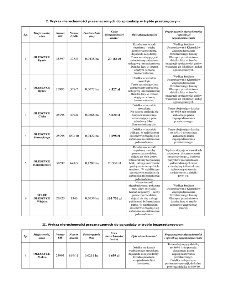 I. Wykaz nieruchomości przeznaczonych do sprzedaży w trybie przetargowym Lp. 1 2 3 4 5 6 Miejscowość, ulica OLESZYCE Rynek OLESZYCE Rynek OLESZYCE Cicha OLESZYCE Słowackiego OLESZYCE Konopnickiej STARE OLESZYCE Wiejska Numer KW 38897 25995 25995 25995 30597 26923 Numer działki 378/5 378/7 492/8 650/10 641/5 1346 Powierzchnia (ha) 0,0438 ha 0,0072 ha 0,0268 ha 0,0422 ha 0,1287 ha 0,7030 ha Przeznaczenie nieruchomości i sposób jej zagospodarowania Cena nieruchomości (netto) Opis nieruchomości 20 166 zł Działka ma kształt regularny – cechy geometryczne dobre, dojazd do niej dobry. Teren sąsiadujący jest zabudowany zabudową usługową i mieszkaniową. Działka leży w terenie objętym ochroną konserwatorską. 4 527 zł Działka w kształcie prostokąta. Teren sąsiadujący jest zabudowany zabudową usługową i mieszkaniową. Działka leży w terenie objętym ochroną konserwatorską. Według Studium Uwarunkowań i Kierunków Zagospodarowania Przestrzennego Gminy Oleszyce przedmiotowa działka leży w Strefie integracji społeczności gminy wskazana do lokalizacji usług ogólnogminnych. 5 820 zł Działka w kształcie prostokąta. Na działce znajduje się budynek murowany, wolnostojący o pow. zabudowy 34m2 . Stan techniczny zły. Teren obejmujący działkę nr 492/8 nie posiada aktualnego planu zagospodarowania przestrzennego. 3 698 zł Działka w kształcie trójkąta. W najbliższym sąsiedztwie znajduje się zabudowa mieszkaniowa jednorodzinna. Teren obejmujący działkę nr 650/10 nie posiada aktualnego planu zagospodarowania przestrzennego. 20 530 zł 105 730 zł Działka ma kształt regularny – cechy geometryczne dobre, dojazd do nich dobry. Infrastruktury technicznej brak , istnieje możliwość podłączenia wszystkich mediów. W najbliższym sąsiedztwie znajduje się zabudowa mieszkaniowa jednorodzinna. Nieruchomość niezabudowana, położona przy ulicy Wiejskiej. Kształt regularny – cechy geometryczne dobre, dojazd do niej z drogi publicznej. Infrastruktura pełna. W najbliższym sąsiedztwie znajduje się zabudowa mieszkaniowa jednorodzinna. Według Studium Uwarunkowań i Kierunków Zagospodarowania Przestrzennego Gminy Oleszyce przedmiotowa działka leży w Strefie integracji społeczności gminy wskazana do lokalizacji usług ogólnogminnych. Wydana decyzja o warunkach zabudowy dla zamierzenia inwestycyjnego ,, Budowa budynków mieszkalnych , jednorodzinnych wraz z niezbędną infrastrukturą techniczną na terenie wydzielonym z działki nr 641/1. Według Studium Uwarunkowań i Kierunków Zagospodarowania Przestrzennego Gminy Oleszyce przedmiotowa działka leży w strefie zabudowy zagrodowej zwartej. II. Wykaz nieruchomości przeznaczonych do sprzedaży w trybie bezprzetargowym Lp. 1 Miejscowość, ulica OLESZYCE Mokra Numer KW 25995 Numer działki 869/11 Powierzchnia (ha) 0,0211 ha Cena nieruchomości (netto) Opis nieruchomości Przeznaczenie nieruchomości i sposób jej zagospodarowania 1 639 zł Działka ma kształt wydłużonego prostokąta, dojazd do niej jest dobry. Działka położona w sąsiedztwie linii kolejowej. Teren obejmujący działkę nr 869/11 nie posiada aktualnego planu zagospodarowania przestrzennego. Działka nadaje się na poszerzenie posesji, do której przylega działka nr 869/10 III. Wykaz nieruchomości przeznaczonych do dzierżawy w trybie przetargowym na okres dziewięciu lat Lp. Numer działki Powierzchnia (ha) Położenie Przeznaczenie 1. 365/3 (część) 5,00 ha Stare Sioło rolnicze 2. 1052/27 0,23 ha Stare Sioło rolnicze 3. 1052/28 0,18 ha Stare Sioło rolnicze Cenę wywoławczą stanowić będzie równowartość stawki czynszu dzierżawnego za 1 ha gruntu przeznaczonego do użytkowania rolniczego, który wynosi 150,00 zł. IV. Wykaz nieruchomości przeznaczonych do dzierżawy w trybie bezprzetargowym na okres trzech lat Lp. Numer działki Powierzchnia (ha) Położenie Przeznaczenie 1. 504/4 (część) 3,45 ha Stare Oleszyce rolnicze 2. 2145 (część) 0,0230 ha Maślanki budowlne