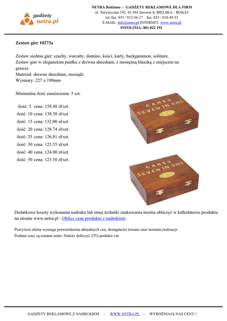 NETRA Reklama - GADŻETY REKLAMOWE DLA FIRM ul. Turystyczna 192, 43-384 Jaworze k/ BIELSKA - BIAŁEJ tel./fax: 033 / 812-56-17 fax: 033 / 810-49-33 E-MAIL: [email protected] INTERNET: www.netra.pl INFOLINIA: 801 022 192 Zestaw gier 10273a Zestaw siedmu gier: szachy, warcaby, domino, kości, karty, backgammon, solitaire. Zestaw gier w eleganckim puełku z drewna sheesham, z mosiężną blaszką z miejscem na grawer. Materiał: drewno sheesham, mosiądz Wymiary: 227 x 190mm Minimalna ilość zamówienia: 5 szt. ilość: 5 cena: 158.48 zł/szt. ilość: 10 cena: 138.58 zł/szt. ilość: 15 cena: 132.00 zł/szt. ilość: 20 cena: 128.74 zł/szt. ilość: 25 cena: 126.81 zł/szt. ilość: 30 cena: 125.55 zł/szt. ilość: 40 cena: 124.00 zł/szt. ilość: 50 cena: 123.10 zł/szt. Dodatkowe koszty wykonania nadruku lub innej techniki znakowania można obliczyć w kalkulatorze produktu na stronie www.netra.pl - Oblicz cenę produktu z nadrukiem Powyższa oferta wymaga potwierdzenia aktualnych cen, dostępności towaru oraz terminu realizacji. Podane ceny są cenami netto. Należy doliczyć 23% podatku vat. GADŻETY REKLAMOWE Z NADRUKIEM - WWW.NETRA.PL - WYRÓŻNIAJĄ NAS CENY !