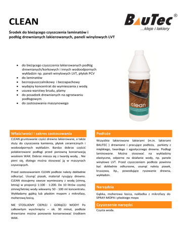 CLEAN Środek do bieżącego czyszczenia laminatów i podłóg drewnianych lakierowanych, paneli winylowych LVT do bieżącego czyszczenia lakierowanych podłóg drewnianych/korkowych i innych wodoodpornych wykładzin np. paneli winylowych LVT, płytek PCV do laminatów bezrozpuszczalnikowy i bezzapachowy wydajny koncentrat do wymieszania z wodą usuwa warstwy brudu, plamy do posadzek drewnianych na ogrzewaniu podłogowym do zastosowania maszynowego Właściwości i zakres zastosowania CLEAN gruntowanie czyści drewno lakierowane, a także służy do czyszczenia kamienia, płytek ceramicznych i wodoodpornych wykładzin. Bardzo dobrze czyścić polakierowane podłogi przed ponowną konserwacją woskiem WAX. Dobrze miesza się z twardą wodą. . Nie pieni się, dlatego można stosować ją w maszynach czyszczących. Przed zastosowaniem CLEAN podłoże należy dokładnie odkurzyć. Usunąć piasek, materiał rysujący drewno. CLEAN stosujemy zawsze wymieszany z wodą (zimną, letnią) w proporcji 1:100 - 1:200. Do 10 litrów czystej zimnej/letniej wody wlewamy 50 - 100 ml koncentratu. Wykładamy gąbką lub płaskim mopem z mikrofazy, moherową łasicą. NIE STOSUJEMY CIEPŁEJ i GORĄCEJ WODY! Po całkowitym wyschnięciu – ok. 30 minut, podłoże drewniane można ponownie konserwować środkiem WAX. Podłoże Wszystkie lakierowane lakierami (m.in. lakierami BAUTEC ) drewniane i pracujące podłoża, parkiety z miękkiego, twardego i egzotycznego drewna. Podłogi laminowane. Można stosować na wykładziny elastyczne, odporne na działanie wody, np. panele winylowe LVT. Przed czyszczeniem podłoże powinno być dokładnie odkurzone, usunąć należy piasek, kruszywa, itp., powodujące rysowanie drewna, wykładzin. Narzędzia Gąbka, moherowa łasica, nakładka z mikrofazy do SPRAY-MOPA i płaskiego mopa Czyszczenie narzędzi Czysta woda. Czas schnięcia przypadku utrzymywania się działania drażniącego na oczy: Zasięgnąć porady / zgłosić się pod opiekę lekarza. Chodzi o wartości przybliżone, zależne od temperatury P501 Zawartość / pojemnik usuwać zgodnie z pomieszczenia, temperatury podłoża, wilgotności podłoża i od przepisami miejscowymi / regionalnymi / narodowymi wilgotności względnej powietrza. Niska temperatura, / międzynarodowymi. podwyższona wilgotność względna powietrza, złe wietrzenie wydłużają lub skracają czas schnięcia. Ważne wskazówki Dane techniczne Skład: Mniej niż 5% niejonowych środków powierzchniowo czynnych, ok. 15% anionowych środków powierzchniowo czynnych, środki dyspergujące, olejek zapachowy Kolor: bezbarwny Konsystencja: płynna Usuwanie: Nie wylewać do kanalizacji, płynne resztki zabezpieczyć i utylizować jako odpad niebezpieczny. Powyższe dane przygotowanie i zastosowanie produktu oparto na naszej wiedzy i doświadczeniu. Niższe temperatury wydłużają czasy zastosowań, a wyższe skracają. Z powodu różnych niezależnych od nas czynników np. nietypowe podłoża, warunki zewnętrzne, jakość pracy, zalecamy przeprowadzenie własnych prób aby stwierdzić, czy nasz produkt nadaje się do danego postępowania. Firma Bautec Polska nie ponosi odpowiedzialności z tego powodu. Przed użyciem należy zapoznać się z instrukcją techniczną i kartą należy zapoznać się z instrukcją techniczną i kartą charakterystyki produktu. Prace należy wykonywać zgodnie z zasadami BHP. Aktualizacja 22.01.2015 Temperatura stosowania: od +10°C do +27°C Zużycie przy 1 warstwie koncentrat ok. 1 ml-2 ml na m2 Czas schnięcia: ok. 30 minut Stosowanie Mieszać z wodą 1:100 1:50 Składowanie temp. powyżej +5°C Magazynowanie 24 miesiące w suchych i chłodnych pomieszczeniach, w szczelnym opakowaniu. Bezpieczeństwo i ochrona H319 Działa drażniąco na oczy. P102 Chronić przed dziećmi. P280 Stosować rękawice ochronne / odzież ochronną / ochronę oczu / ochronę twarzy. P305+P351+P338 W PRZYPADKU DOSTANIA SIĘ DO OCZU: Ostrożnie płukać wodą przez kilka minut. Wyjąć soczewki kontaktowe, jeżeli są i można je łatwo usunąć. Nadal płukać. P337+P313 W BAUTEC POLSKA SP. Z O.O. UL. TURNIEJOWA 8, 53-014 WROCŁAW TEL./FAX 71 796 26 02, +48 722-142-403 www.bautec.pl * [email protected]