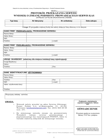 Zaù¹cznik do umowy dealerskiej / umowy z Przedstawicielem Regionalnym – Protokóù Przekazania Serwisu DATA.:........................................... PROTOKÓ£ PRZEKAZANIA SERWISU WNIOSEK O ZMIANÆ PODMIOTU PROWADZ¥CEGO SERWIS KAS (WYPE£NIà CZYTELNIE DRUKOWANYMI LITERAMI) Typ kasy Nr fabryczny Nr unikatowy Data zakupu Uwaga: W przypadku wiêkszej liczby kas nale¿y doù¹czyã listê zbiorcz¹ z w/w danymi. DANE FIRMY PRZEKAZUJ¥CEJ PROWADZENIE SERWISU: Nazwa firmy: Adres firmy: NIP: Telefon: e-mail: DANE FIRMY PRZEJMUJ¥CEJ PROWADZENIE SERWISU: Nazwa firmy: Adres firmy: NIP: Telefon: e-mail: URZ¥D SKARBOWY (wùaœciwy dla miejsca instalacji kasy rejestruj¹cej): Urz¹d Skarbowy: Adres: Telefon: Fax: DANE IDENTYFIKACYJNE UÝYTKOWNIKA: Nazwa firmy: Adres firmy: Telefon: NIP: Adres u¿ytkowania kasy: Fax: e-mail: Telefon: Przyczyny zmiany serwisu: UW AG A: 1. 2. W nio s e k na le ¿ y p r ze sùa ã na ad r e s S er wi s u Gùó wn e go : P o sn et P o l s ka S. A ul .M u n ic yp a l na 3 3 , 0 2 -2 8 1 W ar sz a wa ( [email protected]) , f a x. ( 0 2 2 ) 8 6 8 6 8 8 8 we w. 2 5 1 . Do ni n iej s ze go wn io s k u s to s uj e s iê p o st a n o wie n ia W ar u n kó w z mi a n y ser wi s u g wa r a nc y j ne go i p o g war a n c yj ne go ka s r e j estr uj ¹c yc h P O S NE T , k tó r e to wa r u n ki s ta no wi ¹ za ù¹c z ni k d o ni n iej s ze go wn io s k u. ........ ...... ...... ...... ...... ... ........ .... p o d m io t d o t yc h cz a s p r o wad z¹ c y ser w is ( p r z y j mu jê d o w ia d o mo œc i) . ...... ...... ... ........ ...... ...... ..... Podpis i p ieczêã fir my pr zejmu j¹cej serw is 1 Podpisanie oœwiadczenia usprawni wystawienie faktury VAT. ----------------------------OÚWIADCZENIE Wyra¿am zgodê na wystawienie faktury VAT bez podpisu. .......................................... Podpis i piecz¹tka u¿ytkownika kasy (Podaã dane do wystawienia faktury) Zaù¹cznik do umowy dealerskiej / umowy z Przedstawicielem Regionalnym – Protokóù Przekazania Serwisu Warunki Zmiany Serwisu Gwarancyjnego i Pogwarancyjnego Kas Rejestruj¹cych POSNET Zgodnie z Rozporz¹dzeniem Ministra Finansów z dnia 14 marca 2013 r. w sprawie kas rejestruj¹cych zmiana podmiotu prowadz¹cego serwis kas rejestruj¹cych nie wynikaj¹ca z naruszenia warunków jego prowadzenia mo¿e byã dokonana na wniosek podatnika za zgod¹ podmiotu prowadz¹cego serwis gùówny (producenta). U¿ytkownik kasy rejestruj¹cej ma równie¿ prawo ¿¹daã zmiany podmiotu prowadz¹cego serwis kas w przypadku nie przestrzegania przez podmiot dotychczas prowadz¹cy serwis kas warunków jego prowadzenia, wynikaj¹cych z wy¿ej wskazanego Rozporz¹dzenia Ministra Finansów. W ka¿dym przypadku zmiany podmiotu prowadz¹cego serwis kas o dokonanej zmianie podatnik zawiadamia wùaœciwego naczelnika urzêdu skarbowego w terminie 7 dni od jej dokonania, stosownie do § 14 ust. 3 wy¿ej wskazanego rozporz¹dzenia. Maj¹c powy¿sze na uwadze, ustala siê nastêpuj¹ce zasady zmiany podmiotu prowadz¹cego serwis gwarancyjny i pogwarancyjny kas rejestruj¹cych produkcji POSNET (dalej tak¿e „kasa”, a w liczbie mnogiej „kasy”): 1. Zmiana podmiotu prowadz¹cego serwis kasy/kas nastêpuje na pisemny wniosek u¿ytkownika kasy/kas. 2. Podmiot przejmuj¹cy obsùugê kasy/kas musi: a) byã stron¹ umowy dealerskiej (lub innej umowy upowa¿niaj¹cej do prowadzenia serwisu kas) z POSNET Polska S.A. i w sposób nale¿yty wypeùniaã jej postanowienia w zakresie sprawowania obsùugi serwisowej kas rejestruj¹cych POSNET, b) posiadaã przeszkolonych dwóch pracowników z aktualnymi, nadanymi przez POSNET Polska S.A. upowa¿nieniami do sprawowania serwisu kas rejestruj¹cych POSNET. 3. U¿ytkownik kasy/kas powinien: a) zùo¿yã u podmiotu, który przej¹ã ma prowadzenie serwisu kasy/kas pisemny, adresowany do POSNET Polska S.A. wniosek o zmianê podmiotu prowadz¹cego serwis kasy/kas, zawieraj¹cy oznaczenie kasy/kas objêtych wnioskiem, b) podaã we wniosku uzasadnienie dla postulatu zmiany podmiotu prowadz¹cego serwis kasy/kas objêtej/objêtych wnioskiem, c) niezwùocznie poinformowaã podmiot dotychczas prowadz¹cy serwis kasy/kas o decyzji jego zmiany i zùo¿eniu wniosku, o którym mowa w pkt. a)–b) powy¿ej. Ponadto, w celu zapewnienia pùynnego i zgodnego z dobrymi obyczajami procesu zmiany podmiotu serwisuj¹cego kasy, wskazuje siê, ¿e U¿ytkownik powinien posiadaã uregulowane zobowi¹zania wobec podmiotu dotychczas prowadz¹cego serwis kasy/kas (dotyczy usùug serwisowych zwi¹zanych z kas¹ rejestruj¹c¹ wskazan¹ /kasami rejestruj¹cymi wskazanymi we wniosku). Rekomenduje siê równie¿, aby U¿ytkownik uzyskaù pisemn¹ zgodê na przejêcie zobowi¹zañ gwarancyjnych (o ile s¹ w dniu zùo¿enia wniosku wa¿ne) dotychczasowego podmiotu prowadz¹cego serwis kasy/kas przez podmiot przejmuj¹cy prowadzenie serwisu kasy/kas objêtych wnioskiem U¿ytkownika. 4. Wniosek, o którym mowa w pkt. 3 powy¿ej, celem jego szybkiego rozpatrzenia przez POSNET Polska S.A., powinien byã opatrzony podpisem i pieczêci¹ podmiotu dotychczas prowadz¹cego serwis kasy/kas, podmiotu przejmuj¹cego serwis oraz wnioskuj¹cego o zmianê serwisu podatnika. Brak któregoœ z w/w podpisów lub pieczêci wydùu¿y proces wydania przez POSNET Polska S.A. decyzji, który w takim wypadku mo¿e trwaã do 14 dni. 5. O pozytywnym lub negatywnym rozpatrzeniu wniosku u¿ytkownika kasy/kas, POSNET Polska S.A. poinformuje podmiot przejmuj¹cy prowadzenie serwisu kas/kasy oraz podmiot, który dotychczas prowadziù serwis tego urz¹dzenia/ tych urz¹dzeñ, na piœmie lub drog¹ elektroniczn¹. W przypadku pozytywnego rozpatrzenia przez POSNET Polska S.A. wniosku U¿ytkownika kasy/kas, u¿ytkownik jest zobowi¹zany do pokrycia kosztów poniesionych przez POSNET Polska S.A. w zwi¹zku ze zmian¹ podmiotu prowadz¹cego serwis kasy/kas, w kwocie nie wiêkszej jednak ni¿ 150 PLN + VAT, za ka¿d¹ kasê, której dotyczy zmiana podm