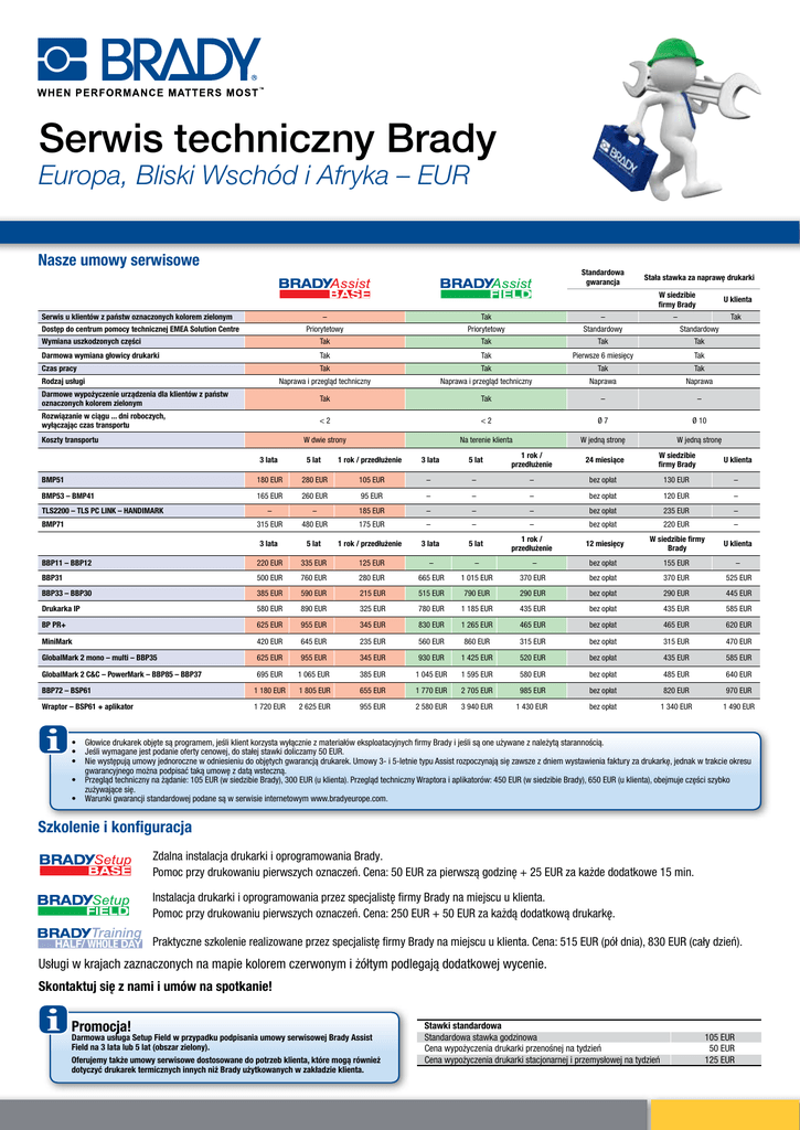 Serwis techniczny Brady Europa, Bliski Wschód i Afryka – EUR Nasze umowy serwisowe Standardowa gwarancja Serwis u klientów z państw oznaczonych kolorem zielonym Dostęp do centrum pomocy technicznej EMEA Solution Centre – Tak – Priorytetowy Priorytetowy Standardowy Stała stawka za naprawę drukarki W siedzibie firmy Brady U klienta – Tak Standardowy Wymiana uszkodzonych części Tak Tak Tak Tak Darmowa wymiana głowicy drukarki Tak Tak Pierwsze 6 miesięcy Tak Czas pracy Tak Tak Tak Tak Naprawa i przegląd techniczny Naprawa i przegląd techniczny Naprawa Naprawa Darmowe wypożyczenie urządzenia dla klientów z państw oznaczonych kolorem zielonym Tak Tak – – Rozwiązanie w ciągu ... dni roboczych, wyłączając czas transportu <2 <2 Ø7 Ø 10 W dwie strony Na terenie klienta Rodzaj usługi Koszty transportu W jedną stronę W jedną stronę 3 lata 5 lat 1 rok / przedłużenie 3 lata 5 lat 1 rok / przedłużenie 24 miesiące W siedzibie firmy Brady BMP51 180 EUR 280 EUR 105 EUR – – – bez opłat 130 EUR – BMP53 – BMP41 165 EUR 260 EUR 95 EUR – – – bez opłat 120 EUR – – – 185 EUR – – – bez opłat 235 EUR – 315 EUR 480 EUR 175 EUR – – – bez opłat 220 EUR – 3 lata 5 lat 1 rok / przedłużenie 3 lata 5 lat 1 rok / przedłużenie 12 miesięcy W siedzibie firmy Brady U klienta BBP11 – BBP12 220 EUR 335 EUR 125 EUR – – – bez opłat 155 EUR – BBP31 500 EUR 760 EUR 280 EUR 665 EUR 1 015 EUR 370 EUR bez opłat 370 EUR 525 EUR BBP33 – BBP30 385 EUR 590 EUR 215 EUR 515 EUR 790 EUR 290 EUR bez opłat 290 EUR 445 EUR Drukarka IP 580 EUR 890 EUR 325 EUR 780 EUR 1 185 EUR 435 EUR bez opłat 435 EUR 585 EUR BP PR+ 625 EUR 955 EUR 345 EUR 830 EUR 1 265 EUR 465 EUR bez opłat 465 EUR 620 EUR MiniMark 420 EUR 645 EUR 235 EUR 560 EUR 860 EUR 315 EUR bez opłat 315 EUR 470 EUR GlobalMark 2 mono – multi – BBP35 625 EUR 955 EUR 345 EUR 930 EUR 1 425 EUR 520 EUR bez opłat 435 EUR 585 EUR GlobalMark 2 C&C – PowerMark – BBP85 – BBP37 695 EUR 1 065 EUR 385 EUR 1 045 EUR 1 595 EUR 580 EUR bez opłat 485 EUR 640 EUR BBP72 – BSP61 1 180 EUR 1 805 EUR 655 EUR 1 770 EUR 2 705 EUR 985 EUR bez opłat 820 EUR 970 EUR Wraptor – BSP61 + aplikator 1 720 EUR 2 625 EUR 955 EUR 2 580 EUR 3 940 EUR 1 430 EUR bez opłat 1 340 EUR 1 490 EUR TLS2200 – TLS PC LINK – HANDIMARK BMP71 U klienta • G łowice drukarek objęte są programem, jeśli klient korzysta wyłącznie z materiałów eksploatacyjnych firmy Brady i jeśli są one używane z należytą starannością. • Jeśli wymagane jest podanie oferty cenowej, do stałej stawki doliczamy 50 EUR. • Nie występują umowy jednoroczne w odniesieniu do objętych gwarancją drukarek. Umowy 3- i 5-letnie typu Assist rozpoczynają się zawsze z dniem wystawienia faktury za drukarkę, jednak w trakcie okresu gwarancyjnego można podpisać taką umowę z datą wsteczną. • Przegląd techniczny na żądanie: 105 EUR (w siedzibie Brady), 300 EUR (u klienta). Przegląd techniczny Wraptora i aplikatorów: 450 EUR (w siedzibie Brady), 650 EUR (u klienta), obejmuje części szybko zużywające się. • Warunki gwarancji standardowej podane są w serwisie internetowym www.bradyeurope.com. Szkolenie i konfiguracja Zdalna instalacja drukarki i oprogramowania Brady. Pomoc przy drukowaniu pierwszych oznaczeń. Cena: 50 EUR za pierwszą godzinę + 25 EUR za każde dodatkowe 15 min. Instalacja drukarki i oprogramowania przez specjalistę firmy Brady na miejscu u klienta. Pomoc przy drukowaniu pierwszych oznaczeń. Cena: 250 EUR + 50 EUR za każdą dodatkową drukarkę. Training HALF/ WHOLE DAY Praktyczne szkolenie realizowane przez specjalistę firmy Brady na miejscu u klienta. Cena: 515 EUR (pół dnia), 830 EUR (cały dzień). Usługi w krajach zaznaczonych na mapie kolorem czerwonym i żółtym podlegają dodatkowej wycenie. Skontaktuj się z nami i umów na spotkanie! Promocja! Darmowa usługa Setup Field w przypadku podpisania umowy serwisowej Brady Assist Field na 3 lata lub 5 lat (obszar zielony). Oferujemy także umowy serwisowe dostosowane do potrzeb klienta, które mogą również dotyczyć drukarek termicznych innych niż Brady użytkowanych w zakładzie klienta. Stawki standardowa Standardowa stawka godzinowa Cena wypożyczenia drukarki przenośnej na tydzień Cena wypożyczenia drukarki stacjonarnej i przemysłowej na tydzień 105 EUR 50 EUR 125 EUR Centrum rozwiązań firmy Brady +44 333 333 1111 [email protected] Centrum napraw firmy Brady EMEA Adres do zwrotów: WH Brady nv Industriepark C/3 Lindestraat 7 9240 Zele Belgia Adres do zwrotów Turcja: Konaklar Mah. Selvili Sk. C13 Blok.8 Kat:3 Daire:5 34330 4.Levent-Besiktas Istanbul Brady EMEA – numery telefonów lokalnego wsparcia technicznego Pełna obsługa w językach poszczególnych krajów Austria Belgia Francja Holandia Irlandia Luksemburg Niemcy Szwajcaria Wielka Brytania 01 253 022 150 02 404 06 76 01 76 75 32 57 020 7091207 01 447 5269 +32 2 404 06 76 0302 215 3184 044 583 06 06 0208 865 0438 Czechy Dania Hiszpania Słowacja Szwecja Turcja Węgry Włochy 2 39 01 69 85 36 92 76 62 91 114 7460 02 3278 6671 08 566 425 38 0212 375 52 33 06 1 778 9513 02 36009972 Godziny pracy: Obsługa w języku angielskim/francuskim Poniedziałek–czwartek: 9:00–17:00 CET Piątek: 9:00–16:00 CET Estonia 622 5702 Finlandia 9 231 955 59 Norwegia 21 03 40 39 (obsługa częściowo w języku szwedzkim) Polska 22 295 37 00 Portugalia308803162 Rumunia 021 5291389 Pozostałe kraje +44 333 333 1111 Godziny pracy – Turcja: Poniedziałek–piątek: 8:00–16:00 GMT Europa Częściowa obsługa w języku danego kraju z dodatkową obsługą w języku angielskim/ francuskim Godziny pracy – Wielka Brytania: Poniedziałek–piątek: 8:00–16:00 GMT Dostępność programów BASE oraz FIELD Opłata za wezwanie do zakładu / wypożyczenie urządzeń – zawarte w pakiecie Dostępność programów FIELD z ograniczeniami Opłata za wezwanie do zakładu / wypożyczen