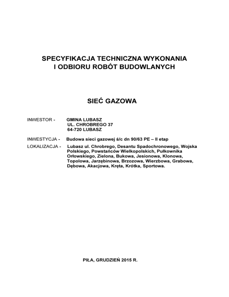 SPECYFIKACJA TECHNICZNA WYKONANIA I ODBIORU ROBÓT BUDOWLANYCH SIEĆ GAZOWA INWESTOR - GMINA LUBASZ UL. CHROBREGO 37 64-720 LUBASZ INWESTYCJA - Budowa sieci gazowej ś/c dn 90/63 PE – II etap LOKALIZACJA - Lubasz ul. Chrobrego, Desantu Spadochronowego, Wojska Polskiego, Powstańców Wielkopolskich, Pułkownika Orłowskiego, Zielona, Bukowa, Jesionowa, Klonowa, Topolowa, Jarzębinowa, Brzozowa, Wierzbowa, Grabowa, Dębowa, Akacjowa, Kręta, Krótka, Sportowa. PIŁA, GRUDZIEŃ 2015 R. SPIS TREŚCI 1. 2. 3. 4. 5. 6. 7. 8. 9. 10. str. Wstęp....................................................................................................... 3 Materiały .....................................................................................................3 Sprzęt .........................................................................................................4 Transport ....................................................................................................4 Wykonanie robót ........................................................................................ 4 Kontrola jakości robót .................................................................................6 Obmiar robót ...............................................................................................6 Odbiór robót .............................................................................................. 7 Podstawa płatności.................................................................................... 7 Przepisy związane ................ 7 2 1. Wstęp 1.1 Przedmiot ST Przedmiotem niniejszej Specyfikacji Technicznej są wymagania dotyczące wykonania i odbioru robót budowlanych sieci gazowej o zakresie: budowa sieci gazowej - gazociąg ś/c dn 90 PE - gazociąg ś/c dn 63PE 1.2. Zakres stosowania ST Specyfikacja Techniczna jest stosowana jako dokument przetargowy i kontraktowy przy zlecaniu i realizacji robót wymienionych w punkcie 1.1. 1.3. Zakres robót objętych ST W skład niniejszej części SST wchodzą następujące roboty: budowa odcinków gazociągów z rur polietylenowych: PE100 SDR 17,6 i PE100 RC SDR 17,6 w osłonie PP dn 90, PE100 SDR 11 i PE100 RC SDR 11 w osłonie PP dn 63. odcinki gazociągów: ś/c dn 90 PE o długości ca 1221 m, ś/c dn 63 PE o długości ca 4615 m. wykopy otwarte o gł. 1 m o dl ca 5496 m. przeciski / przewierty o dł. ca 370 m. Ilość robót została szczegółowo określona w przedmiarze robót. 2. MATERIAŁY Wymagania dotyczące materiałów i urządzeń. 2.1. Rury przewodowe Rodzaj rur, ich średnice zależne są od istniejących przewodów i zostały ustalone w wytycznych i projekcie budowlano-wykonawczym. Do wykonania sieci gazowej projektuje się następujące materiały: - rury PE 100 SDR 17,6 i PE 100 RC SDR 17,6 w osłonie PP dn 90 zgodne z normą PN-EN 1555-2:2012, - rury PE 100 SDR 11 i PE 100 RC SDR 11 w osłonie PP dn 63 zgodne z normą PN-EN 1555-2:2012, 2.2. Kształtki - kształtki PE 100 SDR 11 FRIALEN zgodne z normą PN-EN 1555-3:2012. 2.3. Kruszywo na podsypkę Podsypka pod rurociągi może być wykonana z piasku lub żwiru z gruntu rodzimego. Użyty materiał na podsypkę powinien odpowiadać wymaganiom norm: PN-86/B06712, PN-B-11111. 3 3. SPRZĘT Roboty montażowe związane z wykonaniem sieci gazowych realizowane będą przy użyciu następującego sprzętu mechanicznego: - żuraw budowlany samochodowy, - samochód dostawczy, - koparki, spycharki, - zagęszczarki, - zestawy do odwadniania wykopów, - samochód skrzyniowy, - samochód samowyładowczy, - zgrzewarki do rur PE, - spawarki 4. TRANSPORT Transport powinien zapewniać: - stabilność pozycji załadowywanych materiałów, - zabezpieczenie materiałów przed ich uszkodzeniem, - kontrolę załadunku i wyładunku, Rury należy przewozić w pozycji poziomej i zabezpieczyć przed przesuwaniem i przetaczaniem w czasie ruchu pojazdów. Przy przewozie należy przestrzegać przepisów obowiązujących w publicznym transporcie drogowym. Rury PE zarówno w odcinkach prostych, jaki i zwojach nie mogą być rzucane i przeciągane po podłożu, lecz muszą być przenoszone. 5. WYKONANIE ROBÓT 5.1. Ogólne warunki wykonania robót. Wykopy należy wykonać jako wykopy otwarte, w warstwach sypkich ukosowane. Metoda wykonania wykopu – 20% kubatury przy pomocy sprzętu mechanicznego, pozostałe 80% (z uwagi na strefy występowania infrastruktury podziemnej) – wykop ręczny. Szerokość wykopów min. Dz + 0,2m Urobek z wykopu dla wykonania sieci gazowej, wykonawca odrzuci od wykopu, pozostawiając przejście dla pracujących o szerokości min. 0,5 m. 5.2 Roboty przygotowawcze. Przed przystąpieniem do robót wykonawca dokona ich geodezyjnego wytyczenia i trwale oznaczy je w terenie za pomocą kołków. Wszystkie prace związane z obsługą geodezyjną tj. wyniesieniem projektu w terenie i inwentaryzacją powykonawczą inwestycji muszą być wykonane przez uprawnionego geodetę. Koszty obsługi geodezyjnej pokrywa w całości wykonawca robót. 5.3. Szczegółowe zasady wykonania robót. Projektuje się sieć gazową z rur z PE 100 i średnicach dn 90/63. Przy budowie sieci gazowej wykonawca powinien zapewnić utrzymanie osi projektowanej trasy zgodnie z projektem. Sieć gazową wykonać z rur PE łączonych za pomocą zgrzewania doczołowego 4 i elektrooporowego. Odcinki gazociągu układać w wykopie na odpowiednio przygotowanym podłożu naturalnym. Zmiany kierunku trasy w planie wykonać za pomocą kolan i łuków PE. Roboty montażowe sieci wykonywać zgodnie z wymaganiami normy PN- EN 12007-2:2013. Projektowane odcinki gazociągu należy układać równolegle do poziomu terenu Tak, aby zachować przykrycie min. 1 m. W przypadku kolizji z istniejącą infrastrukturą podziemną należy ją zabezpieczyć poprzez wykonanie podwieszeń. Na całej długości projektowanej sieci gazowej należy ułożyć przy gazociągu taśmę lokalizacyjną i nad gazociągiem taśmę ostrzega