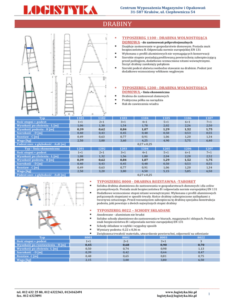 Centrum Wyposażenia Magazynów i Opakowań 31-587 Kraków, ul. Ciepłownicza 54 DRABINY TYPOSZEREG 1100 - DRABINA WOLNOSTOJĄCA DOMOWA - do zastosowań półprofesjonalnych Znajduje zastosowanie w gospodarstwie domowym. Posiada znak bezpieczeństwa B. Odpowiada normie europejskiej EN 131 Wykonana z profili aluminiowych nie wymagających konserwacji Szerokie stopnie posiadają profilowaną powierzchnię zabezpieczającą przed poślizgiem, dodatkowo wzmocnione nitami wewnętrznymi. Szczyt drabiny zamknięty pałąkiem Szeroki podest ułatwia swobodne stawanie na drabinie. Podest jest dodatkowo wzmocniony włóknem węglowym TYPOSZEREG 1200 - DRABINA WOLNOSTOJĄCA DOMOWA – linia ekonomiczna Drabina do zastosowań domowych Praktyczna półka na narzędzia Hak do zawieszenia wiadra Typ Ilość stopni + podest Wysokość po złożeniu - L [m] Wysokość podestu - H [m] Szerokość - D [m] Rozstaw - C [m] Waga [kg] Podest szer. x głębokość - AxB [m] 1101 1+1 1,06 0,39 0,40 0,49 2,50 1102 2+1 1,30 0,62 0,43 0,63 3,00 1103 3+1 1,54 0,84 0,45 0,77 3,60 1104 4+1 1,78 1,07 0,48 0,91 4,25 0,27 x 0,25 1105 5+1 2,02 1,29 0,50 1,06 4,90 1106 6+1 2,26 1,52 0,53 1,20 5,75 1107 7+1 2,50 1,75 0,55 1,34 6,40 Typ – linia ekonomiczna Ilość stopni + podest Wysokość po złożeniu - L [m] Wysokość podestu - H [m] Szerokość - D [m] Rozstaw - C [m] Waga [kg] Podest szer. x głębokość - AxB [m] 1201 1+1 1,08 0,39 0,40 0,49 2,50 1202 2+1 1,32 0,62 0,43 0,63 3,20 1203 3+1 1,56 0,84 0,45 0,77 3,80 1204 4+1 1,80 1,07 0,48 0,91 4,50 0,27 x 0,25 1205 5+1 2,04 1,29 0,50 1,06 5,15 1206 6+1 2,28 1,52 0,53 1,20 5,85 1207 7+1 2,52 1,75 0,55 1,34 6,50 Typ Ilość stopni + podest Wysokość po rozstawieniu - H [m] Wysokość po złożeniu -L [m] Szerokość - D [m] Rozstaw -C [m] Waga [kg] tel. 012 632 25 80, 012 6322363, 0124162491 fax. 012 6323091 8001 1+1 0,45 0,50 0,39 0,48 2,15 TYPOSZEREG 8000 - DRABINA ROZSTAWNA -TABORET Solidna drabina aluminiowa do zastosowania w gospodarstwach domowych i dla celów przemysłowych. Posiada znak bezpieczeństwa B i odpowiada normie europejskiej EN 131 Dodatkowe wzmocnione stopni nitami wewnętrznymi. Wykonana z profili aluminiowych połączonych stopniami w sposób trwały. Końce drabiny zabezpieczone zaślepkami z tworzywa sztucznego. Przed rozsunięciem zabezpiecza tę drabinę specjalna konstrukcja podestu, jaki powstaje z dwóch najwyższych stopni drabiny TYPOSZEREG 8022 – SCHODY SKŁADANE Anodowane - aluminium nie brudzi Solidne schody aluminiowe do zastosowania w biurach, magazynach i sklepach. Posiada znak bezpieczeństwa B i odpowiada normie europejskiej EN 131 Schody składane w szybki i wygodny sposób Wymiary podestu: 0,22 x 0,36 m Zwiększona trwałość materiału, utwardzenie powierzchni, odporność na utlenianie 8002 8003 8022 2+1 3+1 3 0,68 0,90 0,70 0,74 0,98 1,13 0,42 0,44 0,47 0,65 0,81 0,75 3,00 3,80 6,50 www.logistyka.biz.pl [email protected] 1 Centrum Wyposażenia Magazynów i Opakowań 31-587 Kraków, ul. Ciepłownicza 54 DRABINY TYPOSZEREG 2000 - DRABINA OPIERALNA – wersja profesjonalna Anodowane - aluminium nie brudzi Bardzo stabilna jednoczęściowa drabina znajdująca zastosowanie zarówno w zakładach przemysłowych jak i gospodarstwach domowych Posiada znak bezpieczeństwa B i odpowiada normie europejskiej EN 131 Zwiększona trwałość materiału, utwardzenie powierzchni, odporność na utlenianie Kąt oparcia 650 – 750 Wykonana z zamkniętych profili aluminiowych nie wymagających konserwacji. Drabina wyposażona jest w szczeble o przekroju 25 x 30mm posiadające powierzchnię ryflowaną. Końce drabiny zabezpieczone stopkami z tworzywa sztucznego TYPOSZEREG 2300 - linia ekonomiczna do zastosowań półprofesjonalnych TYPOSZEREG 2100 - DRABINA OPIERALNA – wersja profesjonalna Kąt oparcia 650 – 750 wyposażona w stalowe przykręcane haki Anodowane - aluminium nie brudzi Zwiększona trwałość materiału, utwardzenie powierzchni, odporność na utlenianie Kąt oparcia 650 – 750 Typ Ilość szczebli Wysokość całkowita - L [m] Szerokość - D [m] Waga [kg] 2010 7 2,00 0,35 3,30 2001 9 2,65 0,35 4,25 2020 10 3,00 0,35 4,90 2002 12 3,50 0,43 6,95 2003 15 4,50 0,43 8,95 Typ – linia ekonomiczna Ilość szczebli Wysokość całkowita - L [m] Szerokość - D [m] Waga [kg] 2307 7 1,96 0,35 3,15 2309 9 2,52 0,35 4,10 2311 11 3,08 0,41 5,75 2312 12 3,36 0,41 6,25 - Typ - opieralna z hakiem Ilość szczebli Wysokość całkowita - L [m] Szerokość - D [m] Waga [kg] 2110 7 2,00 0,35 4,90 2101 9 2,65 0,35 5,90 2120 10 3,00 0,35 6,50 2102 12 3,50 0,43 8,55 2103 15 4,50 0,43 10,55 Typ Ilość szczebli Wysokość całkowita - H [m] Wysokość robocza – H1 [m] Szerokość - A [m] Waga [kg] S 1200/E 7 2,00 2,50 0,42 3,8 tel. 012 632 25 80, 012 6322363, 0124162491 fax. 012 6323091 SERIA S .../E – drabina opieralna profesjonalna Szczebel 30 x 30 mm, obciążenie max. 150 kg Drabina odpowiada normie europejskiej EN 131 S 1250/E 8 2,50 3,00 0,42 4,2 S 1300/E 10 3,00 3,50 0,42 5,0 S 1350/E 12 3,50 4,00 0,42 5,8 S 1400/E 14 4,00 4,50 0,42 6,6 S 1450/E 15 4,50 5,00 0,42 7,5 S 1500/E 17 5,00 5,50 0,42 10,4 www.logistyka.biz.pl [email protected] S 1550/E 19 5,50 6,00 0,42 11,3 2 Centrum Wyposażenia Magazynów i Opakowań 31-587 Kraków, ul. Ciepłownicza 54 DRABINY TYPOSZEREG 3000 - DRABINA DWUELEMENTOWA – wersja profesjonalna Anodowane - aluminium nie brudzi Możliwość użytkowania jako drabinę wolnostojącą lub opieralną Posiada znak bezpieczeństwa B i odpowiada normie europejskiej EN 131 Kąt oparcia 650 – 750 Zwiększona trwałość materiału, utwardzenie powierzchni, odporność na utlenianie Wykonana z lekkich, prostokątnych profili aluminiowych, nie wymagających konserwacji. Wysokość drabiny przestawiana ręcznie, w odstępach co szczebel (280mm). Końce drabiny zabezpieczają stopki z tworzywa sztucznego. Dolna część drabiny wyposażona jest dodatkowo w stabilizator poszerzający podstawę, co zwiększa w znacznym
