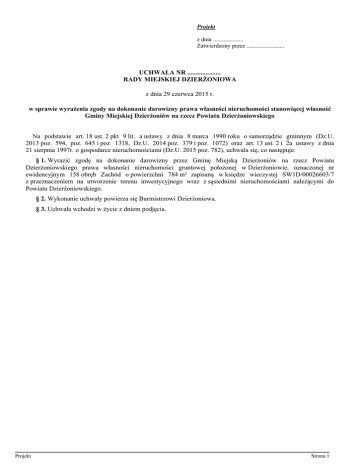 Projekt z dnia .................... Zatwierdzony przez ......................... UCHWAŁA NR .................... RADY MIEJSKIEJ DZIERŻONIOWA z dnia 29 czerwca 2015 r. w sprawie wyrażenia zgody na dokonanie darowizny prawa własności nieruchomości stanowiącej własność Gminy Miejskiej Dzierżoniów na rzecz Powiatu Dzierżoniowskiego Na podstawie art. 18 ust. 2 pkt 9 lit. a ustawy z dnia 8 marca 1990 roku o samorządzie gminnym (Dz.U. 2013 poz. 594, poz. 645 i poz. 1318, Dz.U. 2014 poz. 379 i poz. 1072) oraz art. 13 ust. 2 i 2a ustawy z dnia 21 sierpnia 1997r. o gospodarce nieruchomościami (Dz.U. 2015 poz. 782), uchwala się, co następuje: § 1. Wyrazić zgodę na dokonanie darowizny przez Gminę Miejską Dzierżoniów na rzecz Powiatu Dzierżoniowskiego prawa własności nieruchomości gruntowej położonej w Dzierżoniowie, oznaczonej nr ewidencyjnym 158 obręb Zachód o powierzchni 784 m2 zapisaną w księdze wieczystej SW1D/00026603/7 z przeznaczeniem na utworzenie terenu inwestycyjnego wraz z sąsiednimi nieruchomościami należącymi do Powiatu Dzierżoniowskiego. § 2. Wykonanie uchwały powierza się Burmistrzowi Dzierżoniowa. § 3. Uchwała wchodzi w życie z dniem podjęcia. Projekt Strona 1 UZASADNIENIE do projektu uchwały Rady Miejskiej Dzierżoniowa w sprawie wyrażenia zgody na dokonanie darowizny prawa własności nieruchomości na rzecz Powiatu Dzierżoniowskiego 1. Cel i przewidywane skutki podjęcia uchwały. Celem podjęcia uchwały jest wyrażenie zgody przez Radę Miejską Dzierżoniowa na dokonanie darowizny na rzecz Powiatu Dzierżoniowskiego nieruchomości opisanej jako działka gruntu nr 158 obręb Zachód o powierzchni 784 m2. Nieruchomość obecnie stanowi nieużytkowaną drogę i położona jest pomiędzy działkami nr 157 i 159 obręb Zachód należącymi do Powiatu Dzierżoniowskiego. Przekazanie przedmiotowej nieruchomości na rzecz Powiatu Dzierżoniowskiego pozwoli na racjonalne zagospodarowanie działek nr 157 i 159 obręb Zachód, które Uchwałą Nr XVII/124/11 z dnia 29 grudnia 2011r. powiększyły obszar Wałbrzyskiej Specjalnej Strefy Ekonomicznej. 2. Aktualny stan faktyczny i prawny. Przedmiotowa nieruchomość stanowi obecnie własność Gminy Miejskiej Dzierżoniów. 3. Różnice pomiędzy dotychczasowym, a projektowanym stanem prawnym. Obecnie działki 159 i 157 obręb Zachód o łącznej powierzchni 23 576 m2 należące do Powiatu Dzierżoniowskiego, objęte Wałbrzyską Specjalną Strefą Ekonomiczną, rozdziela działka drogowa nr 158 obręb Zachód należąca do Gminy Miejskiej Dzierżoniów. Po przekazaniu przedmiotowej działki na rzecz Powiatu Dzierżoniowskiego powstanie atrakcyjny teren inwestycyjny o łącznej powierzchni 24 360 m2. Działka objęta projektem uchwały położona jest na terenie objętego miejscowym planem zagospodarowania przestrzennego zatwierdzonego uchwałą Rady Miejskiej Dzierżoniowa Nr XVIII/124/99 z 18. października 1999r. i przeznaczona jest na cele produkcyjne, składowe, hurtowe oraz zaplecza budowlanego 4. Konsekwencje finansowe dla budżetu gminy. Nieruchomości zostanie przekazana na rzecz Powiatu Dzierżoniowskiego nieodpłatnie. 5. Rozdzielnik. 1. Odbiorcy wewnętrzni: a) KRM – 1 egz. b) PN – 1 egz. Projekt Strona 1