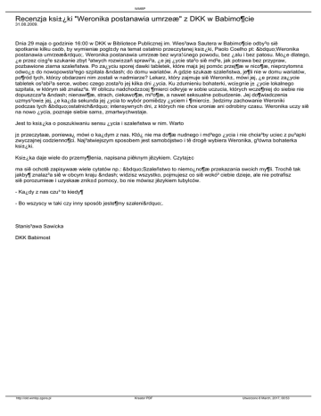 WiMBP Recenzja ksi±¿ki "Weronika postanawia umrzeæ" z DKK w Babimo¶cie 31.08.2009. Dnia 29 maja o godzinie 16:00 w DKK w Bibliotece Publicznej im. Wies³awa Sautera w Babimo¶cie odby³o siê spotkanie kilku osób, by wymieniæ pogl±dy na temat ostatnio przeczytanej ksi±¿ki, Paolo Coelho pt: „Weronika postanawia umrzeæ”. Weronika postanawia umrzeæ bez wyra¼nego powodu, bez ¿alu i bez patosu. Mo¿e dlatego, ¿e przez ci±g³e szukanie zbyt ³atwych rozwi±zañ sprawi³a, ¿e jej ¿ycie sta³o siê md³e, jak potrawa bez przypraw, pozbawione ziarna szaleñstwa. Po za¿yciu sporej dawki tabletek, które maj± jej pomóc przej¶æ w nico¶æ, nieprzytomn± odwo¿± do nowopowsta³ego szpitala – do domu wariatów. A gdzie szukaæ szaleñstwa, je¶li nie w domu wariatów, po¶ród tych, którzy obdarzeni nim zostali w nadmiarze? Lekarz, który zajmuje siê Weronik±, mówi jej, ¿e przez za¿ycie tabletek os³abi³a serce, wobec czego zosta³o jej kilka dni ¿ycia. Ku zdumieniu bohaterki, wci±gnie j± ¿ycie lokalnego szpitala, w którym siê znalaz³a. W obliczu nadchodz±cej ¶mierci odkryje w sobie uczucia, których wcze¶niej do siebie nie dopuszcza³a – nienawi¶æ, strach, ciekawo¶æ, mi³o¶æ, a nawet seksualne pobudzenie. Jej do¶wiadczenia uzmys³owi± jej, ¿e ka¿da sekunda jej ¿ycia to wybór pomiêdzy ¿yciem i ¶mierci±. ¦ledzimy zachowanie Weroniki podczas tych „ostatnich” intensywnych dni, z których nie chce uroniæ ani odrobiny czasu. Weronika uczy siê na nowo ¿ycia, poznaje siebie sam±, zmartwychwstaje. Jest to ksi±¿ka o poszukiwaniu sensu ¿ycia i szaleñstwa w nim. Warto j± przeczytaæ, poniewa¿ mówi o ka¿dym z nas. Któ¿ nie ma do¶æ nudnego i md³ego ¿ycia i nie chcia³by uciec z pu³apki zwyczajnej codzienno¶ci. Naj³atwiejszym sposobem jest samobójstwo i tê drogê wybiera Weronika, g³ówna bohaterka ksi±¿ki. Ksi±¿ka daje wiele do przemy¶lenia, napisana piêknym jêzykiem. Czytaj±c ma siê ochotê zapisywaæ wiele cytatów np.: „Szaleñstwo to niemo¿no¶æ przekazania swoich my¶li. Trochê tak jakby¶ znalaz³a siê w obcym kraju – widzisz wszystko, pojmujesz co siê wokó³ ciebie dzieje, ale nie potrafisz siê porozumieæ i uzyskaæ znik±d pomocy, bo nie mówisz jêzykiem tubylców. - Ka¿dy z nas czu³ to kiedy¶ - Bo wszyscy w taki czy inny sposób jeste¶my szaleni”. Stanis³awa Sawicka DKK Babimost http://old.wimbp.zgora.pl Kreator PDF Utworzono 8 March, 2017, 00:53