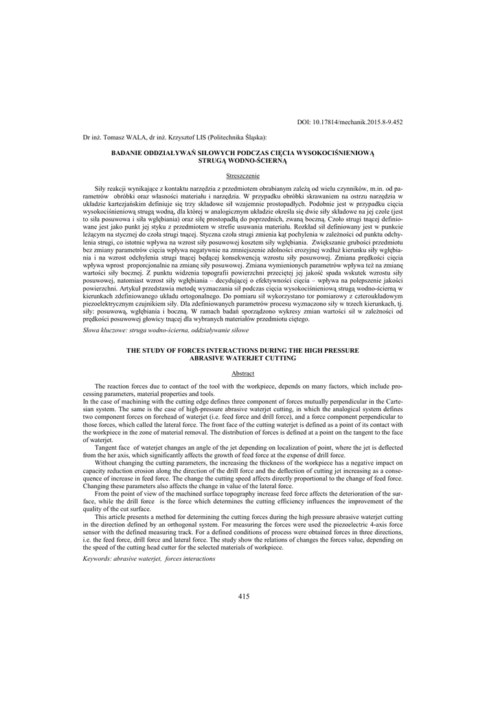 DOI: 10.17814/mechanik.2015.8-9.452 Dr inż. Tomasz WALA, dr inż. Krzysztof LIS (Politechnika Śląska): BADANIE ODDZIAŁYWAŃ SIŁOWYCH PODCZAS CIĘCIA WYSOKOCIŚNIENIOWĄ STRUGĄ WODNO-ŚCIERNĄ Streszczenie Siły reakcji wynikające z kontaktu narzędzia z przedmiotem obrabianym zależą od wielu czynników, m.in. od parametrów obróbki oraz własności materiału i narzędzia. W przypadku obróbki skrawaniem na ostrzu narzędzia w układzie kartezjańskim definiuje się trzy składowe sił wzajemnie prostopadłych. Podobnie jest w przypadku cięcia wysokociśnieniową strugą wodną, dla której w analogicznym układzie określa się dwie siły składowe na jej czole (jest to siła posuwowa i siła wgłębiania) oraz siłę prostopadłą do poprzednich, zwaną boczną. Czoło strugi tnącej definiowane jest jako punkt jej styku z przedmiotem w strefie usuwania materiału. Rozkład sił definiowany jest w punkcie leżącym na stycznej do czoła strugi tnącej. Styczna czoła strugi zmienia kąt pochylenia w zależności od punktu odchylenia strugi, co istotnie wpływa na wzrost siły posuwowej kosztem siły wgłębiania. Zwiększanie grubości przedmiotu bez zmiany parametrów cięcia wpływa negatywnie na zmniejszenie zdolności erozyjnej wzdłuż kierunku siły wgłębiania i na wzrost odchylenia strugi tnącej będącej konsekwencją wzrostu siły posuwowej. Zmiana prędkości cięcia wpływa wprost proporcjonalnie na zmianę siły posuwowej. Zmiana wymienionych parametrów wpływa też na zmianę wartości siły bocznej. Z punktu widzenia topografii powierzchni przeciętej jej jakość spada wskutek wzrostu siły posuwowej, natomiast wzrost siły wgłębiania – decydującej o efektywności cięcia – wpływa na polepszenie jakości powierzchni. Artykuł przedstawia metodę wyznaczania sił podczas cięcia wysokociśnieniową strugą wodno-ścierną w kierunkach zdefiniowanego układu ortogonalnego. Do pomiaru sił wykorzystano tor pomiarowy z czteroukładowym piezoelektrycznym czujnikiem siły. Dla zdefiniowanych parametrów procesu wyznaczono siły w trzech kierunkach, tj. siły: posuwową, wgłębiania i boczną. W ramach badań sporządzono wykresy zmian wartości sił w zależności od prędkości posuwowej głowicy tnącej dla wybranych materiałów przedmiotu ciętego. Słowa kluczowe: struga wodno-ścierna, oddziaływanie siłowe THE STUDY OF FORCES INTERACTIONS DURING THE HIGH PRESSURE ABRASIVE WATERJET CUTTING Abstract The reaction forces due to contact of the tool with the workpiece, depends on many factors, which include processing parameters, material properties and tools. In the case of machining with the cutting edge defines three component of forces mutually perpendicular in the Cartesian system. The same is the case of high-pressure abrasive waterjet cutting, in which the analogical system defines two component forces on forehead of waterjet (i.e. feed force and drill force), and a force component perpendicular to those forces, which called the lateral force. The front face of the cutting waterjet is defined as a point of its contact with the workpiece in the zone of material removal. The distribution of forces is defined at a point on the tangent to the face of waterjet. Tangent face of waterjet changes an angle of the jet depending on localization of point, where the jet is deflected from the her axis, which significantly affects the growth of feed force at the expense of drill force. Without changing the cutting parameters, the increasing the thickness of the workpiece has a negative impact on capacity reduction erosion along the direction of the drill force and the deflection of cutting jet increasing as a consequence of increase in feed force. The change the cutting speed affects directly proportional to the change of feed force. Changing these parameters also affects the change in value of the lateral force. From the point of view of the machined surface topography increase feed force affects the deterioration of the surface, while the drill force is the force which determines the cutting efficiency influences the improvement of the quality of the cut surface. This article presents a method for determining the cutting forces during the high pressure abrasive waterjet cutting in the direction defined by an orthogonal system. For measuring the forces were used the piezoelectric 4-axis force sensor with the defined measuring track. For a defined conditions of process were obtained forces in three directions, i.e. the feed force, drill force and lateral force. The study show the relations of changes the forces value, depending on the speed of the cutting head cutter for the selected materials of workpiece. Keywords: abrasive waterjet, forces interactions 415 BADANIE ODDZIAŁYWAŃ SIŁOWYCH PODCZAS CIĘCIA WYSOKOCIŚNIENIOWĄ STRUGĄ WODNO-ŚCIERNĄ Tomasz WALA1, Krzysztof LIS2 1. WPROWADZENIE W procesie obróbki wodno-ściernej, strumień pod bardzo wysokim ciśnieniem jest dostarczany przez pompę do dyszy wodnej, z którego przekształcony zostaje w strugę o bardzo wysokiej prędkości. Podczas przejścia przez komorę mieszania, tworzy się podciśnienie, która zasysa cząsteczki ścierne i jako struga wodno-ścierna zostaje skoncentrowana w dyszy ściernej. Usuwanie materiału obrabianego w głównej mierze jest wynikiem wielokrotnego uderzenia cząstek ściernych o dużej prędkości [1]. Obróbka wysokociśnieniową strugą wodno-ścierną to proces, którego efektywność zależy od wielu parametrów. Parametry takie jak ciśnienie pompy, natężenie przepływu strumienia ściernego to główne parametry odpowiadające za efektywność procesu cięcia. Za prędkość cięcia, odpowiada prędkość posuwu głowicy tnącej, która wpływa również na uzyskaną jakość cięcia. Na jakość powierzchni obrabianej pod kątem jej chropowatości wpływa również zmiana gradacja stosowanego ścierniwa. W przypadku konieczności osiągnięcia większej pr