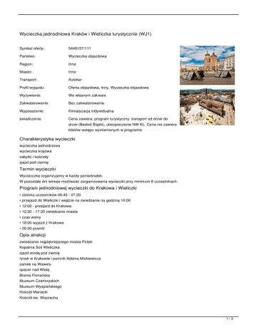 Wycieczka jednodniowa Kraków i Wieliczka turystycznie (WJ1) Symbol oferty: 5449157/111 Państwo: Wycieczka objazdowa Region: Inne Miasto: Inne Transport: Autokar Profil wyjazdu: Oferta objazdowa, Inny, Wycieczka objazdowa Wyżywienie: We własnym zakresie Zakwaterowanie: Bez zakwaterowania Wyposażenie: Klimatyzacja indywidualna świadczenia: Cena zawiera: program turystyczny, transport od drzwi do drzwi (Beskid Śląski), ubezpieczenie NW KL. Cena nie zawiera biletów wstępu wymienionych w programie. Charakterystyka wycieczki wycieczka jednodniowa wycieczka krajowa zabytki i kościoły zjazd pod ziemię Termin wycieczki Wyciecczkę organizujemy w każdy poniedziałek. W pozostałe dni istnieje możliwość zorganizowania wycieczki przy minimum 8 uczestnikach. Program jednodniowej wycieczki do Krakowa i Wieliczki • zbiórka uczestników 06:45 - 07:20 • przejazd do Wieliczki i wejście na zwiedzanie na godzinę 10:00 • 12:00 - przejazd do Krakowa • 12:30 - 17:30 zwiedzanie miasta • czas wolny • 18:00 wyjazd z Krakowa • 20:30 powrót Opis atrakcji zwiedzanie najpiękniejszego miasta Polski Kopalnia Soli Wieliczka zjazd windą pod ziemię rynek w Krakowie i pomnik Adama Mickiewicza zamek na Wawelu spacer nad Wisłą Brama Floriańska Muzeum Czartoryskich Muzeum Wyspiańskiego Kościół Mariacki Kościół św. Wojciecha 1/3 Dziedziniec Collegium Maius Kościół św. Anny Kościół Dominikanów Kościół św. Piotra i Pawła Kościół św. Andrzeja Mury miejskie i planty Sukiennice Cena zawiera Cena zawiera: program turystyczny, transport od drzwi do drzwi (Beskid Śląski), ubezpieczenie NW KL. Cena nie zawiera biletów wstępu wymienionych w programie. Cena nie zawiera OBOWIĄZKOWO Biletu wstępu do Kopalni Soli w Wieliczce OPCJONALNIE Wyjście na wieżę Kościoła Mariackiego, Muzeum Czartoryskich, Muzeum Wyspiańskiego, zamek na Wawelu Cena w zależności od ilości uczestników cena dla grupy VIP 100 zł cena dla grupy autokarowej > 45 osób 48 zł TERMINY: od: 2017-03-13 do: 2017-03-13 (1 dni), miejsca: sprawdź miejsca cena od: 100 PLN od: 2017-03-20 do: 2017-03-20 (1 dni), miejsca: sprawdź miejsca cena od: 100 PLN od: 2017-03-27 do: 2017-03-27 (1 dni), miejsca: sprawdź miejsca cena od: 100 PLN od: 2017-04-03 do: 2017-04-03 (1 dni), miejsca: sprawdź miejsca cena od: 100 PLN od: 2017-04-10 do: 2017-04-10 (1 dni), miejsca: sprawdź miejsca cena od: 100 PLN od: 2017-04-17 do: 2017-04-17 (1 dni), miejsca: sprawdź miejsca cena od: 100 PLN od: 2017-04-24 do: 2017-04-24 (1 dni), miejsca: sprawdź miejsca cena od: 100 PLN od: 2017-05-01 do: 2017-05-01 (1 dni), miejsca: sprawdź miejsca cena od: 100 PLN od: 2017-05-08 do: 2017-05-08 (1 dni), miejsca: sprawdź miejsca cena od: 100 PLN od: 2017-05-15 do: 2017-05-15 (1 dni), miejsca: sprawdź miejsca cena od: 100 PLN CENNIK: Długość pobytu: 1 dni Grupa cenowa: A Bilet (opcjonalny) Bilet Wieliczka - trasa turystyczna język francusk Przewodnik 4 godziny/grupa min. 2 osoby Rodzaj osoby (do wyboru) (*) uczestnik Transport - wyjazd (do wyboru) Ustroń Rynek 2 Informacja Turystyczna Bielsko-Biała ul. Bystrzańska 48 hotel Vienna Brenna ul.Wyzwolenia 77 Informacja Turystyczna Tresna ul.Nad Jeziorem 99 hotel Odys Wisła ul.Lipowa 4 Dworzec PKS 75 300 100 (-) (-) (-) (-) 2/3 (-) Szczyrk ul.Skośna 9 hotel Olimpia Lux Ustroń ul.Sanatoryjna 7 Informacja Turystyczna Bielsko-Biała ul. Warszawska stacja BP Bielsko-Biała pl.Ratuszowy Informacja Turystyczna Szczyrk ul. Beskidzka 41 Informacja Turystyczna (-) (-) (-) (-) (-) Waluta: PLN Aktualne ceny z systemu S.A.R.T. (-) - cena usługi, podatku kalkulowana przy osobie lub gratis (*) - kwota wliczona w cenę standardową 3/3