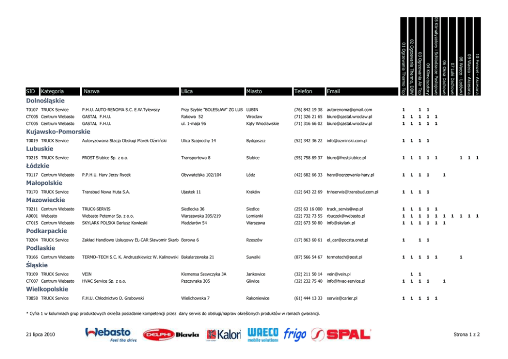 1 1 1 (71) 326 21 65 [email protected] 1 1 1 1 1 CT005 Centrum Webasto GASTAL F.H.U. ul. 1-maja 96 Kąty Wrocławskie (71) 316 66 02 [email protected] 1 1 1 1 1 Autoryzowana Stacja Obsługi Marek Oźmiński Ulica Szajnochy 14 Bydgoszcz (52) 342 36 22 [email protected] 1 1 1 1 FROST Słubice Sp. z o.o. Transportowa 8 Slubice (95) 758 89 37 [email protected] 1 1 1 1 P.P.H.U. Hary Jerzy Rycek Obywatelska 102/104 Lódz (42) 682 66 33 [email protected] 1 1 1 1 Transbud Nowa Huta S.A. Ujastek 11 Kraków (12) 643 22 69 [email protected] 1 1 1 1 T0211 Centrum Webasto TRUCK-SERVIS Siedlecka 36 Siedlce (25) 63 16 000 [email protected] 1 1 1 1 1 A0001 Webasto Webasto Petemar Sp. z o.o. Warszawska 205/219 Lomianki (22) 732 73 55 [email protected] 1 1 1 1 1 1 CT015 Centrum Webasto SKYLARK POLSKA Dariusz Kowieski Madziarów 54 Warszawa (22) 673 50 80 [email protected] 1 1 1 1 1 1 Zakład Handlowo Usługowy EL-CAR Sławomir Skarb Borowa 6 Rzeszów (17) 863 60 61 [email protected] 1 1 1 TERMO–TECH S.C. K. Andruszkiewicz W. Kalinowski Bakalarzewska 21 Suwalki (87) 566 54 67 [email protected] 1 1 1 1 T0109 TRUCK Service VEIN Klemensa Szewczyka 3A Jankowice (32) 211 50 14 [email protected] 1 1 CT007 Centrum Webasto HVAC Service Sp. z o.o. Pszczynska 305 Gliwice (32) 232 75 40 [email protected] 1 1 1 1 F.H.U. Chłodnictwo D. Grabowski Wielichowska 7 Rakoniewice (61) 444 13 33 [email protected] 1 1 1 1 10 Frenzel - Akcesoria [email protected] Wroclaw Miasto 09 Waeco - Akcesoria (76) 842 19 38 Rakowa 52 Ulica 07 Luki Dachowe Przy Szybie "BOLESŁAW" ZG LUB LUBIN GASTAL F.H.U. Nazwa 06 Okna Dachowe P.H.U. AUTO-RENOMA S.C. E.W.Tylewscy CT005 Centrum Webasto Kategoria 08 Waeco - Lodówki 05 Klimatyzatory i Schładzacze Postojowe 04 Klimatyzatory 01 Ogrzewania Thermo Top 03 Ogrzewania Air Top Email 02 Ogrzewania Thermo, DBW Telefon T0107 TRUCK Service SID 1 1 1 1 1 1 Dolnośląskie Kujawsko-Pomorskie T0019 TRUCK Service Lubuskie T0215 TRUCK Service 1 Łódzkie T0117 Centrum Webasto 1 Małopolskie T0170 TRUCK Service Mazowieckie 1 Podkarpackie T0204 TRUCK Service Podlaskie T0166 Centrum Webasto 1 1 Śląskie 1 Wielkopolskie T0058 TRUCK Service 1 * Cyfra 1 w kolumnach grup produktowych określa posiadanie kompetencji przez dany serwis do obsługi/napraw określonych produktów w ramach gwarancji. 21 lipca 2010 Strona 1 z 2 01 Ogrzewania Thermo Top 02 Ogrzewania Thermo, DBW 03 Ogrzewania Air Top 04 Klimatyzatory 05 Klimatyzatory i Schładzacze Postojowe 06 Okna Dachowe (61) 866 75 66 [email protected] 1 1 1 1 1 1 T0018 TRUCK Service P.H.U. Marek Stańko Strzelecka 13 Pniewy (61) 291 12 46 [email protected] 1 1 1 1 1 T0044 TRUCK Service Elektromechanika Pojazdowa L. Zawistowski Topolowa 10 Stare Miasto (63) 241 62 76 [email protected] 1 1 1 1 1 Przecław 3J Przeclaw (91) 482 42 22 [email protected] 1 1 1 1 1 1 10 Frenzel - Akcesoria Email Poznan 09 Waeco - Akcesoria Telefon Wołowska 80 Nazwa 07 Luki Dachowe Miasto MP Serwis Sp. z o.o. Kategoria 08 Waeco - Lodówki Ulica CT009 Centrum Webasto SID Zachodniopomorskie T0085 Centrum Webasto M Service Sp. z o.o. 1 * Cyfra 1 w kolumnach grup produktowych określa posiadanie kompetencji przez dany serwis do obsługi/napraw określonych produktów w ramach gwarancji. 21 lipca 2010 Strona 2 z 2