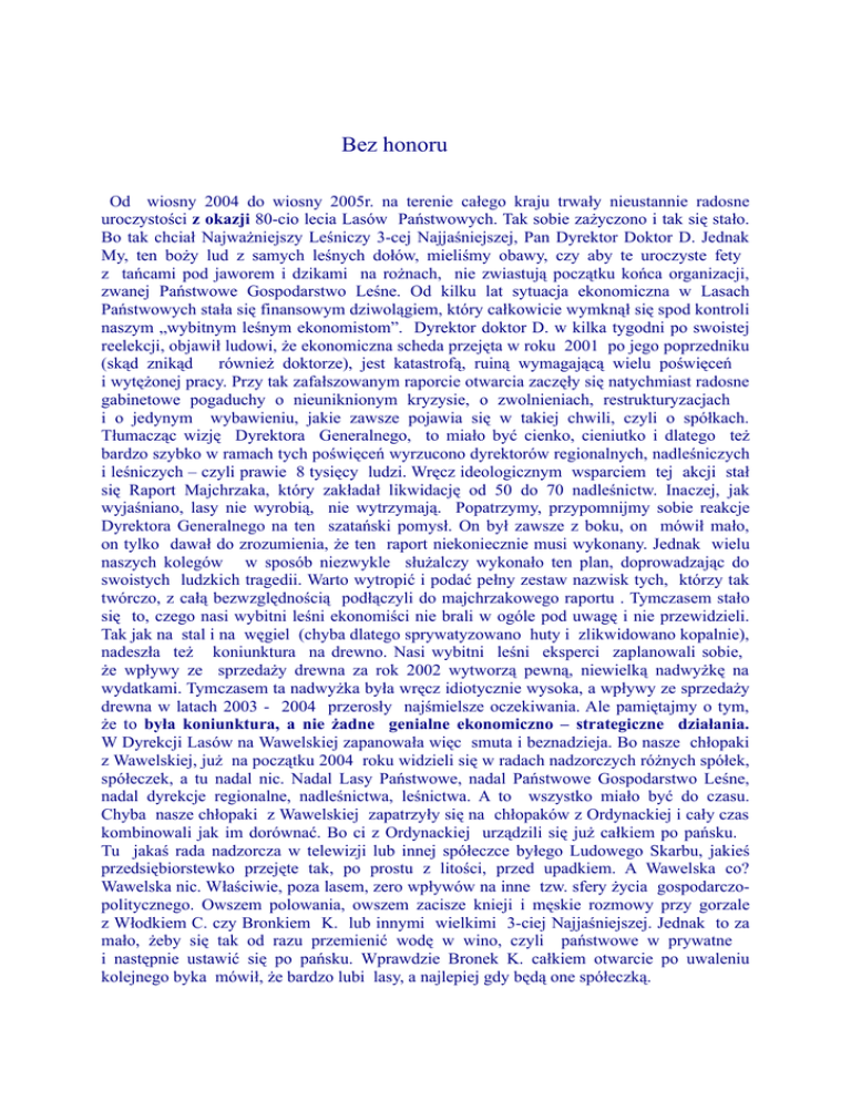 Bez honoru Od wiosny 2004 do wiosny 2005r. na terenie całego kraju trwały nieustannie radosne uroczystości z okazji 80-cio lecia Lasów Państwowych. Tak sobie zażyczono i tak się stało. Bo tak chciał Najważniejszy Leśniczy 3-cej Najjaśniejszej, Pan Dyrektor Doktor D. Jednak My, ten boży lud z samych leśnych dołów, mieliśmy obawy, czy aby te uroczyste fety z tańcami pod jaworem i dzikami na rożnach, nie zwiastują początku końca organizacji, zwanej Państwowe Gospodarstwo Leśne. Od kilku lat sytuacja ekonomiczna w Lasach Państwowych stała się finansowym dziwolągiem, który całkowicie wymknął się spod kontroli naszym „wybitnym leśnym ekonomistom”. Dyrektor doktor D. w kilka tygodni po swoistej reelekcji, objawił ludowi, że ekonomiczna scheda przejęta w roku 2001 po jego poprzedniku (skąd znikąd również doktorze), jest katastrofą, ruiną wymagającą wielu poświęceń i wytężonej pracy. Przy tak zafałszowanym raporcie otwarcia zaczęły się natychmiast radosne gabinetowe pogaduchy o nieuniknionym kryzysie, o zwolnieniach, restrukturyzacjach i o jedynym wybawieniu, jakie zawsze pojawia się w takiej chwili, czyli o spółkach. Tłumacząc wizję Dyrektora Generalnego, to miało być cienko, cieniutko i dlatego też bardzo szybko w ramach tych poświęceń wyrzucono dyrektorów regionalnych, nadleśniczych i leśniczych – czyli prawie 8 tysięcy ludzi. Wręcz ideologicznym wsparciem tej akcji stał się Raport Majchrzaka, który zakładał likwidację od 50 do 70 nadleśnictw. Inaczej, jak wyjaśniano, lasy nie wyrobią, nie wytrzymają. Popatrzymy, przypomnijmy sobie reakcje Dyrektora Generalnego na ten szatański pomysł. On był zawsze z boku, on mówił mało, on tylko dawał do zrozumienia, że ten raport niekoniecznie musi wykonany. Jednak wielu naszych kolegów w sposób niezwykle służalczy wykonało ten plan, doprowadzając do swoistych ludzkich tragedii. Warto wytropić i podać pełny zestaw nazwisk tych, którzy tak twórczo, z całą bezwzględnością podłączyli do majchrzakowego raportu . Tymczasem stało się to, czego nasi wybitni leśni ekonomiści nie brali w ogóle pod uwagę i nie przewidzieli. Tak jak na stal i na węgiel (chyba dlatego sprywatyzowano huty i zlikwidowano kopalnie), nadeszła też koniunktura na drewno. Nasi wybitni leśni eksperci zaplanowali sobie, że wpływy ze sprzedaży drewna za rok 2002 wytworzą pewną, niewielką nadwyżkę na wydatkami. Tymczasem ta nadwyżka była wręcz idiotycznie wysoka, a wpływy ze sprzedaży drewna w latach 2003 - 2004 przerosły najśmielsze oczekiwania. Ale pamiętajmy o tym, że to była koniunktura, a nie żadne genialne ekonomiczno – strategiczne działania. W Dyrekcji Lasów na Wawelskiej zapanowała więc smuta i beznadzieja. Bo nasze chłopaki z Wawelskiej, już na początku 2004 roku widzieli się w radach nadzorczych różnych spółek, spółeczek, a tu nadal nic. Nadal Lasy Państwowe, nadal Państwowe Gospodarstwo Leśne, nadal dyrekcje regionalne, nadleśnictwa, leśnictwa. A to wszystko miało być do czasu. Chyba nasze chłopaki z Wawelskiej zapatrzyły się na chłopaków z Ordynackiej i cały czas kombinowali jak im dorównać. Bo ci z Ordynackiej urządzili się już całkiem po pańsku. Tu jakaś rada nadzorcza w telewizji lub innej spółeczce byłego Ludowego Skarbu, jakieś przedsiębiorstewko przejęte tak, po prostu z litości, przed upadkiem. A Wawelska co? Wawelska nic. Właściwie, poza lasem, zero wpływów na inne tzw. sfery życia gospodarczopolitycznego. Owszem polowania, owszem zacisze knieji i męskie rozmowy przy gorzale z Włodkiem C. czy Bronkiem K. lub innymi wielkimi 3-ciej Najjaśniejszej. Jednak to za mało, żeby się tak od razu przemienić wodę w wino, czyli państwowe w prywatne i następnie ustawić się po pańsku. Wprawdzie Bronek K. całkiem otwarcie po uwaleniu kolejnego byka mówił, że bardzo lubi lasy, a najlepiej gdy będą one spółeczką. Ale to zbyt małe wsparcie. Jednak najgorsze było to, że nasze chłopaki z Wawelskiej weszły do Unii, jako za przeproszeniem Państwowe Gospodarstwo Leśne. I to jest to tragedia. Przecież już samo słowo PAŃSTWOWE brzmi idiotycznie i nie europejsko. Bo cholera jasna, jak mawiał Fredek Kiepski, sytuacja jest głupia. Drewno sprzedaje się ostro, kasiora rośnie, wpływy zajebiście duże, a szkodnik Kołodka wykołowany na amen. I jak tu zafundować ludowi leśnemu jasełkę o nieuchronnym końcu PGL-u? Ale nasze chłopaki z Wawelskiej „kombinowali” i mieli już od dawna napoleoński plan. Po pierwsze – restrukturyzować, bo co to za zatrudnienie 28 tysięcy w organizacji, która jak sama nazwa wskazuje jest PAŃSTWOWA. To skandal. Bo co to jest te 1300 ha lasu na łeb 1-go leśniczego - to jest po prostu zwykłe chamstwo i lenistwo. A 3 tysiące hektarów na łeb to niełaska?. Nie zgodzą się? To będą inni. No ale po co koledzy dyrektorzy, koledzy nadleśniczowie - wszystko z kulturką. Najpierw wybrać ofiary na odstrzał i sączyć im przypowieści o wesołym życiu staruszka, czyli o zbawiennym przejściu na żebracze emerytury. Jak nie załapią o co chodzi, wytykać im co dzień błędy. Tego już nie zdzierżą. Poddadzą się sami. Warunek drugi - należy rozwalić kasę. Bo wiadomo kasa musi być mała, jak najmniejsza. Zaczęto więc wydawać tą kasę, wyrabianą przez leśniczych w oszalałym znoju, na światowe auta, na europejskie remonty biur, nadleśniczówek leśniczówek (ale tylko dla wybranych ) na idiotyczne szkolenia menadżersko – psychologiczne, na myśliwskie fety i inne przyrodnicze rajdy. Browarek lał się tam strumieniami, bo wiadomo lekko nawalony leśny lud jest mniej czujny, a poza tym, jak mawia mistrz Himilsbach – w tych niewątpliwych okolicznościach przyrody - wzrasta poczucie durnowatej wspólnoty. Ale nie wszyscy tak się zachowywali. Nasz Najwyższy Szef zawsze prezentował się nieskazitelnie. Szczególnie widać t