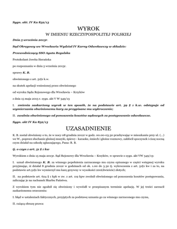 Sygn. akt. IV Ka 832/13 WYROK W IMIENIU RZECZYPOSPOLITEJ POLSKIEJ Dnia 5 września 2013r. Sąd Okręgowy we Wrocławiu Wydział IV Karny Odwoławczy w składzie: Przewodniczący SSO Agata Regulska Protokolant Jowita Sierańska po rozpoznaniu w dniu 5 września 2013r. sprawy K. B. obwinionego z art. 51§1 k.w. na skutek apelacji wniesionej przez obwinionego od wyroku Sądu Rejonowego dla Wrocławia – Krzyków z dnia 15 maja 2013 r. sygn. akt V W 349/13 I. zmienia zaskarżony wyrok w ten sposób, że na podstawie art. 39 § 1 k.w. odstępuje od wymierzania obwinionemu kary za przypisane mu wykroczenie; II. zwalnia obwinionego od ponoszenia kosztów sądowych za postępowanie odwoławcze. Sygn. akt IV Ka 832/13 UZASADNIENIE K. B. został obwiniony o to, że w nocy 08 grudnia 2012r w godz. 00.00-03.30 przebywając w mieszkaniu przy ul. (...) we W., poprzez słuchanie głośnej muzyki, śpiewy - karaoke, śmiech i głośne rozmowy, zakłócił spoczynek i ciszę nocną czym działał na szkodę zgłaszającego, Pana: R. B. tj. o czyn z art. 51 § 1 kw Wyrokiem z dnia 15 maja 2013r. Sąd Rejonowy dla Wrocławia – Krzyków, w sprawie o sygn. akt VW 349/13: I. uznał obwinionego K. B. za winnego popełnienia zarzucanego mu czynu opisanego w części wstępnej wyroku przyjmując, iż działał 8 grudnia 2012r w godzinach od ok. 1.00 do 3.30 tj. wykroczenia z art. 51§1 kw i za to, na podstawie art.51§1 kw wymierzył mu karę grzywny w wysokości 200(dwieście) złotych; II. na podstawie art. 624 § 1 kpk w zw. z art. 119 kpw zwolnił obwinionego od ponoszenia kosztów postępowania, zaliczając je na rachunek Skarbu Państwa. Z wyrokiem tym nie zgodził się obwiniony i wywiódł w przepisanym terminie apelację. W jej treści zarzucił zaskarżonemu orzeczeniu: I. błąd w ustaleniach faktycznych, przyjętych za podstawę uznania go za winnego zarzuconego mu czynu, II. rażącą obrazę prawa: a) procesowego, w szczególności przez naruszenie: - zasady swobodnej oceny dowodów (art. 7 kpk w zw. z art. 8 kpw), - zasady res iudicata ( art. 5§1 pkt 8 kpw), - zasady domniemania niewinności i ind dubio pro reo ( art. 5 kpk w zw. z art. 8 kpw), b) materialnego przez naruszenie art. 51§1 kw. Apelujący w treści pisma wniósł o zmianę wyroku przez jego uchylenie i umorzenie postępowania, ewentualnie o przekazanie sprawy Sądowi Rejonowemu do ponownego rozpoznania. Sąd Okręgowy zważył, co następuje: Apelacja nie zasługiwała na uwzględnienie. Po zapoznaniu się i szczegółowym przeanalizowaniu akt sprawy należy uznać, iż Sąd Rejonowy przeprowadził postępowanie rozpoznawcze w sposób prawidłowy, dążąc do wyjaśnienia istotnych dla rozstrzygnięcia kwestii. Analiza uzasadnienia orzeczenia pozwala na przyjęcie, iż zebrane w sprawie dowody Sąd I instancji dokładnie przeanalizował i wszechstronnie ocenił. Wymowa dowodów przeprowadzonych w toku postępowania nie pozostawia wątpliwości również dla Sądu Odwoławczego, który w pełni podziela stanowisko Sądu orzekającego odnośnie tego, iż całokształt zebranego w sprawie materiału dowodowego daje wystarczającą podstawę do uznania sprawstwa obwinionego w odniesieniu do zarzuconego mu wykroczenia z art. 51 § 1 kw. Sąd Okręgowy uznał, iż podnoszony zarzut błędu w ustaleniach faktycznych jest całkowicie bezpodstawny. Zarzut taki bowiem tylko wówczas jest słuszny, gdy zasadność ocen i wniosków wyprowadzonych przez Sąd orzekający nie odpowiada prawidłowości logicznego rozumowania, a stawiając ten zarzut należy wykazać jakich mianowicie konkretnych uchybień w świetle wskazań wiedzy oraz doświadczenia życiowego dopuścił się Sąd I instancji w dokonanej przez siebie ocenie materiału dowodowego. W treści apelacji nie wskazano okoliczności, które pozostałyby poza rozważaniem Sądu Rejonowego, ani żadnego argumentu czy dowodu przekonującego, że ustalenia faktyczne pozostają w sprzeczności z kryteriami prawidłowego rozumowania czy doświadczenia życiowego. Analizując zebrany w sprawie materiał dowodowy Sąd Odwoławczy w zupełności podzielił argumentację zawartą w uzasadnieniu zaskarżonego orzeczenia. Zarzut apelującego, wskazujący na naruszeniu przez Sąd orzekający zasady res iudicata pozostaje całkowicie chybiony. Nie ulegało bowiem w sprawie wątpliwości, iż czyn, za który obwiniony został ukarany w drodze mandatu karnego był odrębnym zdarzeniem od tego, które jest przedmiotem niniejszego postępowania. Jak wynika z dokonanych prawidłowo ustaleń faktycznych w sprawie zachowania, za które został nałożony mandat zostały faktycznie przerwane interwencją Policji (choć jedynie na bardzo krótko). Jakkolwiek po odjeździe funkcjonariuszy Policji natężenie hałasu w mieszkaniu obwinionego uległo obniżeniu – obwiniony i jego goście zaniechali śpiewów to nadal było głośno (rozmowy, śmiech, intensywne stukanie w podłogę). Nie można zatem z pewnością mówić o tym, że K. B. został dwukrotnie ukarany za to samo wykroczenie. Wbrew twierdzeniom apelującego, Sąd orzekający słusznie uznał, że czyn obwinionego stanowił znamiona wykroczenia z art. 51 kw (jako wybryk zakłócający spoczynek nocny). Zachowanie ujawnione w mieszkaniu obwinionego w godzinach nocnych z pewnością było takie, które odbiegało od przyjętych norm zachowania mając na uwadze jego porę oraz miejsce. Nie można zaakceptować argumentacji K. B., w której przekonuje on, że zachowanie to nie odbiegało od przyjętego zwyczajowo w danym miejscu i czasie, mając na uwadze wskazywaną przez niego szczególną okoliczność uzasadniającą świętowanie. Zakłócenie spoczynku nocnego polega na uniemożliwieniu, przynajmniej jednej osobie, odpoczęcia w ciszy, która obowiązuje od godz. 22:00 do 6:00, a do takiego zakłócenia niewątpliwie doszło. Reasumując powyższe, ustalony prawidłowo przez Sąd I instancji stan faktyczny, pozwalał na przyjęcie, iż obwinion