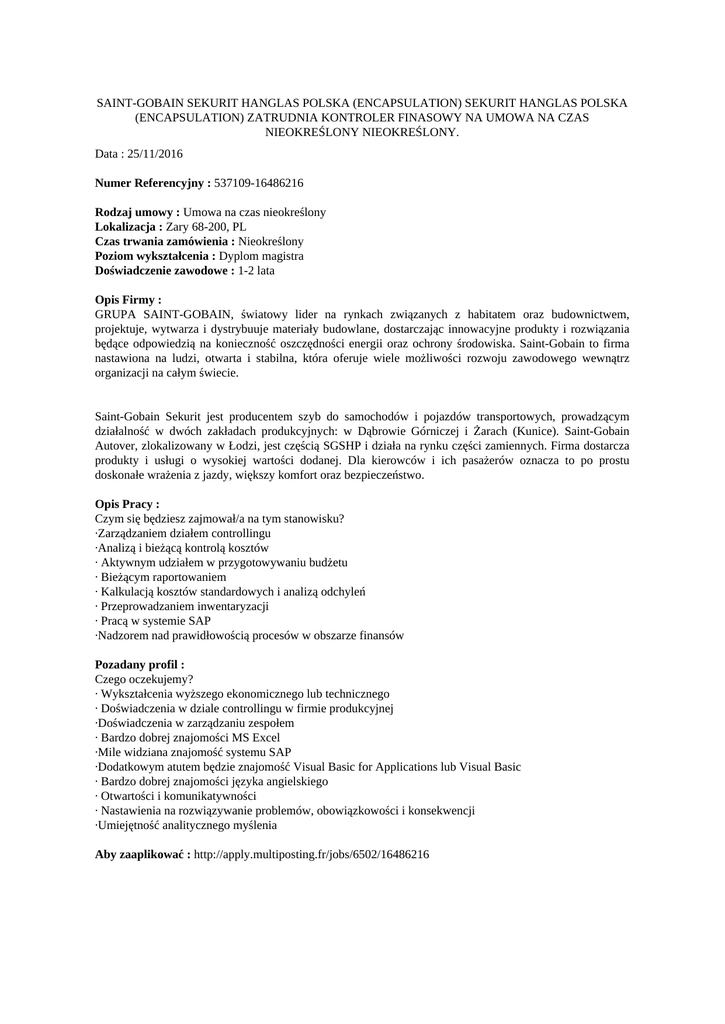 SAINT-GOBAIN SEKURIT HANGLAS POLSKA (ENCAPSULATION) SEKURIT HANGLAS POLSKA (ENCAPSULATION) ZATRUDNIA KONTROLER FINASOWY NA UMOWA NA CZAS NIEOKREŚLONY NIEOKREŚLONY. Data : 25/11/2016 Numer Referencyjny : 537109-16486216 Rodzaj umowy : Umowa na czas nieokreślony Lokalizacja : Zary 68-200, PL Czas trwania zamówienia : Nieokreślony Poziom wykształcenia : Dyplom magistra Doświadczenie zawodowe : 1-2 lata Opis Firmy : GRUPA SAINT-GOBAIN, światowy lider na rynkach związanych z habitatem oraz budownictwem, projektuje, wytwarza i dystrybuuje materiały budowlane, dostarczając innowacyjne produkty i rozwiązania będące odpowiedzią na konieczność oszczędności energii oraz ochrony środowiska. Saint-Gobain to firma nastawiona na ludzi, otwarta i stabilna, która oferuje wiele możliwości rozwoju zawodowego wewnątrz organizacji na całym świecie. Saint-Gobain Sekurit jest producentem szyb do samochodów i pojazdów transportowych, prowadzącym działalność w dwóch zakładach produkcyjnych: w Dąbrowie Górniczej i Żarach (Kunice). Saint-Gobain Autover, zlokalizowany w Łodzi, jest częścią SGSHP i działa na rynku części zamiennych. Firma dostarcza produkty i usługi o wysokiej wartości dodanej. Dla kierowców i ich pasażerów oznacza to po prostu doskonałe wrażenia z jazdy, większy komfort oraz bezpieczeństwo. Opis Pracy : Czym się będziesz zajmował/a na tym stanowisku? ∙Zarządzaniem działem controllingu ∙Analizą i bieżącą kontrolą kosztów ∙ Aktywnym udziałem w przygotowywaniu budżetu ∙ Bieżącym raportowaniem ∙ Kalkulacją kosztów standardowych i analizą odchyleń ∙ Przeprowadzaniem inwentaryzacji ∙ Pracą w systemie SAP ∙Nadzorem nad prawidłowością procesów w obszarze finansów Pozadany profil : Czego oczekujemy? ∙ Wykształcenia wyższego ekonomicznego lub technicznego ∙ Doświadczenia w dziale controllingu w firmie produkcyjnej ∙Doświadczenia w zarządzaniu zespołem ∙ Bardzo dobrej znajomości MS Excel ∙Mile widziana znajomość systemu SAP ∙Dodatkowym atutem będzie znajomość Visual Basic for Applications lub Visual Basic ∙ Bardzo dobrej znajomości języka angielskiego ∙ Otwartości i komunikatywności ∙ Nastawienia na rozwiązywanie problemów, obowiązkowości i konsekwencji ∙Umiejętność analitycznego myślenia Aby zaaplikować : http://apply.multiposting.fr/jobs/6502/16486216