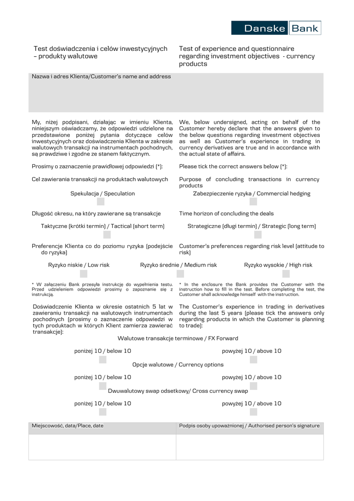 Test doświadczenia i celów inwestycyjnych – produkty walutowe Test of experience and questionnaire regarding investment objectives - currency products Nazwa i adres Klienta/Customer’s name and address My, niżej podpisani, działając w imieniu Klienta, niniejszym oświadczamy, że odpowiedzi udzielone na przedstawione poniżej pytania dotyczące celów inwestycyjnych oraz doświadczenia Klienta w zakresie walutowych transakcji na instrumentach pochodnych, są prawdziwe i zgodne ze stanem faktycznym. We, below undersigned, acting on behalf of the Customer hereby declare that the answers given to the below questions regarding investment objectives as well as Customer’s experience in trading in currency derivatives are true and in accordance with the actual state of affairs. Prosimy o zaznaczenie prawidłowej odpowiedzi (*): Please tick the correct answers below (*): Cel zawierania transakcji na produktach walutowych Purpose of concluding transactions in currency products Zabezpieczenie ryzyka / Commercial hedging Spekulacja / Speculation Długość okresu, na który zawierane są transakcje Time horizon of concluding the deals Taktyczne (krótki termin) / Tactical (short term) Strategiczne (długi termin) / Strategic (long term) Preferencje Klienta co do poziomu ryzyka (podejście do ryzyka) Customer’s preferences regarding risk level (attitude to risk) Ryzyko niskie / Low risk Ryzyko średnie / Medium risk * W załączeniu Bank przesyła instrukcję do wypełnienia testu. Przed udzieleniem odpowiedzi prosimy o zapoznanie się z instrukcją. Ryzyko wysokie / High risk * In the enclosure the Bank provides the Customer with the instruction how to fill in the test. Before completing the test, the Customer shall acknowledge himself with the instruction. Doświadczenie Klienta w okresie ostatnich 5 lat w The Customer’s experience in trading in derivatives zawieraniu transakcji na walutowych instrumentach during the last 5 years (please tick the answers only pochodnych (prosimy o zaznaczenie odpowiedzi w regarding products in which the Customer is planning tych produktach w których Klient zamierza zawierać to trade): transakcje): Walutowe transakcje terminowe / FX Forward poniżej 10 / below 10 powyżej 10 / above 10 Opcje walutowe / Currency options poniżej 10 / below 10 powyżej 10 / above 10 Dwuwalutowy swap odsetkowy/ Cross currency swap poniżej 10 / below 10 Miejscowość, data/Place, date powyżej 10 / above 10 Podpis osoby upoważnionej / Authorised person’s signature