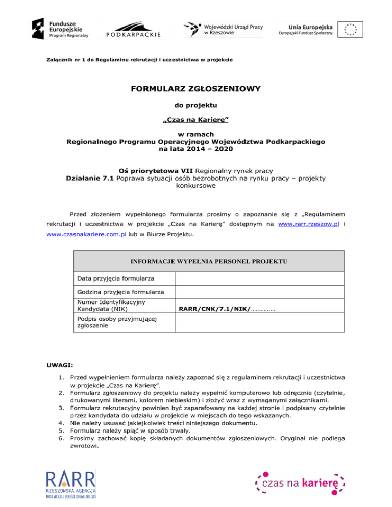 Załącznik nr 1 do Regulaminu rekrutacji i uczestnictwa w projekcie FORMULARZ ZGŁOSZENIOWY do projektu „Czas na Karierę” w ramach Regionalnego Programu Operacyjnego Województwa Podkarpackiego na lata 2014 – 2020 Oś priorytetowa VII Regionalny rynek pracy Działanie 7.1 Poprawa sytuacji osób bezrobotnych na rynku pracy – projekty konkursowe Przed złożeniem wypełnionego formularza prosimy o zapoznanie się z „Regulaminem rekrutacji i uczestnictwa w projekcie „Czas na Karierę” dostępnym na www.rarr.rzeszow.pl i www.czasnakariere.com.pl lub w Biurze Projektu. INFORMACJE WYPEŁNIA PERSONEL PROJEKTU Data przyjęcia formularza Godzina przyjęcia formularza Numer Identyfikacyjny Kandydata (NIK) RARR/CNK/7.1/NIK/…………… Podpis osoby przyjmującej zgłoszenie UWAGI: 1. Przed wypełnieniem formularza należy zapoznać się z regulaminem rekrutacji i uczestnictwa w projekcie „Czas na Karierę”. 2. Formularz zgłoszeniowy do projektu należy wypełnić komputerowo lub odręcznie (czytelnie, drukowanymi literami, kolorem niebieskim) i złożyć wraz z wymaganymi załącznikami. 3. Formularz rekrutacyjny powinien być zaparafowany na każdej stronie i podpisany czytelnie przez kandydata do udziału w projekcie w miejscach do tego wskazanych. 4. Nie należy usuwać jakiejkolwiek treści niniejszego dokumentu. 5. Formularz należy spiąć w sposób trwały. 6. Prosimy zachować kopię składanych dokumentów zgłoszeniowych. Oryginał nie podlega zwrotowi. I. INFORMACJE DOTYCZĄCE KANDYDATA DO PROJEKTU INFORMACJE PODSTAWOWE Imię (Imiona) Nazwisko PESEL Płeć Miejsce urodzenia Data urodzenia Kobieta Mężczyzna ADRES ZAMIESZKANIA Ulica Nr domu/nr lokalu Kod pocztowy Miejscowość Województwo Powiat Gmina Obszar Tel. kontaktowy E-mail Miejski Wiejski II. INFORMACJE DODATKOWE KRYTERIA DOTYCZĄCE STATUSU KANDYDATA NA RYNKU PRACY: 1. Określenie statusu Kandydata na rynku pracy (proszę zaznaczyć x w właściwym miejscu) OSOBA BEZROBOTNA1 OSOBA BIERNA ZAWODOWO 2 KRYTERIA KWALIFIKACYJNE DOTYCZĄCE GRUPY DOCELOWEJ: OSOBA POWYŻEJ 29 R.Ż. 3 2. Przynależność Kandydata do grupy docelowej OSOBA POWYŻEJ 50 R.Ż. 4 (proszę zaznaczyć x w każdym właściwym miejscu) OSOBA NIEPEŁNOSPRAWNA OSOBA DŁUGOTRWALE BEZROBOTNA 5 OSOBA ZAMIESZKAŁA NA TERENACH WIEJSKICH OSOBA O NISKICH KWALIFIKACJACH ZAWODOWYCH 6 osoba pozostająca bez pracy, gotowa do podjęcia pracy i aktywnie poszukująca zatrudnienia. Definicja uwzględnia osoby zarejestrowane jako bezrobotne zgodnie z krajowymi przepisami, nawet jeżeli nie spełniają one wszystkich trzech kryteriów. 2 osoba, która w danej chwili nie tworzą zasobów siły roboczej (tzn. nie pracują i nie są bezrobotne). 3 osoba, która w dniu rozpoczęcia udziału w projekcie miała ukończone 30 lat (od dnia 30 urodzin). Wiek uczestników określany jest na podstawie daty urodzenia i ustalany na dzień przystąpienia do udziału w projekcie. 4 osoba, która w dniu rozpoczęcia udziału w projekcie miała ukończone 50 lat (od dnia 50 urodzin). Wiek uczestników określany jest na podstawie daty urodzenia i ustalany na dzień przystąpienia do udziału w projekcie. 5 osoba bezrobotna nieprzerwanie przez okres ponad 12 miesięcy (>12 miesięcy) liczonych do dnia złożenia Formularza zgłoszeniowego do udziału w projekcie. 6 oznacza to osoby posiadające wykształcenie do poziomu ISCED 3 włącznie tj. wykształcenie ponadgimnazjalne (liceum, liceum profilowane, technikum, technikum uzupełniające, zasadnicza szkoła zawodowa). 1 III. ZAŁĄCZNIKI DO FORMULARZA WYKAZ WYMAGANYCH ZAŁĄCZNIKÓW: DOTYCZY 1. Zaświadczenie z Powiatowego Urzędu Pracy (oryginał) potwierdzające status osoby bezrobotnej / długotrwale bezrobotnej (jeśli dotyczy) 2. Oświadczenie osoby biernej zawodowo (jeśli dotyczy)7 3. Kserokopia orzeczenia o niepełnosprawności (jeśli dotyczy) NIE DOTYCZY IV. OŚWIADCZENIE OŚWIADCZENIE UCZESTNIKA Oświadczam, że: Zgodnie z wymogami jestem uprawniony/a do uczestnictwa w Projekcie tj. w chwili przystąpienia do projektu jestem osobą: zamieszkującą na obszarze województwa podkarpackiego, pozostającą osobą bezrobotną lub bierną zawodowo, w wieku powyżej 29 roku życia. Zapoznałem/am się z regulaminem uczestnictwa w w/w projekcie i wyrażam zgodę na przystąpienie do niego; Zostałam poinformowany/a, że projekt jest finansowany ze środków Unii Europejskiej w ramach Europejskiego Funduszu Społecznego, Wyrażam dobrowolną zgodę na gromadzenie, przetwarzanie i przekazywanie moich danych osobowych zawartych w niniejszym formularzu (zgodnie z Ustawą z dnia 29 sierpnia 1997 r. o ochronie danych osobowych Dz. U. z 2002 r. Nr 101 poz. 926, ze zm.), do celów związanych z przeprowadzeniem rekrutacji, realizacją projektu, sprawozdawczością, monitoringiem i ewaluacją projektu. Uprzedzony/a o odpowiedzialności karnej z art. 233 Kodeksu Karnego za złożenie nieprawdziwego oświadczenia lub zatajenie prawdy, niniejszym oświadczam, iż dane oraz oświadczenia zawarte w niniejszym formularzu są zgodne z prawdą. ...................................................... Miejscowość, data (dzień, miesiąc, rok) 7 Załącznik do niniejszego formularza (wypełnić jeśli dotyczy) ......................... ..................... Czytelny podpis Kandydata Projekt: „Czas na Karierę” w ramach Regionalnego Programu Operacyjnego Województwa Podkarpackiego na lata 2014 – 2020 Oś priorytetowa VII Regionalny rynek pracy Działanie 7.1 Poprawa sytuacji osób bezrobotnych na rynku pracy – projekty konkursowe OŚWIADCZENIE OSOBY BIERNEJ ZAWODOWO Ja, niżej podpisany/a, ……………………………………………………………………………………………………………………………………………………………………………………… (imię i nazwisko) Zamieszkały/a, ……………………………………………………………………………………………