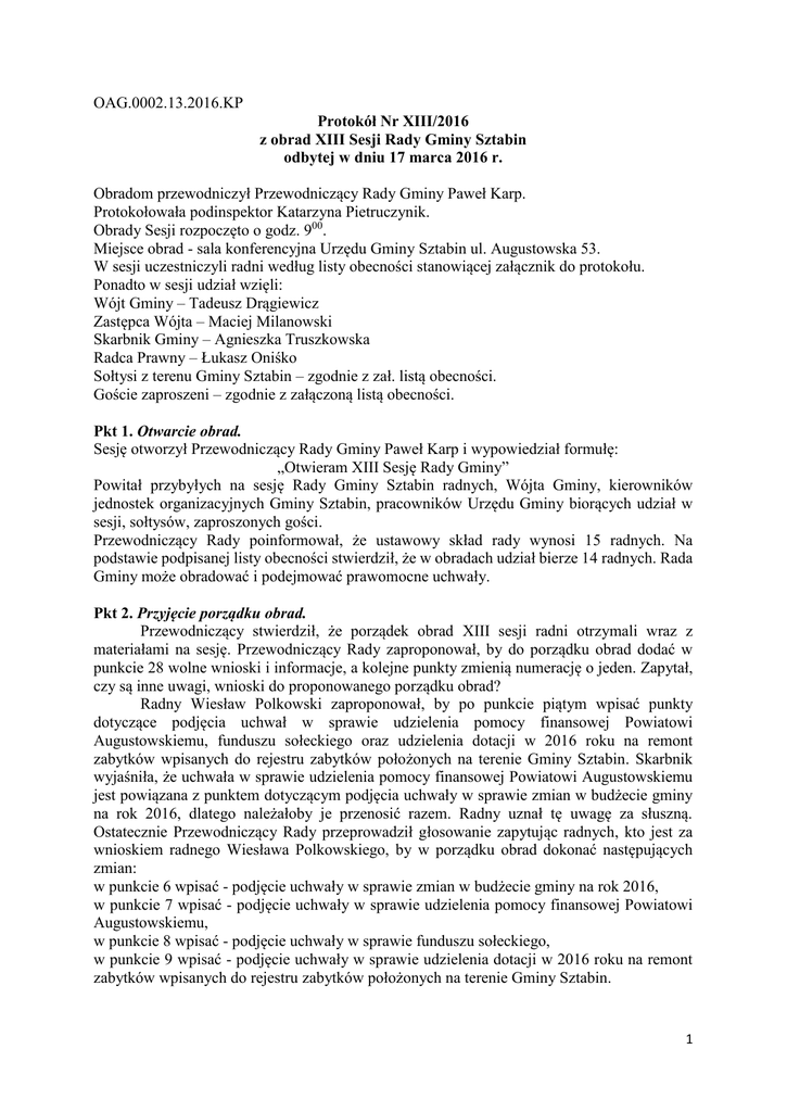 OAG.0002.13.2016.KP Protokół Nr XIII/2016 z obrad XIII Sesji Rady Gminy Sztabin odbytej w dniu 17 marca 2016 r. Obradom przewodniczył Przewodniczący Rady Gminy Paweł Karp. Protokołowała podinspektor Katarzyna Pietruczynik. Obrady Sesji rozpoczęto o godz. 900. Miejsce obrad - sala konferencyjna Urzędu Gminy Sztabin ul. Augustowska 53. W sesji uczestniczyli radni według listy obecności stanowiącej załącznik do protokołu. Ponadto w sesji udział wzięli: Wójt Gminy – Tadeusz Drągiewicz Zastępca Wójta – Maciej Milanowski Skarbnik Gminy – Agnieszka Truszkowska Radca Prawny – Łukasz Oniśko Sołtysi z terenu Gminy Sztabin – zgodnie z zał. listą obecności. Goście zaproszeni – zgodnie z załączoną listą obecności. Pkt 1. Otwarcie obrad. Sesję otworzył Przewodniczący Rady Gminy Paweł Karp i wypowiedział formułę: „Otwieram XIII Sesję Rady Gminy” Powitał przybyłych na sesję Rady Gminy Sztabin radnych, Wójta Gminy, kierowników jednostek organizacyjnych Gminy Sztabin, pracowników Urzędu Gminy biorących udział w sesji, sołtysów, zaproszonych gości. Przewodniczący Rady poinformował, że ustawowy skład rady wynosi 15 radnych. Na podstawie podpisanej listy obecności stwierdził, że w obradach udział bierze 14 radnych. Rada Gminy może obradować i podejmować prawomocne uchwały. Pkt 2. Przyjęcie porządku obrad. Przewodniczący stwierdził, że porządek obrad XIII sesji radni otrzymali wraz z materiałami na sesję. Przewodniczący Rady zaproponował, by do porządku obrad dodać w punkcie 28 wolne wnioski i informacje, a kolejne punkty zmienią numerację o jeden. Zapytał, czy są inne uwagi, wnioski do proponowanego porządku obrad? Radny Wiesław Polkowski zaproponował, by po punkcie piątym wpisać punkty dotyczące podjęcia uchwał w sprawie udzielenia pomocy finansowej Powiatowi Augustowskiemu, funduszu sołeckiego oraz udzielenia dotacji w 2016 roku na remont zabytków wpisanych do rejestru zabytków położonych na terenie Gminy Sztabin. Skarbnik wyjaśniła, że uchwała w sprawie udzielenia pomocy finansowej Powiatowi Augustowskiemu jest powiązana z punktem dotyczącym podjęcia uchwały w sprawie zmian w budżecie gminy na rok 2016, dlatego należałoby je przenosić razem. Radny uznał tę uwagę za słuszną. Ostatecznie Przewodniczący Rady przeprowadził głosowanie zapytując radnych, kto jest za wnioskiem radnego Wiesława Polkowskiego, by w porządku obrad dokonać następujących zmian: w punkcie 6 wpisać - podjęcie uchwały w sprawie zmian w budżecie gminy na rok 2016, w punkcie 7 wpisać - podjęcie uchwały w sprawie udzielenia pomocy finansowej Powiatowi Augustowskiemu, w punkcie 8 wpisać - podjęcie uchwały w sprawie funduszu sołeckiego, w punkcie 9 wpisać - podjęcie uchwały w sprawie udzielenia dotacji w 2016 roku na remont zabytków wpisanych do rejestru zabytków położonych na terenie Gminy Sztabin. 1 Za tą zmianą opowiedziało się 2 radnych, a 13 było „przeciw”. (do obradujących dołączyła radna Małgorzata Kunda). Następnie Przewodniczący Rady zapytał, kto jest za porządkiem obrad przesłanym radnym uzupełnionym o punkt 28 - wolne wnioski i informacje. Za takim porządkiem obrad opowiedziało się 12 radnych, 2 radnych przeciw, 1 radny wstrzymał się od głosu. Porządek obrad przedstawia się następująco: 1. Otwarcie sesji. 2. Przyjęcie porządku obrad. 3. Sprawozdanie z działalności Wójta Gminy Sztabin w okresie od dnia 14 grudnia 2015 roku do 17 marca 2016 r. 4. Interpelacje i zapytania radnych. 5. Odpowiedzi na interpelacje i zapytania. 6. Sprawozdania z działalności stałych komisji rady gminy za 2015 rok. 7. Sprawozdanie za 2015 rok z wysokości osiąganych średnich wynagrodzeń nauczycieli na poszczególnych stopniach awansu zawodowego w szkołach prowadzonych przez Gminę. 8. Sprawozdanie z realizacji Gminnego Programu Profilaktyki i Rozwiązywania Problemów Alkoholowych i wykonania Gminnego Programu Przeciwdziałania Narkomanii za 2015 rok. 9. Sprawozdanie z realizacji Gminnego Programu Przeciwdziałania Przemocy w Rodzinie i Ochrony Ofiar Przemocy w Rodzinie Gminy Sztabin za 2015 rok. 10. Sprawozdanie z działalności Gminnej Biblioteki Publicznej za 2015 r. 11. Sprawozdanie z działalności Gminnego Ośrodka Kultury za 2015 r. 12. Sprawozdanie z działalności Gminnego Ośrodka Pomocy Społecznej w 2015 roku. 13. Sprawozdanie z realizacji Gminnego Programu Promocji Zdrowia Psychicznego za 2015 rok. 14. Sprawozdanie z realizacji Gminnego Programu Wspierania Rodziny na lata 20132015 za 2015 rok. 15. Podjęcie uchwały w sprawie przyjęcia gminnego programu wspierania rodziny na lata 2016-2018. 16. Podjęcie uchwały w sprawie zmian w budżecie gminy na rok 2016. 17. Podjęcie uchwały w sprawie udzielenia pomocy finansowej Powiatowi Augustowskiemu. 18. Podjęcie uchwały w sprawie sprostowania błędu. 19. Podjęcie uchwały w sprawie przyjęcia planów pracy stałych komisji Rady Gminy Sztabin. 20. Podjęcie uchwały w sprawie programu opieki nad zwierzętami bezdomnymi oraz zapobiegania bezdomności zwierząt na terenie Gminy Sztabin w 2016 r. 21. Podjęcie uchwały w sprawie funduszu sołeckiego. 22. Podjęcie uchwały w sprawie udzielenia dotacji w 2016 roku na remont zabytków wpisanych do rejestru zabytków położonych na terenie Gminy Sztabin. 23. Podjęcie uchwały w sprawie zmiany uchwały w sprawie określenia szczegółowych zasad udzielania i rozmiaru obniżek tygodniowego obowiązkowego wymiaru godzin zajęć nauczycielom, którym powierzono stanowiska kierownicze w szkołach, określenia tygodniowego obowiązkowego wymiaru godzin zajęć nauczycieli realizujących w ramach stosunku pracy obowiązki określone dla stanowisk o różnym tygodniowym obowiązkowym wymiarze godzin oraz pedagogów i logopedów szkolnych. 24. Podjęcie uchwały w sprawie ustalenia planu dofinansowania form doskonalenia zawodowego nauczycieli w szkołach prowadzony