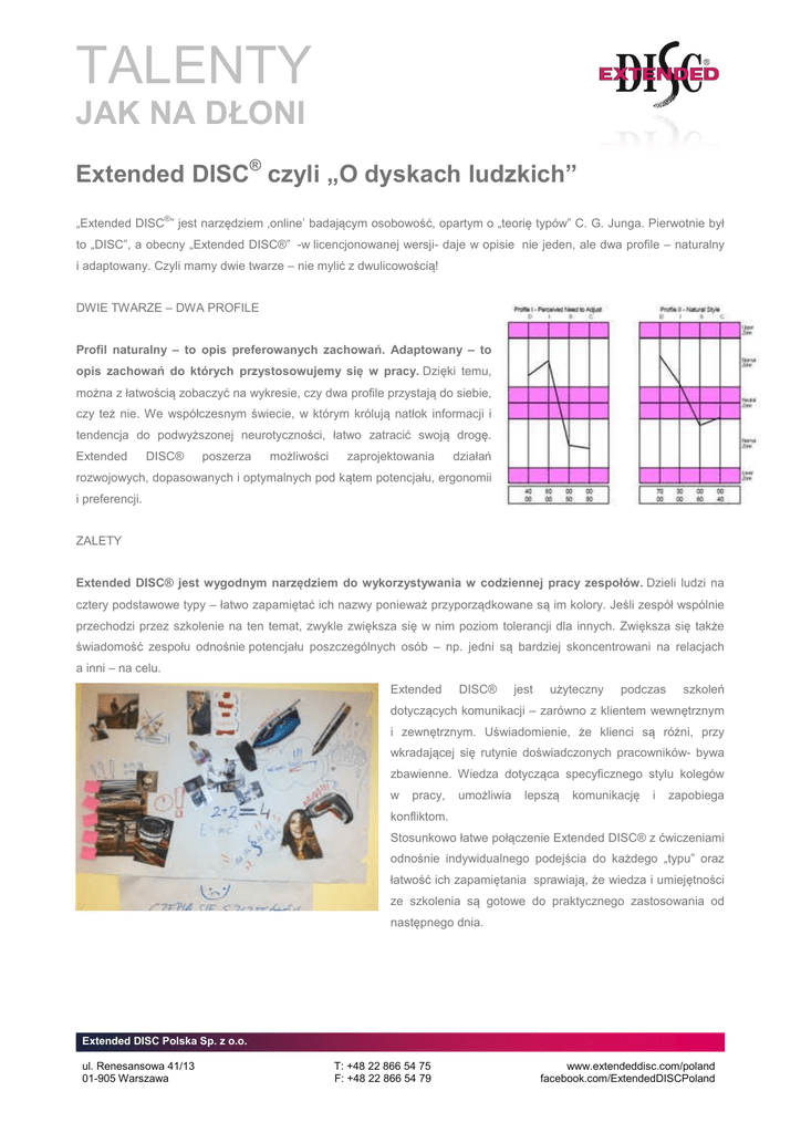 TALENTY JAK NA DŁONI Extended DISC® czyli „O dyskach ludzkich” ® „Extended DISC ” jest narzędziem ‚online’ badającym osobowość, opartym o „teorię typów” C. G. Junga. Pierwotnie był to „DISC”, a obecny „Extended DISC®” -w licencjonowanej wersji- daje w opisie nie jeden, ale dwa profile – naturalny i adaptowany. Czyli mamy dwie twarze – nie mylić z dwulicowością! DWIE TWARZE – DWA PROFILE Profil naturalny – to opis preferowanych zachowań. Adaptowany – to opis zachowań do których przystosowujemy się w pracy. Dzięki temu, można z łatwością zobaczyć na wykresie, czy dwa profile przystają do siebie, czy też nie. We współczesnym świecie, w którym królują natłok informacji i tendencja do podwyższonej neurotyczności, łatwo zatracić swoją drogę. Extended DISC® poszerza możliwości zaprojektowania działań rozwojowych, dopasowanych i optymalnych pod kątem potencjału, ergonomii i preferencji. ZALETY Extended DISC® jest wygodnym narzędziem do wykorzystywania w codziennej pracy zespołów. Dzieli ludzi na cztery podstawowe typy – łatwo zapamiętać ich nazwy ponieważ przyporządkowane są im kolory. Jeśli zespół wspólnie przechodzi przez szkolenie na ten temat, zwykle zwiększa się w nim poziom tolerancji dla innych. Zwiększa się także świadomość zespołu odnośnie potencjału poszczególnych osób – np. jedni są bardziej skoncentrowani na relacjach a inni – na celu. Extended DISC® jest użyteczny podczas szkoleń dotyczących komunikacji – zarówno z klientem wewnętrznym i zewnętrznym. Uświadomienie, że klienci są różni, przy wkradającej się rutynie doświadczonych pracowników- bywa zbawienne. Wiedza dotycząca specyficznego stylu kolegów w pracy, umożliwia lepszą komunikację i zapobiega konfliktom. Stosunkowo łatwe połączenie Extended DISC® z ćwiczeniami odnośnie indywidualnego podejścia do każdego „typu” oraz łatwość ich zapamiętania sprawiają, że wiedza i umiejętności ze szkolenia są gotowe do praktycznego zastosowania od następnego dnia. Extended DISC Polska Sp. z o.o. ul. Renesansowa 41/13 01-905 Warszawa T: +48 22 866 54 75 F: +48 22 866 54 79 www.extendeddisc.com/poland facebook.com/ExtendedDISCPoland TALENTY JAK NA DŁONI ZAGROŻENIA Pozornie prosty model ma swoje 2 oblicza, z których negatywne grozi błędnymi lub nadmiernymi interpretacjami. Zamawiając raport, warto zadbać o to, by przekazywał go konsultant posiadający licencję. Jak w przypadku wszystkich narzędzi klasyfikujących ludzi do określonych „kategorii”, nie można dać się zwieść pokusie pochopnej oceny predyspozycji, a wręcz „przeznaczenia” poszczególnych „kolorów”. Spotkałam się np. z przekonaniem, że mieszanka żółto/czerwona (nastawienie na relacje i na cel) jest szczególnie wskazana w zespołach handlowych. Inne powszechnie panujące MITY to: ”jeśli trener – to żółty”; „jeśli księgowy – to niebieski”; „zielony – nie może być szefem!” Z pewnością można obserwować pewne tendencje, ale tak zupełnie prosto może być np. w starej dziecięcej wyliczance „ pan Sobieski miał trzy pieski – czerwony, zielony…” • Po pierwsze: czteropolówka sugeruje 4 typy, ale tak naprawdę jest ich ponad 100, dzięki metodologii i systemie tworzenia raportów indywidualnych. • Po drugie: jedna osoba ma zwykle jeden typ dominujący, a jeden lub dwa dodatkowe. • Po trzecie: profil naturalny nie zakłada, że nie można wykształcić w sobie dobrze sprawdzającego się profilu adaptowanego. Spotkałam przypadki, gdy osoba zgadzała się ze swoim profilem naturalnym, jako dla niej najbardziej specyficznym, a z zespołu dostawała feedback o swojej charakterystyce, zbliżonej do profilu adaptowanego. • Po czwarte: każdy „typ” może mieć specyficzny dla siebie i efektywny (każdy w inny sposób) sposób bycia, charakterystyczny dla danej roli (trenera, menadżera, etc. • Po piąte: w życiu bywają różne odstępstwa od reguł i statystyk. Niedawno miałam przyjemność pracować z Extended DISC® z zespołem handlowców, wśród których dominował – wbrew powszechnym przekonaniom – zielono/niebieski. Szef zespołu oceniał swój zespół jako bardzo skuteczny, nie chciał nikogo wymieniać na inne „kolory”, a specyfikę zespołu związaną z typami z ED interpretował jako właściwą w kontekście specyfiki swojego działu i polityki firmy wobec klientów. Źródło: Ilona Anczarska, blog: http://ilonaanczarska.pl/2013/09/09/extended-disc-czyli-o-dyskach-ludzkich/ Extended DISC Polska Sp. z o.o. ul. Renesansowa 41/13 01-905 Warszawa T: +48 22 866 54 75 F: +48 22 866 54 79 www.extendeddisc.com/poland facebook.com/ExtendedDISCPoland