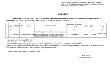 Załącznik nr 1 do zarządzenia Nr W/33/2016 Wójta Gminy Kłodawa z dnia 29 sierpnia 2016 roku w sprawie ogłoszenia wykazu nieruchomości przeznaczonych do sprzedaży i dzierżawy. OGŁOSZENIE Zgodnie z art. 35 ust. 1 i 2 ustawy z dnia 21 sierpnia 1997 roku o gospodarce nieruchomościami (tekst jednolity Dz. U. z 2015, poz. 1774 ze zmianami) Wójt Gminy w Kłodawie podaje wykaz nieruchomości przeznaczonych do sprzedaży. L.p. 1 1 Nr Położenie działki działki 2 397 3 Pow. w ha Nr KW 4 5 Santoczno 0,1515 Opis nieruchomości Przeznaczenie nieruchomości w m.p.z.p 6 7 8 9 10 zabudowana 74.425 sprzedaż Bezprzetargowo na rzecz najemcy Działka położona w Santocznie. Bezpośrednie otoczenie to luźna zabudowa mieszkalnictwa siedliskowego oraz tereny leśne. Zabudowę działki stanowi GW1G/00120092/2 budynek mieszkalny jednorodzinny i murowany budynek gospodarczy łącznie z infrastrukturą: przyłącze wodociągowe i studnia, przyłącze energetyczne, zbiornik bezodpływowy na ścieki i częściowe ogrodzenie. Cena zł. netto Forma zbycia Uwagi - ustalona cena nie zawiera podatku VAT - nieruchomości są wolne od obciążeń, - na nieruchomości ciążą zobowiązania z tytułu nie uiszczonego czynszu w wysokości 51,62 zł na dzień 29 sierpnia 2016 r. - osoby, którym przysługuje pierwszeństwo nabycia nieruchomości na podstawie art. 34 ust.1 i 2 wyżej cytowanej ustawy, winny w terminie 6 tygodni od daty ogłoszenia niniejszego wykazu złożyć wniosek o nabycie tej nieruchomości. Wywieszono na tablicy ogłoszeń 29 sierpnia 2016 r. Wójt Gminy /-/ Anna Mołodciak Załącznik nr 2 do zarządzenia nr W/33/2016 Wójta Gminy Kłodawa z dnia 29 sierpnia 2016 roku w sprawie ogłoszenia wykazu nieruchomości przeznaczonych sprzedaży i dzierżawy. OGŁOSZENIE Zgodnie z art. 35 ust. 1 i 2 ustawy z dnia 21 sierpnia 1997 roku o gospodarce nieruchomościami (tekst jednolity Dz. U. z 2015 roku, poz. 1774 ze zm.) Wójt Gminy w Kłodawie podaje wykaz nieruchomości przeznaczonych do dzierżawy. L.p. Nr działki Położenie działki Pow. ha Opis nieruchomości Przeznaczenie nieruchomości i sposób jej zagospodarowania 1 2 3 4 5 6 0,0245 Część przeznaczona do dzierżawy jest sklasyfikowana jako dr i stanowi ul. Wiśniową droga 1 627/9 Kłodawa Forma Termin udostępnienia zagospodarowania 7 8 umowa 3 miesiące od dzierżawy na podpisania 3 lata umowy Wysokość opłat z tytułu dzierżawy (czynsz) rocznie/miesięcznie Termin wnoszenia opłat Zasady aktualizacji opłat 9 10 11 negocjowania październik każdego roku - Wywieszono na tablicy ogłoszeń w dniu 29 sierpnia 2016 roku. Wójt Gminy /-/ Anna Mołodciak Załącznik nr 1 do zarządzenia Nr W/14/2016 Wójta Gminy Kłodawa z dnia 12 kwietnia 2016 roku w sprawie ogłoszenia wykazu nieruchomości przeznaczonych do sprzedaży i dzierżawy. OGŁOSZENIE Zgodnie z art. 35 ust. 1 i 2 ustawy z dnia 21 sierpnia 1997 roku o gospodarce nieruchomościami (tekst jednolity Dz. U. z 2015, poz. 1774 ze zmianami) Wójt Gminy w Kłodawie podaje wykaz nieruchomości przeznaczonych do sprzedaży. Położenie Pow. L.p. Nr działki 2 wm działki 1 2 3 4 1 631/26 Kłodawa 2962 2 137/3 Rybakowo 700 3 53/4 Zdroisko 700 Nr KW 5 Opis nieruchomości Przeznaczenie nieruchomości w m.p.z.p 6 7 8 9 10 U,MN – teren usług nieuciążliwych z funkcją mieszkaniowa towarzyszącą 178.500 sprzedaż przetarg Zabudowa letniskowa 25.050 sprzedaż na rzecz użytkownika wieczystego bezprzetargowo 25.050 sprzedaż na rzecz użytkownika wieczystego bezprzetargowo Działka położona w Kłodawie przy ul. Brzoskwiniowej w kompleksie gruntów przeznaczonych pod usługi. Sąsiedztwo i otoczenie stanowią grunty GW1G/00069883/8 przeznaczone pod zabudowę mieszkaniową jednorodzinną, byłą żwirownie i lasy. Uzbrojenie : sieci E,W,K,G, telefon, dojazd droga o nawierzchni asfaltowej. Działka zabudowana, położona w kompleksie gruntów przeznaczonych pod GW1G/00033801/9 zabudowę letniskową, zlokalizowanym w niedalekiej odległości od jeziora, w sąsiedztwie lasu. Uzbrojenie w wodę i energię. Działka położona w kompleksie zabudowy letniskowej . Zdroisko to miejscowość o walorach rekreacyjnych. Główną zaletą jest położenie na GW1G/00033566/9 terenie Barliniecko-Gorzowskiego Parku Krajobrazowego, w którym znajdują się atrakcyjne rezerwaty przyrody, m.in. „Zdroiskie Buki”, sąsiedztwo lasów i rzeki Santoczna. Uzbrojenie w energie i sieć wodociągową Zabudowa letniskowa Cena zł. netto Forma zbycia Uwagi - ustalone ceny nie zawierają podatku VAT - nieruchomości są wolne od obciążeń, - osoby, którym przysługuje pierwszeństwo nabycia nieruchomości na podstawie art. 34 ust.1 i 2 wyżej cytowanej ustawy, winny w terminie 6 tygodni od daty ogłoszenia niniejszego wykazu złożyć wniosek o nabycie tej nieruchomości. Wywieszono na tablicy ogłoszeń 12.04.2016 r. Wójt Gminy /-/ Anna Mołodciak Załącznik nr 1 do zarządzenia nr W/52/2015 Wójta Gminy Kłodawa z dnia 29 września 2015 roku w sprawie ogłoszenia wykazu nieruchomości przeznaczonych do dzierżawy i najmu. OGŁOSZENIE Zgodnie z art. 35 ust. 1 i 2 ustawy z dnia 21 sierpnia 1997 roku o gospodarce nieruchomościami (tekst jednolity Dz. U. z 2015 roku, poz. 782 ze zm. ) Wójt Gminy w Kłodawie podaje wykaz nieruchomości przeznaczonych do dzierżawy i najmu. L.p. Nr działki Położenie działki Pow. ha Opis nieruchomości Przeznaczenie nieruchomości i sposób jej zagospodarowania 1 2 3 4 5 6 1 2 222 297/4 Kłodawa Różanki Wysokość opłat z tytułu Forma Termin dzierżawy (czynsz) udostęp zagospodarowania nienia rocznie/miesięcznie 7 8 1,53 Łąka kl. VI cele rolnicze dzierżawa na 3 lata 0,0815 lokal o pow. 42,74 w Ośrodku Zdrowia Pomieszczenie przeznaczone na działalność medyczną, w tym: rehabilitacja najem na 3 lata 9 Termin wnoszenia opłat Zasady aktualizacji opłat 10 11 Zgodnie z obowiązującą Uchwałą 31 październik Jest Rady Gminy Nr zagospodarowana każdego roku XIV/
