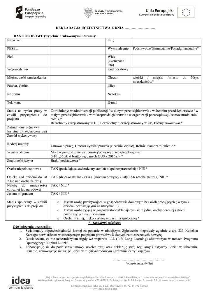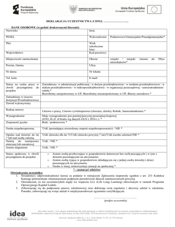 DEKLARACJA UCZESTNICTWA Z DNIA …………………….. DANE OSOBOWE (wypełnić drukowanymi literami): Nazwisko Imię PESEL Wykształcenie Płeć Województwo Wiek (ukończone lata) Kod pocztowy Miejscowość zamieszkania Obszar Powiat, Gmina Ulica Nr domu Nr lokalu Tel. kom. E-mail Status na rynku pracy w chwili przystąpienia do projektu Podstawowe/Gimnazjalne/Ponadgimnazjalne* wiejski / miejski mieszkańców* /miasto do 50tys. Zatrudniony: w administracji publicznej / w dużym przedsiębiorstwie / w średnim przedsiębiorstwie / w małym przedsiębiorstwie / w mikroprzedsiębiorstwie / w organizacji pozarządowej / samozatrudnienie/ rolnik,* Bezrobotny zarejestrowany w UP, Bezrobotny niezarejestrowany w UP, Bierny zawodowo * Zatrudniony w (nazwa Instytucji/Przedsiębiorstwa) Zawód wykonywany Rodzaj umowy Umowa o pracę, Umowa cywilnoprawna (zlecenie, dzieło), Rolnik, Samozatrudnienie * Wynagrodzenie Znajomość języka Moje wynagrodzenie jest poniżej/powyżej przeciętnej krajowej (4101,36 zł. zł brutto wg danych GUS z 2016 r.). * Brak / podstawowa * Osoba niepełnosprawna TAK (posiadająca stwierdzony stopień niepełnosprawności) / NIE * Opieka nad dziećmi do lat 7 lub nad osobą zależną Należę do mniejszości etnicznej lub narodowej Jestem migrantem TAK (dziecko dla lat 7)/TAK (dziecko powyżej 7 lat)/TAK (osoba zależna)/NIE * Status społeczny w chwili przystąpienia do projektu TAK / NIE * TAK / NIE * o o o Jestem osobą przebywająca w gospodarstwie domowym bez osób pracujących ( w tym z dziećmi pozostającymi na utrzymaniu) Jestem osobą żyjącą w gospodarstwie składającym się z jednej osoby dorosłej i dzieci pozostających na utrzymaniu Osoba w innej, niekorzystnej sytuacji na społecznej * * - zaznaczyć właściwe Oświadczenia uczestnika: 1. Świadoma/y odpowiedzialności karnej za podanie w niniejszym Zgłoszeniu nieprawdy zgodnie z art. 233 Kodeksu Karnego potwierdzam własnoręcznym podpisem prawdziwość danych zamieszczonych powyżej. 2. Oświadczam, że nie uczestniczyłem nigdy we wsparciu LLL (Life Long Learning) oferowanym w ramach Programu Operacyjnego Kapitał Ludzki. 3. Zobowiązuję się do podpisania umowy szkoleniowej oraz deklaruję swój regularny i aktywny udział w szkoleniu. Ponadto, zobowiązuję się wziąć udział w międzynarodowym egzaminie certyfikującym. …………………………………….. (podpis uczestnika) „Daj sobie szansę – kurs języka angielskiego dla osób dorosłych o niskich kwalifikacjach na terenie województwa wielkopolskiego” Wielkopolski regionalny Program Operacyjny na lata 2014-2020, Oś Priorytetowa 8: Edukacja, Działanie 8.2: Uczenie się przez całe życie Centrum Językowe IDEA Sp. z o.o. Stary Rynek 71/72, 61-772 Poznań www.idea-polska.com OŚWIADCZENIE UCZESTNIKA PROJEKTU W związku z przystąpieniem do Projektu pn. „Daj sobie szansę – kurs języka angielskiego dla osób dorosłych o niskich kwalifikacjach na terenie województwa Wielkopolskiego oświadczam, że przyjmuję do wiadomości, iż: 1. Administratorem moich danych osobowych jest w odniesieniu do zbioru Wielkopolski Regionalny Program Operacyjny na lata 2014-2020 – Marszałek Województwa Wielkopolskiego mający siedzibę przy ul. Aleje Niepodległości 34, 61-714 Poznań. Natomiast w odniesieniu do zbioru Centralny system teleinformatyczny wspierający realizację programów operacyjnych – Minister Infrastruktury i Rozwoju, mający siedzibę przy ul. Wspólnej2/4, 00-926 Warszawa. 2. Podstawę prawną przetwarzania moich danych osobowych stanowi art. 23 ust. 1 pkt 2 lub art. 27ust. 2 pkt 2 ustawy z dnia 29 sierpnia 1997 r. o ochronie danych osobowych(Dz. U. z 2014 r. poz.1182, z późn. zm.) – dane osobowe są niezbędne dla realizacji Wielkopolskiego Regionalnego Programu Operacyjnego na lata 2014-2020 na podstawie: 1) w odniesieniu do zbioru Centralny System Teleinformatyczny wspierający realizację programów operacyjnych: a) rozporządzenia Parlamentu Europejskiego i Rady (UE) nr 1303/2013 z dnia 17 grudnia 2013 r. ustanawiającego wspólne przepisy dotyczące Europejskiego Funduszu Rozwoju Regionalnego, Europejskiego Funduszu Społecznego, Funduszu Spójności, Europejskiego Funduszu Rolnego na rzecz Rozwoju Obszarów Wiejskich oraz Europejskiego Funduszu Morskiego i Rybackiego oraz ustanawiającego przepisy ogólne dotyczące Europejskiego Funduszu Rozwoju Regionalnego, Europejskiego Funduszu Społecznego, Funduszu Spójności i Europejskiego Funduszu Morskiego i Rybackiego oraz uchylającego rozporządzenie Rady (WE) nr 1083/2006; b) rozporządzenia Parlamentu Europejskiego i Rady (UE) nr 1304/2013 z dnia17 grudnia 2013 r. w sprawie Europejskiego Funduszu Społecznego i uchylającego rozporządzenie Rady (WE) nr 1081/2006; c) ustawy z dnia 11 lipca 2014 r. o zasadach realizacji programów w zakresie polityki spójności finansowanych w perspektywie finansowej 2014–2020; d) rozporządzenia wykonawczego Komisji (UE) nr 1011/2014 z dnia 22 września 2014 r. ustanawiającego szczegółowe przepisy wykonawcze do rozporządzenia Parlamentu Europejskiego i Rady (UE) nr 1303/2013 w odniesieniu do wzorów służących do przekazywania Komisji określonych informacji oraz szczegółowe przepisy dotyczące wymiany informacji między Beneficjentami a instytucjami zarządzającymi, certyfikującymi, audytowymi i pośredniczącymi (Dz. Urz. UE L 286 z 30.09.2014, str. 1). 3. Moje dane osobowe będą przetwarzane wyłącznie w celu realizacji Projektu „Daj sobie szansę – kurs języka angielskiego dla osób dorosłych o niskich kwalifikacjach na terenie województwa Wielkopolskiego” w szczególności potwierdzenia kwalifikowalności wydatków, udzielenia wsparcia, monitoringu, ewaluacji, kontroli, audytu i sprawozdawczości oraz działań informacyjno-promocyjnych w ramach Wielkopolskiego Regionalnego Programu Operacyjnego na lata 2014-2020 (WRPO 2014+). 4. Moje dane osobowe zostały powierzone do przetwarzan