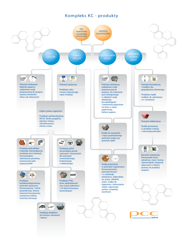 Kom pleks KC - produkty SÓL KAMIENNA I WARZONA ENERGIA ELEKTRYCZNA (chlorek sodu) K W AS S OLN Y C HLOR Przemysł celulozowy (bielenie papieru), uzdatnianie wody przeznaczonej do spożycia (synteza dwutlenku chloru lub chloroamin) Przemysł spożywczy Produkcja cukru i kwasu cytrynowego, mycie instalacji Ciężka synteza organiczna PODCHLORYN SODU Przemysł celulozowy, uzdatnianie wody przeznaczonej do spożycia, do zwalczania życia biologicznego w układach wody chłodniczej, do zapobiegania i hamowania pojawiania się śluzu w masie papierniczej, bielenie papieru Produkcja epichlorohydryny, MCAA, tlenku propylenu, chlorków fosforu, chlorobenzenów, chlorku winylu Produkcja polioli (do produkcji pianek sztywnych i elastycznych dla przemysłu samochodowego, budowlanego i meblarskiego) Produkcja karboksymetylocelulozy (przemysł spożywczy, farmaceutyczny i chemii gospodarczej), betainy (przemysł kosmetyczny), syntetyczna kofeina, witaminy (farmacja) Produkcja PCW, żywic epoksydowych oraz innych polimerów i ich blend (tworzywa konstrukcyjne) Produkcja dodatków do tworzyw sztucznych i betonu Przemysł kosmetyczny i środków dla gospodarstwa domowego Produkcja mydeł, środków do udrażniania rur i kanalizacji Przemysł włókienniczy Środki do czyszczenia i mycia przemysłowego (przemysł spożywczy, przemysł ciężki) Produkcja polisulfidów (materiały chemoodporne), produkcja tarcz ściernych, farmaceutyków, odświeżaczy powietrza, zastosowanie jako rozpuszczalniki WODOROTLENEK SODU Środki pomocnicze w przemyśle organicznym, farmaceutycznym, petrochemicznym i w metalurgii, katalizatory, półprodukty do syntez, składniki maści, środku do ługowania i roztwarzania metali, regeneracja jonitów, produkcja aluminium Środek pomocniczy w produkcji wiskozy i sztucznego jedwabiu Barwniki syntetyczne, farmaceutyki (kwas salicylowy, maści i kremy, chlorowodorki substancji aktywnych w lekach), bioestry do produkcji biopaliw