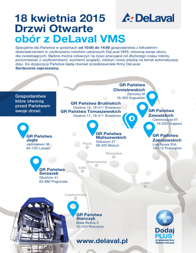 18 kwietnia 2015 Drzwi Otwarte obór z DeLaval VMS Specjalnie dla Państwa w godzinach od 10:00 do 14:00 gospodarstwa z kilkuletnim doświadczeniem w użytkowaniu robotów udojowych DeLaval VMS, otworzą swoje obory dla zwiedzających. Będzie można zobaczyć na żywo pracujące od dłuższego czasu roboty, porozmawiać z użytkownikami, wymienić poglądy, zdobyć nową wiedzę na temat automatyzacji doju. Do dyspozycji Państwa będą również przedstawiciele firmy DeLaval. Serdecznie zapraszamy. GR Państwa Chmielewskich Gospodarstwa które otworzą przed Państwem swoje drzwi: Żarnowo III 16-300 Augustów GR Państwa Brulińskich Osobne 15; 18-411 Śniadowo GR Państwa Tomaszewskich Osobne 17; 18-411 Śniadowo GR Państwa Zawadzkich Ciemnoszyje 47 19-200 Grajewo GR Państwa Maliszewskich GR Państwa Jagła Płock Jędrzejewo 36 64-720 Lubasz GR Państwa Zakrzewskich Gołuszyn 27 09-320 Bieżuń Liza Nowa 25A 18-112 Poświętne Warszawa Skierniewice GR Państwa Seraszek Łódź Głuchów 41 63-860 Pogorzela Lublin Częstochowa GR Państwa Stańczyk Biała Błotna 3 42-425 Kroczyce www.delaval.pl Gospodarstwo Rolne Państwa Brulińskich Zaprasza 18 kwietnia 2015 na dzień otwartych drzwi obory z robotem DeLaval VMS w godz. od 10:00 do 14:00 Obora spełnia wymogi dobrostanu, pozwala na uzyskiwanie doskonałych wyników hodowlanych i produkcyjnych. Cechą charakterystyczną jest podpatrzone w Bawarii wykorzystanie drewna jako budulca. W oborze zastosowano system ruchu „żywienie pierwsze”, krowy mają też kontrolowany dostęp do wybiegu. Oprócz robota udojowego obora jest kompleksowo wyposażona w sprzęt taki jak system usuwania obornika, wygrodzenia legowiskowe i stołu paszowego, poidła, materace, oświetlenie. Interesującym jest także system usuwania gnojowicy z pompą tłoczącą do odległego o 300m zbiornika. Gospodarstwo rodzinne Państwa Brulińskich w Osobnem jest pierwszym gospodarstwem w woj. Podlaskim, które zdecydowało się na automatyczny system doju. Wcześniej gospodarstwo utrzymywało ok. 30 krów w systemie uwięziowym. Po obejrzeniu kilku przykładów obór z robotami w Niemczech zdecydowano się na przystosowanie wiaty na maszyny na zautomatyzowaną oborę. Dokonano importu zwierząt z Niemiec i Czech i we wrześniu 2009 nastąpiło uruchomienie nowej, zautomatyzowanej obory. W ostatnich latach gospodarstwo to jest przykładem doskonałych wyników produkcyjnych i hodowlanych. Gospodarstwo od 2 lat sprzedaje materiał hodowlany własnego chowu. Średnia wydajność krów w roku 2014 ponad 11 000 kg. Trzeci rok z rzędu uzyskano rewelacyjną wydajność ponad 2 tony dziennie mleka z 1 robota. Serdecznie zapraszamy! Joanna, Tomasz i Jakub Brulińscy Osobne 15 18-411 Śniadowo Autoryzowany Dealer DeLaval Krzysztof Białobrzeski Łomża tel. 501 515 301