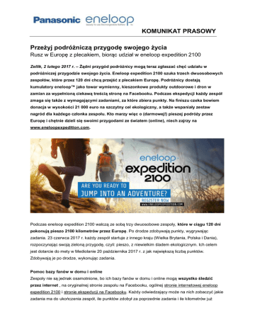 KOMUNIKAT PRASOWY Przeżyj podróżniczą przygodę swojego życia Rusz w Europę z plecakiem, biorąc udział w eneloop expedition 2100 Zellik, 2 lutego 2017 r. – Żądni przygód podróżnicy mogą teraz zgłaszać chęć udziału w podróżniczej przygodzie swojego życia. Eneloop expedition 2100 szuka trzech dwuosobowych zespołów, które przez 120 dni chcą przejść z plecakiem Europę. Podróżnicy dostają kumulatory eneloop™ jako towar wymienny, kieszonkowe produkty outdoorowe i dron w zamian za wypełnioną ciekawą treścią stronę na Facebooku. Podczas ekspedycji każdy zespół zmaga się także z wymagającymi zadaniami, za które zbiera punkty. Na finiszu czeka bowiem donacja w wysokości 21 000 euro na szczytny cel ekologiczny, a także wspaniały zestaw nagród dla każdego członka zespołu. Kto marzy więc o (darmowej!) pieszej podróży przez Europę i chętnie dzieli się swoimi przygodami ze światem (online), niech zajrzy na www.eneloopexpedition.com. Podczas eneloop expedition 2100 walczą ze sobą trzy dwuosobowe zespoły, które w ciągu 120 dni pokonują pieszo 2100 kilometrów przez Europę. Po drodze zdobywają punkty, wygrywając zadania. 23 czerwca 2017 r. każdy zespół startuje z innego kraju (Wielka Brytania, Polska i Dania), rozpoczynając swoją zieloną przygodę, czyli: pieszo, z niewielkim śladem ekologicznym. Ich celem jest dotarcie do mety w Mediolanie 20 października 2017 r. z jak największą liczbą punktów. Zdobywają je po drodze, wykonując zadania. Pomoc bazy fanów w domu i online Zespoły nie są jednak osamotnione, bo ich bazy fanów w domu i online mogą wszystko śledzić przez internet , na oryginalnej stronie zespołu na Facebooku, ogólnej stronie internetowej eneloop expedition 2100 i stronie ekspedycji na Facebooku. Każdy odwiedzający może na nich zobaczyć jakie zadania ma do ukończenia zespół, ile punktów zdobył za poprzednie zadania i ile kilometrów już pokonał. Poprzez media społecznościowe wszystkie zespoły codziennie pozwalają zajrzeć za kulisy przedsięwzięcia i zachęcają ludzi do pomagania w wypełnianiu zadań. Wesprzyj szczytny cel ekologiczny Celem biorących udział jest nie tylko samo doświadczenie, bo każdy zespół wybiera przyjazną środowisku organizację, dla której zbiera fundusze. Na mecie eneloop przekaże 21 000 euro na szczytny cel zwycięskiego zespołu i 2100 euro na organizacje wybrane przez dwa pozostałe zespoły. Oprócz przeżycia wspaniałej przygody i zebrania pieniędzy na szczytny cel każdy członek zespołu wygrywa całe swoje wyposażenie, a do tego świetny pakiet nagród od Panasonic. Dodatkowa moc dzięki eneloop eneloop nie wysyła kandydatów w drogę z pustymi rękami: oprócz tygodniowego kieszonkowego każdy zespół dostaje zestaw wytrzymałych akumulatorów eneloop jako towar wymienny. Baterie są wstępnie ładowane energią słoneczną i można je ładować do 2100 razy – co wyjaśnia od razu, skąd wzięła się liczba kilometrów w nazwie eneloop expedition 2100. Kto wybiera eneloop, wybiera także zrównoważony styl życia. To właśnie idea stojąca za całą ekspedycją. Dlatego właśnie eneloop chętnie wspiera organizacje przyjazne środowisku, z taką samą wizją przyszłości. Uczestniczyć to wygrać Zainteresowanych prosimy o zapisywanie się wraz z drugim członkiem zespołu przed 17 kwietnia 2017 r.. Każdy, kto skończył 18 lat, mieszka w Europie i jest wolny pomiędzy 23 czerwca a 20 października 2017 r., może wziąć udział. Poznaj szczegóły na www.eneloopexpedition.com albo na stronie eneloop expedition 2100 na Facebooku. O Panasonic Energy Europe Panasonic Energy Europe ma siedzibę w Zellik, w pobliżu Brukseli w Belgii. Firma należy do koncernu Panasonic Corporation, międzynarodowego lidera wśród producentów sprzętu elektronicznego i elektrycznego. Dzięki dużemu i wieloletniemu doświadczeniu w dziedzinie elektroniki użytkowej firma Panasonic jest obecnie największym producentem baterii w Europie. Europejskie zakłady produkcyjne są ulokowane w Tessenderlo w Belgii i w Polsce w Gnieźnie. Panasonic Energy Europe dostarcza „mobilną” energię do ponad 30 krajów w Europie. Zróżnicowana gama produktów firmy obejmuje m.in. akumulatory, ładowarki, baterie cynkowo-węglowe, alkaliczne oraz baterie specjalistyczne (cynkowopowietrzne, litowe do aparatów fotograficznych, litowe guzikowe, alkaliczne mikro czy srebrowe). Szczegółowe informacje na stronie: www.panasonic-batteries.com. O firmie Panasonic Panasonic Corporation jest światowym liderem zajmującym się rozwojem i produkcją artykułów elektronicznych do różnorodnego prywatnego, komercyjnego i przemysłowego użytku. Panasonic posiadający swoją siedzibę w Osace (Japonia) na koniec roku obrachunkowego, przypadającego na 31 marca 2015 roku ogłosił, skonsolidowane przychody ze sprzedaży netto w wysokości około 57,28 miliardów euro. Panasonic jest zaangażowany w tworzenie lepszego życia i lepszego świata, stale przyczyniając się do rozwoju społeczeństwa i szczęścia ludzi na całym świecie. Bliższe informacje na temat firmy i marki Panasonic na stronie: www.panasonic.net. PRESS CONTACT ARK Communication Ann-Sophie Cardoen Content & PR Consultant T +32 3 780 96 96 [email protected] www.ark.be Panasonic Energy Europe NV Vicky Raman Brand Marketing Manager T +32 2 467 84 35 [email protected] www.panasonic-batteries.com www.panasonic-eneloop.com