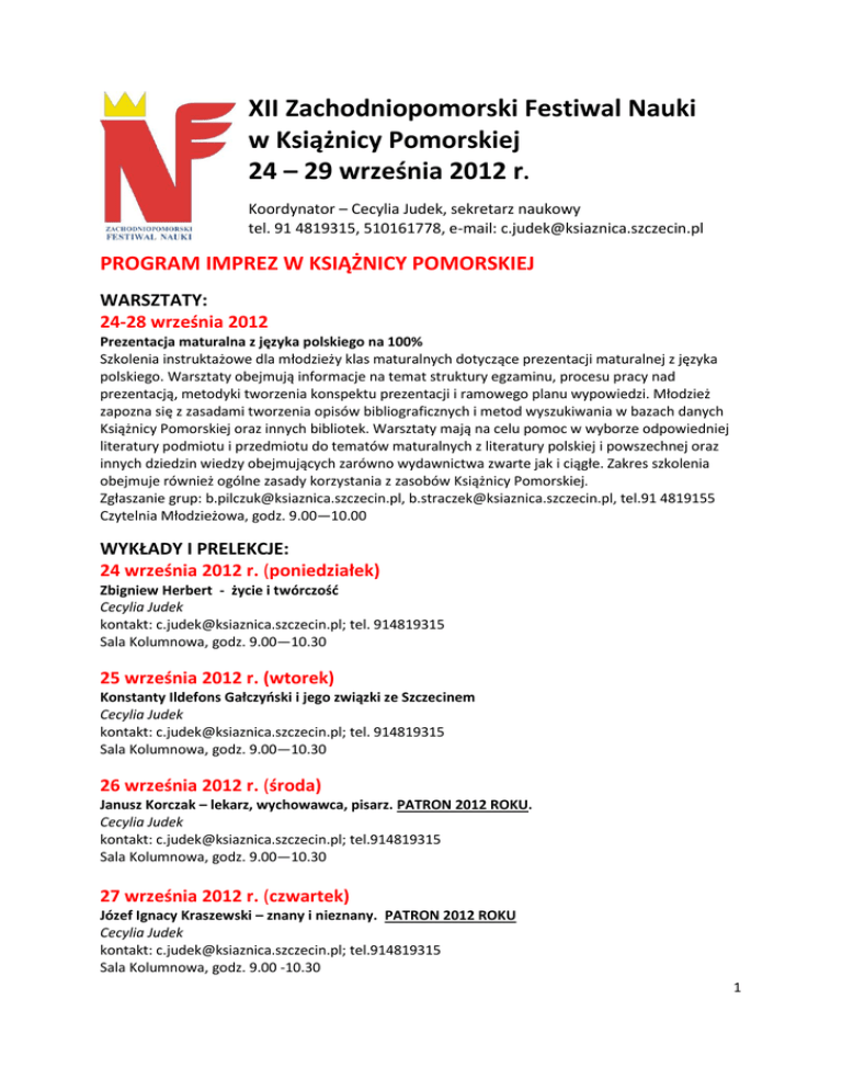 XII Zachodniopomorski Festiwal Nauki w Książnicy Pomorskiej 24 – 29 września 2012 r. Koordynator – Cecylia Judek, sekretarz naukowy tel. 91 4819315, 510161778, e-mail: [email protected] PROGRAM IMPREZ W KSIĄŻNICY POMORSKIEJ WARSZTATY: 24-28 września 2012 Prezentacja maturalna z języka polskiego na 100% Szkolenia instruktażowe dla młodzieży klas maturalnych dotyczące prezentacji maturalnej z języka polskiego. Warsztaty obejmują informacje na temat struktury egzaminu, procesu pracy nad prezentacją, metodyki tworzenia konspektu prezentacji i ramowego planu wypowiedzi. Młodzież zapozna się z zasadami tworzenia opisów bibliograficznych i metod wyszukiwania w bazach danych Książnicy Pomorskiej oraz innych bibliotek. Warsztaty mają na celu pomoc w wyborze odpowiedniej literatury podmiotu i przedmiotu do tematów maturalnych z literatury polskiej i powszechnej oraz innych dziedzin wiedzy obejmujących zarówno wydawnictwa zwarte jak i ciągłe. Zakres szkolenia obejmuje również ogólne zasady korzystania z zasobów Książnicy Pomorskiej. Zgłaszanie grup: [email protected], [email protected], tel.91 4819155 Czytelnia Młodzieżowa, godz. 9.00—10.00 WYKŁADY I PRELEKCJE: 24 września 2012 r. (poniedziałek) Zbigniew Herbert - życie i twórczość Cecylia Judek kontakt: [email protected]; tel. 914819315 Sala Kolumnowa, godz. 9.00—10.30 25 września 2012 r. (wtorek) Konstanty Ildefons Gałczyński i jego związki ze Szczecinem Cecylia Judek kontakt: [email protected]; tel. 914819315 Sala Kolumnowa, godz. 9.00—10.30 26 września 2012 r. (środa) Janusz Korczak – lekarz, wychowawca, pisarz. PATRON 2012 ROKU. Cecylia Judek kontakt: [email protected]; tel.914819315 Sala Kolumnowa, godz. 9.00—10.30 27 września 2012 r. (czwartek) Józef Ignacy Kraszewski – znany i nieznany. PATRON 2012 ROKU Cecylia Judek kontakt: [email protected]; tel.914819315 Sala Kolumnowa, godz. 9.00 -10.30 1 „Internetowa Encyklopedia Szczecina – klikaj po wiedzę”. Czytelnia Pomorzoznawcza, godz. 17.00, kontakt: [email protected]; tel. 91 4819210 Prowadzenie: Arkadiusz Bis (fundacja sedina.pl), założyciel i administrator Portalu Miłośników Dawnego Szczecina sedina.pl. Internetowa Encyklopedia Szczecina, najnowszy projekt realizowany przez fundację sedina.pl przy udziale Miasta Szczecin, to przedsięwzięcie unikatowe w skali kraju – innowacyjne źródło informacji o mieście skupiające całą dostępną wiedzę w jednym miejscu. Źródło niewyczerpalne i fascynujące, bo każdy użytkownik encyklopedii może być zarówno odbiorcą, jak i twórcą jej haseł. Internetowa Encyklopedia, spełniając wszystkie kryteria medium informacyjnego, ma też wyjątkowy atut – wciąga swoich użytkowników w fascynującą podróż po zakamarkach Szczecina, odkrywanych poprzez kolejne kliknięcia. Wycinek możliwości internetowego źródła wiedzy o mieście zaprezentujemy podczas spotkania. Skąd wziął się pomysł na internetową encyklopedię Szczecina, jak do niej zajrzeć i co można w niej znaleźć – opowie Arkadiusz Bis. 28 września 2012 r. (piątek) Życie i twórczość Czesława Miłosza Cecylia Judek kontakt: [email protected]; tel. 91 4819315 Sala Kolumnowa, godz. 9.00 -10.30 LEKCJE, PRELEKCJE ORAZ WYKŁADY POŁĄCZONE Z PREZENTACJĄ MULTIMEDIALNĄ DLA GRUP SZKOLNYCH (terminy poniższych lekcji należy wcześniej uzgodnić z osobami prowadzącymi. Obowiązuje kolejność zgłoszeń): 24-28 września 2012 r. (poniedziałek-piątek) Muzyka na Pomorzu Zachodnim od XVI do XIX wieku – dla uczniów szkół średnich. Termin i godzina do uzgodnienia, wykład w Książnicy Pomorskiej, ewentualnie na zaproszenie w zainteresowanych szkołach. Anna Maria Kowalska kontakt: [email protected]; tel. 91 4819170 Stefan Flukowski , pisarz – warszawiak w Szczecinie Jolanta Liskowacka kontakt: [email protected]; tel. 91 4819175, 510 161 782 Tajemnice ukryte w rękopisach ze zbiorów Książnicy Pomorskiej Jolanta Liskowacka kontakt: [email protected]; tel. 91 4819175; 510 161 782 Kiedy naprawdę urodził się Fryderyk Chopin? Małgorzata Mazikiewicz kontakt: [email protected]; tel. 91 4819170 Nowoczesne bibliotekarstwo sto lat temu i dziś Małgorzata Bartosik kontakt: [email protected]; tel. 91 4819195 2 Mikrofilmy bez szpiega Julita Zioło kontakt: [email protected]; tel. 91 48191270 Dzieje książki . Zajęcia dydaktyczne dla zorganizowanych grup dzieci i młodzieży (6 - 16 lat). Termin i godzina do uzgodnienia, wykład w Książnicy Pomorskiej, ewentualnie na zaproszenie w zainteresowanych szkołach. Bogna Tokarska kontakt: [email protected]; tel. 91 4819175 Xawery Dunikowski w Szczecinie Bogna Tokarska kontakt: [email protected]; tel. 91 4819175 Piotr Skarga, patriota i publicysta. PATRON 2012 ROKU dr Agnieszka Borysowska kontakt: [email protected]; tel.91 4819175 Andreas Müller (1630-1694), słynny orientalista i skandalista z Gryfina dr Agnieszka Borysowska kontakt: [email protected]; tel. 91 4819175 Szczecińscy drukarze w XVI - XVIII w. Alicja Łojko kontakt: [email protected]; tel. 91 4819177 Jak się żyło w Szczecinie w XVIII wieku? Agata Michalska kontakt: [email protected]; tel. 91 4819177 Dziedzictwo kulturowe regionu w regionalnych, krajowych i światowych zasobach bibliotek cyfrowych Lilia Marcinkiewicz, Lucyna Karbownik kontakt: [email protected]; tel. 91 48 19 122, 510 161 786 Mój pierwszy biznes - jak założyć firmę! Spotkania dla grup zorganizowanych w dn. 17-22.09.2012 jedynie w godz. 8.00 - 10.00 - Czytelnia Informacji Gospodarczej i Prawnej Janusz Glapa kontakt: [email protected], tel. 91 4819230 Tajemnice konserwacji zabytkowych zbiorów bibliotecznych dr Wojciech Łopuch kontakt: [email protected], tel. 91 4819263 Sala 613, godz. 9-10.00 Warsztaty bibliograficzne (bibliografia załącznikowa, normy bibliograficzne, dokumenty elektroniczne, zasady dot. cytowania w pracach naukowych) - dla licealistów i studentów Sylwia Wesołowska i Beata Niemaszyk 