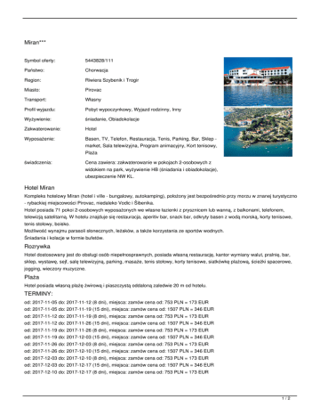 Miran*** Symbol oferty: 5443828/111 Państwo: Chorwacja Region: Riwiera Szybenik i Trogir Miasto: Pirovac Transport: Własny Profil wyjazdu: Pobyt wypoczynkowy, Wyjazd rodzinny, Inny Wyżywienie: śniadanie, Obiadokolacje Zakwaterowanie: Hotel Wyposażenie: Basen, TV, Telefon, Restauracja, Tenis, Parking, Bar, Sklep - market, Sala telewizyjna, Program animacyjny, Kort tenisowy, Plaża świadczenia: Cena zawiera: zakwaterowanie w pokojach 2-osobowych z widokiem na park, wyżywienie HB (śniadania i obiadokolacje), ubezpieczenie NW KL. Hotel Miran Kompleks hotelowy Miran (hotel i ville - bungalowy, autokamping), położony jest bezpośrednio przy morzu w znanej turystyczno - rybackiej miejscowości Pirovac, niedaleko Vodic i Šibenika. Hotel posiada 71 pokoi 2-osobowych wyposażonych we własne łazienki z prysznicem lub wanną, z balkonami, telefonem, telewizją satelitarną. W hotelu znajduje się restauracja, aperitiv bar, snack bar, odkryty basen z wodą morską, korty tenisowe, tenis stołowy, boisko. Możliwość wynajmu parasoli słonecznych, leżaków, a także korzystania ze sportów wodnych. Śniadania i kolacje w formie bufetów. Rozrywka Hotel dostosowany jest do obsługi osób niepełnosprawnych, posiada własną restaurację, kantor wymiany walut, pralnię, bar, sklep, wystawę, sejf, salę telewizyjną, parking, masaże, tenis stołowy, korty tenisowe, siatkówkę plażową, ścieżki spacerowe, jogging, wieczory muzyczne. Plaża Hotel posiada własną plażę żwirową i piaszczystą oddaloną zaledwie 20 m od hotelu. TERMINY: od: 2017-11-05 do: 2017-11-12 (8 dni), miejsca: zamów cena od: 753 PLN = 173 EUR od: 2017-11-05 do: 2017-11-19 (15 dni), miejsca: zamów cena od: 1507 PLN = 346 EUR od: 2017-11-12 do: 2017-11-19 (8 dni), miejsca: zamów cena od: 753 PLN = 173 EUR od: 2017-11-12 do: 2017-11-26 (15 dni), miejsca: zamów cena od: 1507 PLN = 346 EUR od: 2017-11-19 do: 2017-11-26 (8 dni), miejsca: zamów cena od: 753 PLN = 173 EUR od: 2017-11-19 do: 2017-12-03 (15 dni), miejsca: zamów cena od: 1507 PLN = 346 EUR od: 2017-11-26 do: 2017-12-03 (8 dni), miejsca: zamów cena od: 753 PLN = 173 EUR od: 2017-11-26 do: 2017-12-10 (15 dni), miejsca: zamów cena od: 1507 PLN = 346 EUR od: 2017-12-03 do: 2017-12-10 (8 dni), miejsca: zamów cena od: 753 PLN = 173 EUR od: 2017-12-03 do: 2017-12-17 (15 dni), miejsca: zamów cena od: 1507 PLN = 346 EUR od: 2017-12-10 do: 2017-12-17 (8 dni), miejsca: zamów cena od: 753 PLN = 173 EUR 1/2 CENNIK: Długość pobytu: 8 dni 15 dni Grupa cenowa: A A (-) (-) 70 140 18 36 Wyżywienie (do wyboru) (*) śniadania i obiadokolacje śniadanie, obiad, kolacja Inne (opcjonalne) pokój z widokiem na morze Pobyt w obiekcie (do wyboru) pokój 2-osobowy + dostawka standardowo dla osób: 3 (-) pokój 1-osobowy 30 % (*) pokój 2-osobowy COMFORT+dostawka+dziecko 0-6 lat standardowo dla osób: 2 (-) Rodzaj osoby (do wyboru) dziecko 3-12 lat na dostawce osoba dorosła na dostawce dziecko 3-12 lat na 1.lub 2. łóżku w DBL (*) osoba dorosła (*) ubezpieczenie NW KL ubezpieczene NW KL windsurfing - sporty wodne Inne (obligatoryjne) (*) pakiet w/g świadczeń Ubezpieczenie (opcjonalne) ubezpieczenie - od kosztów rezygnacji (-) -50 % -20 % -20 % -20 % -20 % Inne (opcjonalne) Ubezpieczenie (do wyboru) 30 % -50 % (-) dziecko 0-3 lat na dostawce z 2 osobami dorosłymi -100 % Łóżeczko dla dziecka 0-3 lat (-) (-) -100 % 42 84 7 14 15 30 166 332 2.4 % 2.4 % Waluta: EUR Aktualne ceny z systemu S.A.R.T. (-) - cena usługi, podatku kalkulowana przy osobie lub gratis (*) - kwota wliczona w cenę standardową 2/2