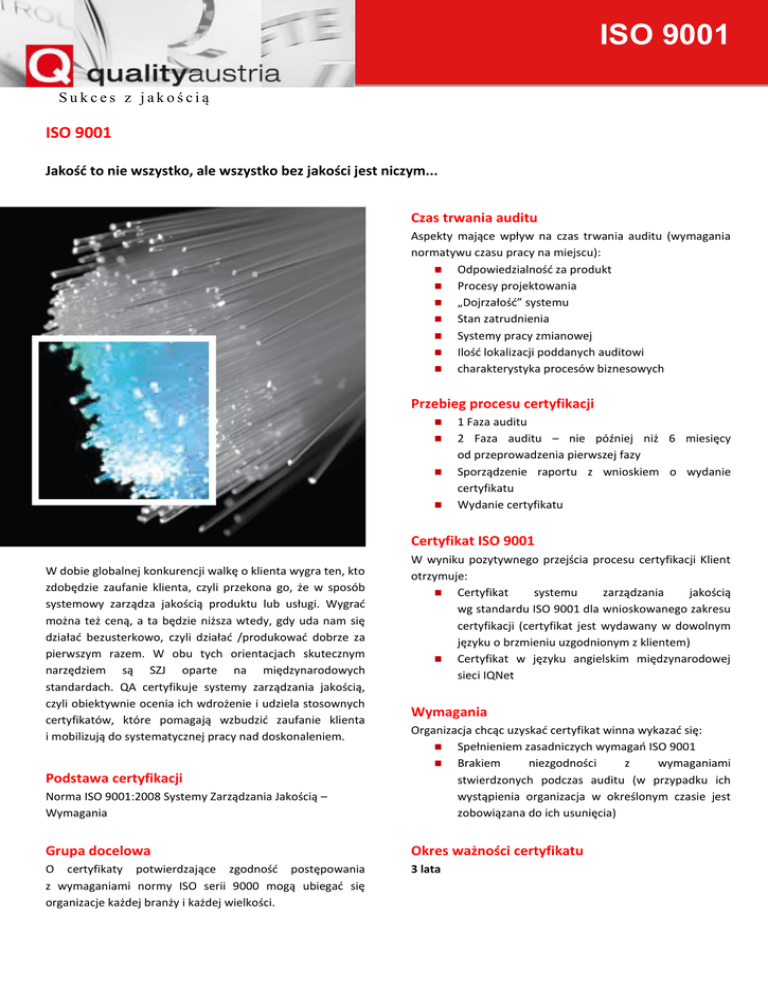 ISO 9001 Sukces z jakością ISO 9001 Jakość to nie wszystko, ale wszystko bez jakości jest niczym... Czas trwania auditu Aspekty mające wpływ na czas trwania auditu (wymagania normatywu czasu pracy na miejscu): Odpowiedzialność za produkt Procesy projektowania „Dojrzałość” systemu Stan zatrudnienia Systemy pracy zmianowej Ilość lokalizacji poddanych auditowi charakterystyka procesów biznesowych Przebieg procesu certyfikacji 1 Faza auditu 2 Faza auditu – nie później niż 6 miesięcy od przeprowadzenia pierwszej fazy Sporządzenie raportu z wnioskiem o wydanie certyfikatu Wydanie certyfikatu Certyfikat ISO 9001 W dobie globalnej konkurencji walkę o klienta wygra ten, kto zdobędzie zaufanie klienta, czyli przekona go, że w sposób systemowy zarządza jakością produktu lub usługi. Wygrać można też ceną, a ta będzie niższa wtedy, gdy uda nam się działać bezusterkowo, czyli działać /produkować dobrze za pierwszym razem. W obu tych orientacjach skutecznym narzędziem są SZJ oparte na międzynarodowych standardach. QA certyfikuje systemy zarządzania jakością, czyli obiektywnie ocenia ich wdrożenie i udziela stosownych certyfikatów, które pomagają wzbudzić zaufanie klienta i mobilizują do systematycznej pracy nad doskonaleniem. W wyniku pozytywnego przejścia procesu certyfikacji Klient otrzymuje: Certyfikat systemu zarządzania jakością wg standardu ISO 9001 dla wnioskowanego zakresu certyfikacji (certyfikat jest wydawany w dowolnym języku o brzmieniu uzgodnionym z klientem) Certyfikat w języku angielskim międzynarodowej sieci IQNet Wymagania Norma ISO 9001:2008 Systemy Zarządzania Jakością – Wymagania Organizacja chcąc uzyskać certyfikat winna wykazać się: Spełnieniem zasadniczych wymagań ISO 9001 Brakiem niezgodności z wymaganiami stwierdzonych podczas auditu (w przypadku ich wystąpienia organizacja w określonym czasie jest zobowiązana do ich usunięcia) Grupa docelowa Okres ważności certyfikatu O certyfikaty potwierdzające zgodność postępowania z wymaganiami normy ISO serii 9000 mogą ubiegać się organizacje każdej branży i każdej wielkości. 3 lata Podstawa certyfikacji ISO 9001 Sukces z jakością Zasady nadzoru Warunkiem utrzymania ważności certyfikatu jest przeprowadzenie auditów nadzorujących przez jednostkę certyfikującą. I audit nadzorczy w terminie nie późniejszym niż 12 miesięcy od daty I auditu certyfikacyjnego, II audit nadzorczy w terminie 24 (+/- 3) miesiące od daty I auditu certyfikacyjnego Korzyści dla Klienta Wiele czynników przemawia za wprowadzeniem Systemów Zarządzania na zgodność z normą ISO 9001, a także na zgodność z wymagania nami branżowymi: Wzmocniona orientacja na klienta, zrozumiały wzrost zadowolenia klienta Redukcja reklamacji Istotny spadek kosztów procesowych Pozytywny wpływ na ciągły rozwój organizacji i jej wewnętrznej komunikacji Wzrost motywacji pracowników Wzrost świadomości w zakresie odpowiedzialności pracowników Znaczna optymalizacja procesu oceny Istotny wzrost wartości firmy Znaczna oszczędność kosztów i zasobów Znaczący wkład w zakresie ochrony know-how Zakończona sukcesem certyfikacja systemów zarządzania umożliwia w wielu przypadkach wpis na listę kwalifikowanego dostawcy certyfikację systemów zarządzania na zgodność z międzynarodowymi standardami i krajowymi wymaganiami, aż po oceny w oparciu o model doskonałości EFQM. Quality Austria jest akredytowana przez BMWFJ w zakresie certyfikacji systemów zarządzania i certyfikacji personelu. Posiada również liczne, międzynarodowe dopuszczenia. Quality Austria z ponad 650 audytorami, trenerami i ekspertami technicznymi zapewnienia skuteczny transfer wiedzy, kompetencji i doświadczenia. Ścisły związek krajowego przedstawiciela z międzynarodowymi organizacjami tj. IQNet, EOQ i EFQM, a także współpraca z firmami: IPC, VDA-QMC , IATF dają niepowtarzalną szansę aktywnego uczestniczenia w wypracowywaniu wymagań standardów, które staną się powszechne w niedalekiej przyszłości. Stawia to klientów Quality Austria w niezwykle uprzywilejowanej pozycji. Ponad 12 tys. klientów w prawie 50 krajach osiąga poprzez tę współpracę wymierne korzyści, uzyskując efekt synergii. Kontakt MICHAŁ KUBISTA Dyrektor Marketingu i Działu Szkoleń Auditor, Trener +48 516 687 768 [email protected] Akredytacja Quality Austria od lipca 1993 roku posiada akredytację na certyfikowanie organizacji wg ISO 9001, nadaną rozporządzeniem Ministerstwa Gospodarki Austrii. O Quality Austria Quality Austria GmbH jest Państwa kompetentnym partnerem dla zintegrowanych systemów zarządzania w zakresie jakości, środowiska, bezpieczeństwa pracy i standardów branżowych. Usługi świadczone przez Quality Austria obejmują zakres od szkoleń w zakresie międzynarodowych trendów i metod zarządzania, poprzez Quality Austria Polska Sp. z o.o. ul. Żwirki i Wigury 14 43-190 Mikołów Polska Tel.: +48 32 226 60 07 Fax: +48 32 216 26 41 e-mail: [email protected] web: www.qualityaustria.com.pl ISO 9001 Sukces z jakością www.qualityaustria.com.pl
