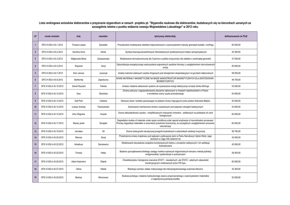 Lista rankingowa wniosków doktorantów o przyznanie stypendium w ramach projektu pt. "Stypendia naukowe dla doktorantów, kształcacych się na kierunkach uznanych za szczególnie istotne z punktu widzenia rozwoju Województwa Lubuskiego" w 2012 roku LP numer wniosku imię nazwisko tytuł pracy doktorskiej dofinansowanie (w PLN) 1 DFS.VI.052.4.43.1.2012 Tomasz Łukasz Zawadzki Proceduralne modelowanie obiektów trójwymiarowych z wykorzystaniem hybrydy gramatyki kształtu i morfingu 60 000,00 2 DFS.VI.052.4.43.2.2012 Karolina Anna Górka Synteza bezrozpuszczalnikowych fotoreaktywnych poliakrylanowych klejów samoprzylepnych 40 350,00 3 DFS.VI.052.4.43.3.2012 Małgorzata Maria Zubaszewska Modelowanie termodynamicznej siły Casimira w pobliżu krytyczności dla układów o zamkniętej geometrii 37 000,00 4 DFS.VI.052.4.43.5.2012 Wojciech Goryl Optymalizacja energetycznego wykorzystania regionalnych zasobów biomasy z uwzględnieniem skumulowanych emisji 59 000,00 5 DFS.VI.052.4.43.7.2012 Artur Janusz Juszczyk Analiza nośności stalowych rusztów drogowych pod obciążeniem eksploatacyjnym na gruntach słabonośnych 58 000,00 6 DFS.VI.052.4.43.8.2012 Bartłomiej Zapotoczny NOWE MATERIAŁY MAGNETYCZNE NA BAZIE NANOSTRUKTUR MAGNETYCZNYCH DLA ZASTOSOWAŃ BIOMEDYCZNYCH 46 700,00 7 DFS.VI.052.4.43.10.2012 Daniel Ryszard Fekieta Analiza i badanie właściwości systemu do wytwarzania energii elektrycznej na bazie silnika Stirlinga 53 500,00 54 000,00 8 DFS.VI.052.4.43.12.2012 Ewa Głosińska Zmiany pokrycia i zagospodarowania obszarów zalewowych w miastach nadodrzańskich w Polsce w kontekście oceny ryzyka powodziowego 9 DFS.VI.052.4.43.13.2012 Olaf Piotr Ciebiera Kleszcze (Acari: Ixodida) pasożytujące na ptakach (Aves) migrujących przez polskie Wybrzeże Bałtyku 50 000,00 10 DFS.VI.052.4.43.14.2012 Łukasz Andrzej Faściszewski Zachowanie mechaniczne struktur czaszkowych pod wpływem obciążeń balistycznych 43 000,00 11 DFS.VI.052.4.43.15.2012 Artur Zbigniew Kurpiel Ocena odkształcalności wysoko - modyfikowanych mieszanek mineralno - asfaltowych na podstawie ich cech reologicznych 60 000,00 12 DFS.VI.052.4.43.17.2012 Maciej Jacek Sznajder Degradation studies of materials under space conditions;under special emphasize of recombination processes/ Procesy degradacji materiałów w warunkach przestrzeni kosmicznej, ze szczególnym uwzględnieniem procesów rekombinacji 60 000,00 13 DFS.VI.052.4.43.18.2012 Jarosław Gil Ocena izolacyjności akustycznej przegród budowlanych w placówkach edukacji muzycznej 56 700,00 14 DFS.VI.052.4.43.20.2012 Mariusz Goraj Przestrzenne zmiany krajobrazu pod wpływem użytkowania ziemi w Parku Narodowym Ujście Warty i jego okolicach w ciągu 400 ostatnich lat 42 000,00 15 DFS.VI.052.4.43.22.2012 Arkadiusz Denisiewicz Modelowanie dwuskalowe związków konstytutywnych betonu z proszków reaktywnych i ich walidacja doświadczalna 45 000,00 16 DFS.VI.052.4.43.25.2012 Tomasz Hałas Badania uporządkowania bliskiego zasięgu molekuł wybranych trójpochodnych benzenu metodą dyfrakcji rentgenowskiej i spektroskopii w podczerwieni 28 400,00 17 DFS.VI.052.4.43.26.2012 Adam Kazimierz Olejnik Charakterystyka i biologiczne znaczenie STAT1 - niezależnych, ale STAT2 - zależnych odpowiedzi transkrypcyjnych mediowanych przez IFN typu 60 000,00 18 DFS.VI.052.4.43.27.2012 Olena Hebda Redukcja rozmiaru układu matrycowego dla mikroprogramowanego automatu Moore'a 35 300,00 19 DFS.VI.052.4.43.29.2012 Bartosz Minorowicz Budowa prototypu i badania hydraulicznego zaworu proporcjonalnego z wykorzystaniem materiałów z magnetyczną pamięcią kształtu 52 000,00