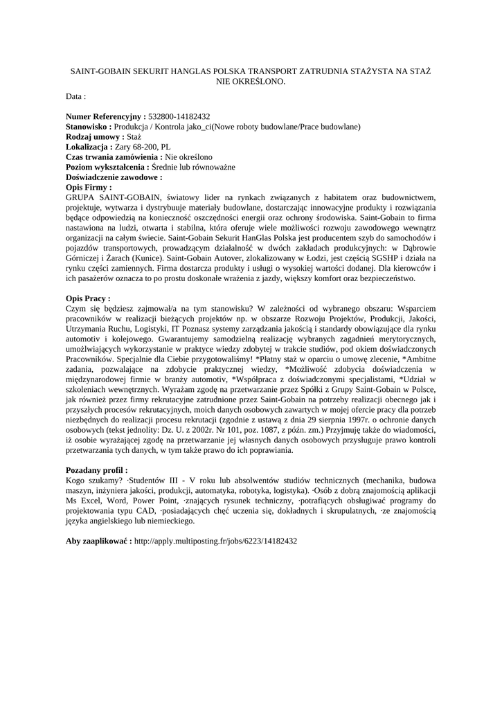 SAINT-GOBAIN SEKURIT HANGLAS POLSKA TRANSPORT ZATRUDNIA STAŻYSTA NA STAŻ NIE OKREŚLONO. Data : Numer Referencyjny : 532800-14182432 Stanowisko : Produkcja / Kontrola jako_ci(Nowe roboty budowlane/Prace budowlane) Rodzaj umowy : Staż Lokalizacja : Zary 68-200, PL Czas trwania zamówienia : Nie określono Poziom wykształcenia : Średnie lub równoważne Doświadczenie zawodowe : Opis Firmy : GRUPA SAINT-GOBAIN, światowy lider na rynkach związanych z habitatem oraz budownictwem, projektuje, wytwarza i dystrybuuje materiały budowlane, dostarczając innowacyjne produkty i rozwiązania będące odpowiedzią na konieczność oszczędności energii oraz ochrony środowiska. Saint-Gobain to firma nastawiona na ludzi, otwarta i stabilna, która oferuje wiele możliwości rozwoju zawodowego wewnątrz organizacji na całym świecie. Saint-Gobain Sekurit HanGlas Polska jest producentem szyb do samochodów i pojazdów transportowych, prowadzącym działalność w dwóch zakładach produkcyjnych: w Dąbrowie Górniczej i Żarach (Kunice). Saint-Gobain Autover, zlokalizowany w Łodzi, jest częścią SGSHP i działa na rynku części zamiennych. Firma dostarcza produkty i usługi o wysokiej wartości dodanej. Dla kierowców i ich pasażerów oznacza to po prostu doskonałe wrażenia z jazdy, większy komfort oraz bezpieczeństwo. Opis Pracy : Czym się będziesz zajmował/a na tym stanowisku? W zależności od wybranego obszaru: Wsparciem pracowników w realizacji bieżących projektów np. w obszarze Rozwoju Projektów, Produkcji, Jakości, Utrzymania Ruchu, Logistyki, IT Poznasz systemy zarządzania jakością i standardy obowiązujące dla rynku automotiv i kolejowego. Gwarantujemy samodzielną realizację wybranych zagadnień merytorycznych, umożlwiających wykorzystanie w praktyce wiedzy zdobytej w trakcie studiów, pod okiem doświadczonych Pracowników. Specjalnie dla Ciebie przygotowaliśmy! *Płatny staż w oparciu o umowę zlecenie, *Ambitne zadania, pozwalające na zdobycie praktycznej wiedzy, *Możliwość zdobycia doświadczenia w międzynarodowej firmie w branży automotiv, *Współpraca z doświadczonymi specjalistami, *Udział w szkoleniach wewnętrznych. Wyrażam zgodę na przetwarzanie przez Spółki z Grupy Saint-Gobain w Polsce, jak również przez firmy rekrutacyjne zatrudnione przez Saint-Gobain na potrzeby realizacji obecnego jak i przyszłych procesów rekrutacyjnych, moich danych osobowych zawartych w mojej ofercie pracy dla potrzeb niezbędnych do realizacji procesu rekrutacji (zgodnie z ustawą z dnia 29 sierpnia 1997r. o ochronie danych osobowych (tekst jednolity: Dz. U. z 2002r. Nr 101, poz. 1087, z późn. zm.) Przyjmuję także do wiadomości, iż osobie wyrażającej zgodę na przetwarzanie jej własnych danych osobowych przysługuje prawo kontroli przetwarzania tych danych, w tym także prawo do ich poprawiania. Pozadany profil : Kogo szukamy? ∙Studentów III - V roku lub absolwentów studiów technicznych (mechanika, budowa maszyn, inżyniera jakości, produkcji, automatyka, robotyka, logistyka). ∙Osób z dobrą znajomością aplikacji Ms Excel, Word, Power Point, ∙znających rysunek techniczny, ∙potrafiących obsługiwać programy do projektowania typu CAD, ∙posiadających chęć uczenia się, dokładnych i skrupulatnych, ∙ze znajomością języka angielskiego lub niemieckiego. Aby zaaplikować : http://apply.multiposting.fr/jobs/6223/14182432