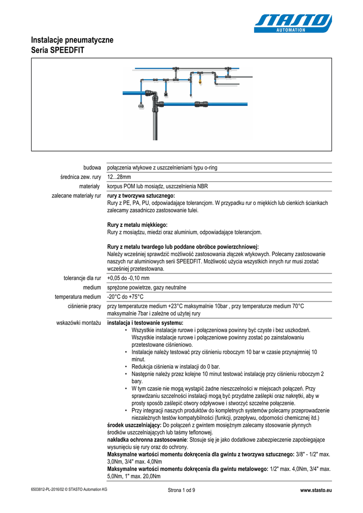Instalacje pneumatyczne Seria SPEEDFIT budowa średnica zew. rury materiały zalecane materiały rur połączenia wtykowe z uszczelnieniami typu o-ring 12...28mm korpus POM lub mosiądz, uszczelnienia NBR rury z tworzywa sztucznego: Rury z PE, PA, PU, odpowiadające tolerancjom. W przypadku rur o miękkich lub cienkich ściankach zalecamy zasadniczo zastosowanie tulei. Rury z metalu miękkiego: Rury z mosiądzu, miedzi oraz aluminium, odpowiadające tolerancjom. Rury z metalu twardego lub poddane obróbce powierzchniowej: Należy wcześniej sprawdzić możliwość zastosowania złączek wtykowych. Polecamy zastosowanie naszych rur aluminiowych serii SPEEDFIT. Możliwość użycia wszystkich innych rur musi zostać wcześniej przetestowana. tolerancje dla rur medium temperatura medium ciśnienie pracy wskazówki montażu 6503812-PL-2016/02 © STASTO Automation KG +0,05 do -0,10 mm sprężone powietrze, gazy neutralne -20°C do +75°C przy temperaturze medium +23°C maksymalnie 10bar , przy temperaturze medium 70°C maksymalnie 7bar i zależne od użytej rury instalacja i testowanie systemu: • Wszystkie instalacje rurowe i połączeniowa powinny być czyste i bez uszkodzeń. Wszystkie instalacje rurowe i połączeniowe powinny zostać po zainstalowaniu przetestowane ciśnieniowo. • Instalacje należy testować przy ciśnieniu roboczym 10 bar w czasie przynajmniej 10 minut. • Redukcja ciśnienia w instalacji do 0 bar. • Następnie należy przez kolejne 10 minut testować instalację przy ciśnieniu roboczym 2 bary. • W tym czasie nie mogą wystąpić żadne nieszczelności w miejscach połączeń. Przy sprawdzaniu szczelności instalacji mogą być przydatne zaślepki oraz nakrętki, aby w prosty sposób zaślepić otwory odpływowe i stworzyć szczelne połączenie. • Przy integracji naszych produktów do kompletnych systemów polecamy przeprowadzenie niezależnych testów kompatybilności (funkcji, przepływu, odporności chemicznej itd.) środek uszczelniający: Do połączeń z gwintem mosiężnym zalecamy stosowanie płynnych środków uszczelniających lub taśmy teflonowej. nakładka ochronna zastosowanie: Stosuje się je jako dodatkowe zabezpieczenie zapobiegające wysunięciu się rury oraz do ochrony. Maksymalne wartości momentu dokręcenia dla gwintu z tworzywa sztucznego: 3/8" - 1/2" max. 3,0Nm, 3/4" max. 4,0Nm Maksymalne wartości momentu dokręcenia dla gwintu metalowego: 1/2" max. 4,0Nm, 3/4" max. 5,0Nm, 1" max. 20,0Nm Strona 1 od 9 www.stasto.eu złączka prosta z gwintem zewnętrznym, gwint walcowy, uszczelnienie o-ring materiał: POM gwint średnica zew. rury L1 SW typ G3/8" 12 30,5 24 65.038-12 G1/2" 12 34,5 27 65.012-12 G1/2" 15 38,5 27 65.012-15 G1/2" 18 58,5 30 65.012-18 G3/4" 22 61,0 32 65.034-22 złączka prosta materiał: POM średnica zew. rury L1 typ 12 51,0 67.012 15 62,0 67.015 18 65,0 67.018 22 71,0 67.022 28 91,0 67.028 złączka kątowa materiał: POM średnica zew. rury L1 L2 typ 12 32,0 32,0 68.012 15 37,0 37,0 68.015 18 44,0 44,0 68.018 22 49,0 49,0 68.022-A 28 60,0 60,0 68.028 złączka T materiał: POM średnica zew. rury L1 L2 typ 12 65,0 32,0 69.012 15 73,0 37,0 69.015 18 89,0 44,0 69.018 22 98,0 49,0 69.022 28 121,0 60,0 69.028 złączka redukcyjna T materiał: POM 6503812-PL-2016/02 © STASTO Automation KG średnica zew. rury 1 średnica zew. rury 2 L1 L2 typ 18 15 84,5 37,9 70.018-15 22 15 90,6 41,6 70.022-15 Strona 2 od 9 www.stasto.eu końcówka rurowa materiał: POM średnica zew. rury długość typ 12 28,0 80.012 15 31,0 80.015 22 38,6 80.022 wodooddzielacz do rury 22mm Zapobiega dostaniu się wody do przewodów spustowych. Dzięki zastosowaniu wodooddzielacza w kształcie trójnika można uniknąć tak zwanych “łyżek drenażowych". Ta zaawansowana technika uniemożliwia wtargnięcie wody kondensacyjnej do przewodów spustowych. Przy instalacji tej złączki należy zwrócić uwagę na jej poziomie ułożenie. Złączka jest odpowiednio oznaczona, co ułatwia jej prawidłowy montaż. średnica zew. rury L1 L2 typ 22 98,0 72,0 81.022 średnica zew. rury L1 typ 28 24,8 81.028-S 1. wilgotne powietrze 2. suche powietrze 3. wodooddzielacz wododdzielacz do rur 28mm Zapobiega dostaniu się wody do przewodów spustowych. 1. Wetknąć w rurę mosiężny wkład 81.028-S. 2. Rurę z wkładem wcisnąć do oporu w złączkę T. Po przekręceniu nakrętki o 1/4 obrotu połączenie zostaje podwójnie zabezpieczone. Tym samym unika się wtargnięcia wody do przewodów spustowych. kolanko naścienne materiał: mosiądz 6503812-PL-2016/02 © STASTO Automation KG gwint średnica zew. rury L1 L2 typ G1/2" 15 47,0 66,4 82.015 G3/4" 22 52,0 79,0 82.022 Strona 3 od 9 www.stasto.eu króciec z gwintem zewnętrznym, gwint stożkowy lub walcowy materiał: mosiądz gwint średnica zew. rury długość typ R1/2" 15 56,0 83.012-15 R3/4" 22 68,0 83.034-22 G3/4" 28 80,0 83.034-28 G1" 28 80,5 83.100-28 złączka z gwintem zewnętrznym, gwint stożkowy materiał: mosiądz gwint średnica zew. rury długość typ R1/2" 15 40,5 84.012-15 R3/4" 22 53,5 84.034-22 R1" 28 68,0 84.100-28 króciec z gwintem wewnętrznym, gwint walcowy materiał: mosiądz gwint średnica zew. rury długość typ G1/2" 15 54,5 85.012-15 G3/4" 22 64,5 85.034-22 puszka rozdzielacza powietrza 5 x G1/2” gwint wewnętrzny do wkręcania adapterów, 3 x samouszczelniające śruby zaślepiające do otworów gwintowych, 1 x G1/2” do szybkozłączki materiał: POM kolor typ czarny 86.012-A puszka rozdzielacza powietrza z 2 zaślepkami materiał: aluminium 6503812-PL-2016/02 © STASTO Automation KG wejście wyjście typ G1/2" 3 x G1/2" 87.012 G3/4" 3 x G1/2" 87.034 Strona 4 od 9 www.stasto.eu obejma do rury Do mocowania na ścianie sztywnych rur z PA lub aluminium. materiał: tworzywo sztuczne średnica zew. rury typ 12 88.012 15 88.015 18 88.018 22 88.022 28 88.028 pierścień zabezpieczający materiał: POM średnica zew. rury kolor typ 12 czerwony 91.012 15 szary 91.015 18 szary 91.018 22 sz