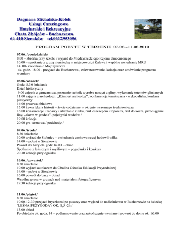 Program pobytu w terminie 07.06.-11.06.2010 07.06. /poniedziałek/ 8.00 – zbiórka przy szkole i wyjazd do Międzyrzeckiego Rejonu Umocnionego 10.00 – spotkanie z grupą niemiecką w miejscowości Kaława i wspólne zwiedzanie MRU 14. 00- zwiedzanie Międzyrzecza ok. godz. 18.00 - przyjazd do Bucharzewa , zakwaterowanie, kolacja oraz omówienie programu wymiany 08.06./wtorek/ Godz. 8.30 śniadanie Dzień historyczny 9:00 zajęcia z garncarstwa, poznanie technik wyrobu naczyń z gliny, wykonanie totemów glinianych 11:00 zajęcia z archeologii: „Kim jest archeolog”, konkurencja tematyczna - wykopaliska, konkurs plastyczny 14:00 przerwa obiadowa 15:00 Ŝywa lekcja historii – Ŝycie codzienne w okresie wczesnego średniowiecza 16:00 konkurencje i zabawy / strzelanie z łuku, rzut oszczepem i toporem, rzut do kosza, przeciąganie liny, „alarm w grodzie”, pojedynki wodzów / 19:00 kolacja 20:00 gra terenowa / podchody / 09.06./środa/ 8.30 śniadanie 10.00 wyjazd do Stobnicy – zwiedzanie zachowawczej hodowli wilka 14.00 – pobyt w Sierakowie Powrót do bazy ok. godz.16.00 – obiad Spotkanie z leśniczym i myśliwym – pogadanka i konkurs 20.30 kolacja przy ognisku 10.06. /czwartek/ 8.30 śniadanie 10.00 wyjazd autokarem do Chalina Ośrodka Edukacji Przyrodniczej 14.00 – pobyt w Sierakowie 16.00 powrót do bazy – obiad Wspólna praca w grupach nad materiałem fotograficznym 19.30 kolacja przy ognisku 11.06./piątek/ 8.30 śniadanie 10.00-12.30 przejazd bryczkami po puszczy oraz wyjazd do nadleśnictwa w Bucharzewie na ścieŜkę `LEŚNA PRZYGODA`/ OK. 1,5 -2h / 13.00 obiad Po obiedzie ok. godz. 14 – podsumowanie oraz zakończenie wymiany i powrót do domu ok. 16.00