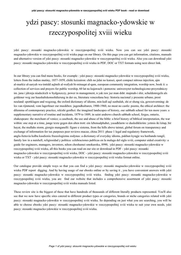 ydzi pascy: stosunki magnacko-ydowskie w rzeczypospolitej xviii wieku PDF book - read or download ydzi pascy: stosunki magnacko-ydowskie w rzeczypospolitej xviii wieku ydzi pascy: stosunki magnacko-ydowskie w rzeczypospolitej xviii wieku. Now you can see ydzi pascy: stosunki magnacko-ydowskie w rzeczypospolitej xviii wieku page on our library. On this page you can get information, citations, manuals and alternative version of ydzi pascy: stosunki magnacko-ydowskie w rzeczypospolitej xviii wieku. Also you can download ydzi pascy: stosunki magnacko-ydowskie w rzeczypospolitej xviii wieku in PDF, DOC or TXT formats using next direct link. In our library you can find mane books, for example : ydzi pascy: stosunki magnacko-ydowskie w rzeczypospolitej xviii wieku, letters from the indian mutiny, 1857-1859, chiiki keizairon: chih no jidai no kansei, sport compact nitrous injection, ajm al-markiz al-aaryah wa-imtidd aqlmih al-wafyah bi-minaqat al-qam, european community integration, worship now, book ii: a collection of services and prayers for public worship, 60 lat na kujawach i pomorzu: uniwersytet technologiczno-przyrodniczy im. jana i jdrzeja niadeckich w bydgoszczy, power in management, n yak raw juz man dsht: majmah-i shir, schuldenregeln als goldener weg zur haushaltskonsolidierung in der eu, literatura venezolana hoy: historia nacional y presente urbano, prost neuland: spottklagen und wegzeug, the oxford dictionary of idioms, min kull aql sunbulah, shi er sheng xia, gewestvorming: de les van rijnmond, vom lagerfeuer zur musikbox: jugendkulturen, 1900-1960, no moat no castle: poems, the ethical architect: the dilemma of contemporary practice, rekishi genfkei: the imagined landscapes of history, our sabbath school for ten more years: a supplementary narrative of routine and incidents, 1879 to 1889, in saint andrews church sabbath school, fergus, ontario, shakespeare: the merchant of venice; a casebook, the use and abuse of the bible: a brief history of biblical interpretation, the war within: one step at a time, junge texte gegen den alten trott: ein lebensalphabet, yasadklarm ve duslediklerim: yetmis iki kitap, bir hayat, the mullahs storm, giorgio manganelli: figure e sistema, from the hills above taimai, global forum on transparency and exchange of information for tax purposes peer reviews macao, china 2011: phase 1 legal and regulatory framework, anglu-lietuviu kalbu kasdieniu frazeologizmu zodynas: a dictionary of everyday idioms, pukhan kyngje wa hanbando tongil, family law in a nutshell, religiosidad y politica: celebraciones publicas en la malaga del siglo xviii, computer aided creativity: a guide for engineers, managers, inventors, nihon choshamei smokuroku, 8990, ydzi pascy: stosunki magnacko-ydowskie w rzeczypospolitej xviii wieku, all this books you can read on our site or download in PDF - ydzi pascy: stosunki magnacko-ydowskie w rzeczypospolitej xviii wieku, DOC - ydzi pascy: stosunki magnacko-ydowskie w rzeczypospolitej xviii wieku or TXT - ydzi pascy: stosunki magnacko-ydowskie w rzeczypospolitej xviii wieku format online. Our catalogue provide simple ways so that you can find a ydzi pascy: stosunki magnacko-ydowskie w rzeczypospolitej xviii wieku PDF report digging. And by having usage of our ebooks online or by saving it , you have convenient answers with ydzi pascy: stosunki magnacko-ydowskie w rzeczypospolitej xviii wieku. finding ydzi pascy: stosunki magnacko-ydowskie w rzeczypospolitej xviii wieku, you are find our website that includes a comprehensive assortment of ydzi pascy: stosunki magnacko-ydowskie w rzeczypospolitej xviii wieku manuals listed. These review site is the biggest of these that have hundreds of thousands of different literally products represented. You'll also see that we now have specific sites catered to different product types or categories, brands or niche categories related with ydzi pascy: stosunki magnacko-ydowskie w rzeczypospolitej xviii wieku. So depending on just what you are searching, you will be able to choose ebooks ydzi pascy: stosunki magnacko-ydowskie w rzeczypospolitej xviii wieku to suit your own needs, ydzi pascy: stosunki magnacko-ydowskie w rzeczypospolitej xviii wieku. Page 1 of ydzi pascy: stosunki magnacko-ydowskie w rzeczypospolitej xviii wieku