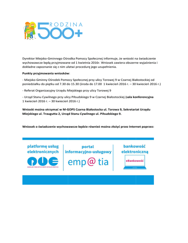 Dyrektor Miejsko-Gminnego Gminnego Ośrodka Pomocy Społecznej informuje, że wnioski na świadczenie wychowawcze będą przyjmowane od 1 kwietnia 2016r. Wniosek zawiera obszerne wyjaśnienia i dokładne zapoznanie się z nim ułatwi procedurę jego uzupełnienia. Punkty przyjmowania wniosków: wniosków - Miejsko-Gminny minny Ośrodek Pomocy Społecznej przy ulicy Torowej 9 w Czarnej Białostockiej od poniedziałku do piątku od 7.30 do 15.30 (środa do 17.00 1 kwiecień 2016 r. – 30 kwiecień 2016 r.) - Referat Organizacyjny Urzędu Miejskiego przy ulicy Torowej 9 - Urząd Stanu Cywilnego przy ulicy Piłsudskiego 9 w Czarnej Białostockiej (sala (sala konferencyjna 1 kwiecień 2016 r. – 30 kwiecień 2016 r.) Wnioski można otrzymać w M-GOPS GOPS Czarna Białostocka ul. Torowa 9, Sekretariat Urzędu Miejskiego ul. Traugutta 2, Urząd Stanu Cywilnego ul. Piłsudskiego Piłs 9. Wniosek o świadczenie wychowawcze będzie również można złożyć przez Internet poprzez: