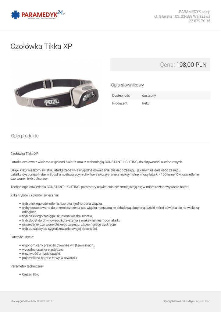 PARAMEDYK sklep ul. Gilarska 103, 03-589 Warszawa 22 679 70 16 Czołówka Tikka XP Cena: 198,00 PLN Opis słownikowy Dostępność dostępny Producent Petzl Opis produktu Czołówka Tikka XP Latarka czołowa z wieloma wiązkami światła oraz z technologią CONSTANT LIGHTING, do aktywności outdoorowych. Dzięki kilku wiązkom światła, latarka zapewnia wygodne oświetlenie bliskiego zasięgu, jak również dalekiego zasięgu. Latarka dysponuje trybem Boost umożliwiającym chwilowe skorzystanie z maksymalnej mocy latarki - 160 lumenów, oświetlenie czerwone i tryb pulsujący. Technologia oświetlenia CONSTANT LIGHTING: parametry oświetlenia nie zmniejszają się w miarę rozładowywania baterii. Kilka trybów i kolorów świecenia: tryb bliskiego oświetlenia: szeroka i jednorodna wiązka, tryby dostosowane do przemieszczenia się: wiązka mieszana ze składową skupioną, dzięki której oświetla się na większą odległość. tryb dalekiego zasięgu: skupiona wiązka światła, tryb Boost do chwilowego korzystania z maksymalnej mocy latarki, oświetlenie czerwone bliskiego zasięgu, zapewniające dyskrecję, tryb pulsujący do sygnalizowania swojej obecności. Łatwość użycia: ergonomiczny przycisk (również w rękawiczkach), wygodna opaska elastyczna możliwość umycia opaski, pojemnik na baterie łatwy w otwarciu. Parametry techniczne: Ciężar: 85 g Plik wygenerowano: 08-03-2017 Oprogramowanie sklepu: AptusShop PARAMEDYK sklep ul. Gilarska 103, 03-589 Warszawa 22 679 70 16 Technologia: CONSTANT LIGHTING Wiązka: mieszana Zasilanie: 3 baterie AAA/R03 (dostarczane z czołówką) Kompatybilność:: akumulatorki Ni-MH / baterie litowe Certyfikacja: CE Stopień ochrony: IP X4 (wodoodporna) Galeria Plik wygenerowano: 08-03-2017 Powered by TCPDF (www.tcpdf.org) Oprogramowanie sklepu: AptusShop