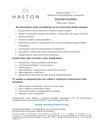 Haston City Hotel * * * * aktualnie poszukuje kandydatów na stanowisko: KUCHARZ/ KUCHARKA Miejsce pracy: Wrocław Do obowiązków osoby zatrudnionej na tym stanowisku będzie należało: przygotowanie wyrobów kulinarnych w oparciu o ustalone receptury, dbałość o wysoką jakość przygotowanych potraw – porcjowanie, dekorowanie, estetyczny sposób serwowania, terminowe i szybkie wydawanie posiłków, utrzymywanie czystości w miejscu pracy wraz z właściwym eksploatowaniem urządzeń technicznych, przestrzeganie właściwej technologii procesów kulinarnych, przydzielanie i nadzorowanie zadań wykonywanych przez personel pomocniczy, obsługa kulinarna imprez plenerowych i konferencji, Oczekiwania, jakie stawiamy wobec Kandydatów: doświadczenie w pracy na podobnym stanowisku, wykształcenie kierunkowe – gastronomiczne, dyspozycyjność, odpowiedzialność i zaangażowanie w powierzone obowiązki, dobra organizacja systemu pracy, aktualna książeczka zdrowia do celów sanitarno-epidemiologicznych, W zamian za zaangażowanie oraz wkład w realizację wyznaczonych celów oferujemy: pełnowymiarowe zatrudnienie w oparciu o umowę o pracę, pracę w młodym i dynamicznym zespole, możliwość korzystania z bogatego pakietu socjalnego, atrakcyjny system wynagrodzeń. Zainteresowane osoby prosimy o przesłanie kompletu dokumentów (CV, list motywacyjny) z podaniem nazwy stanowiska KUCHARZ w tytule wiadomości na adres: [email protected] Uprzejmie informujemy, że skontaktujemy się z wybranymi osobami. Do przesyłanej oferty prosimy dołączyć oświadczenie: „Wyrażam zgodę na przetwarzanie przez Haston City Hotel Sp. z o.o. z siedzibą we Wrocławiu, 51-117, ul. Irysowa 1-3, danych osobowych zawartych w mojej ofercie pracy dla potrzeb niezbędnych do realizacji procesu rekrutacji oraz po jego zakończeniu (zgodnie z Ustawą z dn. 29.08.97 o Ochronie danych Osobowych Dz. U. nr 133 poz. 883 z późn. zm.)”.