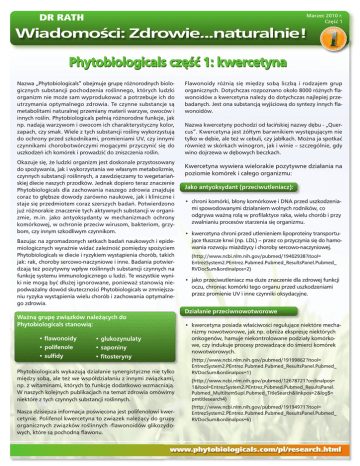Marzec 2010 r. Część 1 DR RATH Wiadomości: Zdrowie...naturalnie! Phytobiologicals część 1: kwercetyna Nazwa „Phytobiologicals” obejmuje grupę różnorodnych biologicznych substancji pochodzenia roślinnego, których ludzki organizm nie może sam wyprodukować a potrzebuje ich do utrzymania optymalnego zdrowia. Te czynne substancje są metabolitami naturalnej przemiany materii warzyw, owoców i innych roślin. Phytobiologicals pełnią różnorodne funkcje, jak np. nadają warzywom i owocom ich charakterystyczny kolor, zapach, czy smak. Wiele z tych substancji rośliny wykorzystują do ochrony przed szkodnikami, promieniami UV, czy innymi czynnikami chorobotwórczymi mogącymi przyczynić się do uszkodzeń ich komórek i prowadzić do zniszczenia roślin. Okazuje się, że ludzki organizm jest doskonale przystosowany do spożywania, jak i wykorzystania we własnym metabolizmie, czynnych substancji roślinnych, a zawdzięczamy to wegetariańskiej diecie naszych przodków. Jednak dopiero teraz znaczenie Phytobiologicals dla zachowania naszego zdrowia znajduje coraz to głębsze dowody zarówno naukowe, jak i kliniczne i staje się przedmiotem coraz szerszych badań. Potwierdzono już różnorakie znaczenie tych aktywnych substancji w organizmie, m.in. jako antyoksydanty w mechanizmach ochrony komórkowej, w ochronie przeciw wirusom, bakteriom, grzybom, czy innym szkodliwym czynnikom. Bazując na zgromadzonych setkach badań naukowych i epidemiologicznych wyraźnie widać zależność pomiędzy spożyciem Phytobiologicals w diecie i ryzykiem wystąpienia chorób, takich jak: rak, choroby sercowo-naczyniowe i inne. Badania potwierdzają też pozytywny wpływ roślinnych substancji czynnych na funkcję systemu immunologicznego u ludzi. Te wszystkie wyniki nie mogą być dłużej ignorowane, ponieważ stanowią niepodważalny dowód skuteczności Phytobiologicals w zmniejszaniu ryzyka wystąpienia wielu chorób i zachowania optymalnego zdrowia. Flawonoidy różnią się między sobą liczbą i rodzajem grup organicznych. Dotychczas rozpoznano około 8000 różnych flawonoidów a kwercetyna należy do dotychczas najlepiej przebadanych. Jest ona substancją wyjściową do syntezy innych flawonoidów. Nazwa kwercetyny pochodzi od łacińskiej nazwy dębu - „Quercus”. Kwercetyna jest żółtym barwnikiem występującym nie tylko w dębie, ale też w cebuli, czy jabłkach. Można ja spotkać również w skórkach winogron, jak i winie – szczególnie, gdy wino dojrzewa w dębowych beczkach. Kwercetyna wywiera wielorakie pozytywne działania na poziomie komórek i całego organizmu: Jako antyoksydant (przeciwutleniacz): • chroni komórki, błony komórkowe i DNA przed uszkodzeniami spowodowanymi działaniem wolnych rodników, co odgrywa ważną rolą w profilaktyce raka, wielu chorób i przy zwalnianiu procesów starzenia się organizmu. • kwercetyna chroni przed utlenieniem lipoproteiny transportujące tłuszcze krwi (np. LDL) – przez co przyczynia się do hamowania rozwoju miażdżycy i choroby sercowo-naczyniowej. (http://www.ncbi.nlm.nih.gov/pubmed/19402938?itool= EntrezSystem2.PEntrez.Pubmed.Pubmed_ResultsPanel.Pubmed_ RVDocSum&ordinalpos=2) • jako przeciwutleniacz ma duże znaczenie dla zdrowej funkcji oczu, chroniąc komórki tego organu przed uszkodzeniami przez promienie UV i inne czynniki oksydacyjne. Działanie przeciwnowotworowe Ważną grupę związków należących do Phytobiologicals stanowią: • flawonoidy • polifenole • sulfidy • kwercetyna posiada właściwości regulujące niektóre mechanizmy nowotworowe, jak np. obniża ekspresję niektórych onkogenów, hamuje niekontrolowane podziały komórkowe, czy indukuje procesy prowadzące do śmierci komórek nowotworowych. • glukozynulaty • saponiny • fitosteryny Phytobiologicals wykazują działanie synergistyczne nie tylko między sobą, ale też we współdziałaniu z innymi związkami, np. z witaminami, których to funkcję dodatkowo wzmacniają. W naszych kolejnych publikacjach na temat zdrowia omówimy niektóre z tych czynnych substancji roślinnych. Nasza dzisiejsza informacja poświęcona jest polifenolowi kwercetynie. Polifenol kwercetyna to związek należący do grupy organicznych związków roślinnych -flawonoidów glikozydowych, które są pochodną flawonu. (http://www.ncbi.nlm.nih.gov/pubmed/19199862?itool= EntrezSystem2.PEntrez.Pubmed.Pubmed_ResultsPanel.Pubmed_ RVDocSum&ordinalpos=1) (http://www.ncbi.nlm.nih.gov/pubmed/12678721?ordinalpos= 1&itool=EntrezSystem2.PEntrez.Pubmed.Pubmed_ResultsPanel. Pubmed_MultiItemSupl.Pubmed_TitleSearch&linkpos=2&log$= pmtitlesearch4) (http://www.ncbi.nlm.nih.gov/pubmed/19194971?itool= EntrezSystem2.PEntrez.Pubmed.Pubmed_ResultsPanel.Pubmed_ RVDocSum&ordinalpos=6) www.phytobiologicals.com/pl/research.html Marzec 2010 r. Część 1 DR RATH Wiadomości: Zdrowie...naturalnie! Działanie przeciwzapalne: Korzystne działanie przy cukrzycy: • kwercetyna wykazuje skuteczność w hamowaniu kluczowego etapu w kaskadzie mechanizmów zapalnych, jak również znacząco hamuje aktywność enzymów i pośredników stanów zapalnych i przez to wpływa pozytywnie na przebieg wszystkich procesów zapalnych. • kwercetyna blokuje enzym, który jest odpowiedzialny za gromadzenie się sorbitolu w komórkach. Podwyższony poziom sorbitolu może prowadzić do powikłań układu nerwowego, oczu i nerek szczególnie u diabetyków. (http://www.ncbi.nlm.nih.gov/pubmed/16959220?itool= EntrezSystem2.PEntrez.Pubmed.Pubmed_ResultsPanel.Pubmed_ RVDocSum&ordinalpos=2) • kwercytyna w synergii z EGCG wykazuje skuteczność w działaniach przeciwzapalnych i przeciwalergicznych. (http://www.ncbi.nlm.nih.gov/pubmed/19516153?itool= EntrezSystem2.PEntrez.Pubmed.Pubmed_ResultsPanel.Pubmed_ RVDocSum&ordinalpos=2) • Kwercetyna wpływa pozytywnie na obniżenie ryzyka rozwoju cukrzycy typu II. (http://www.ncbi.nlm.nih.gov/pubmed/12198000?itool= EntrezSystem2.PEntrez.Pubmed.Pubmed_Re