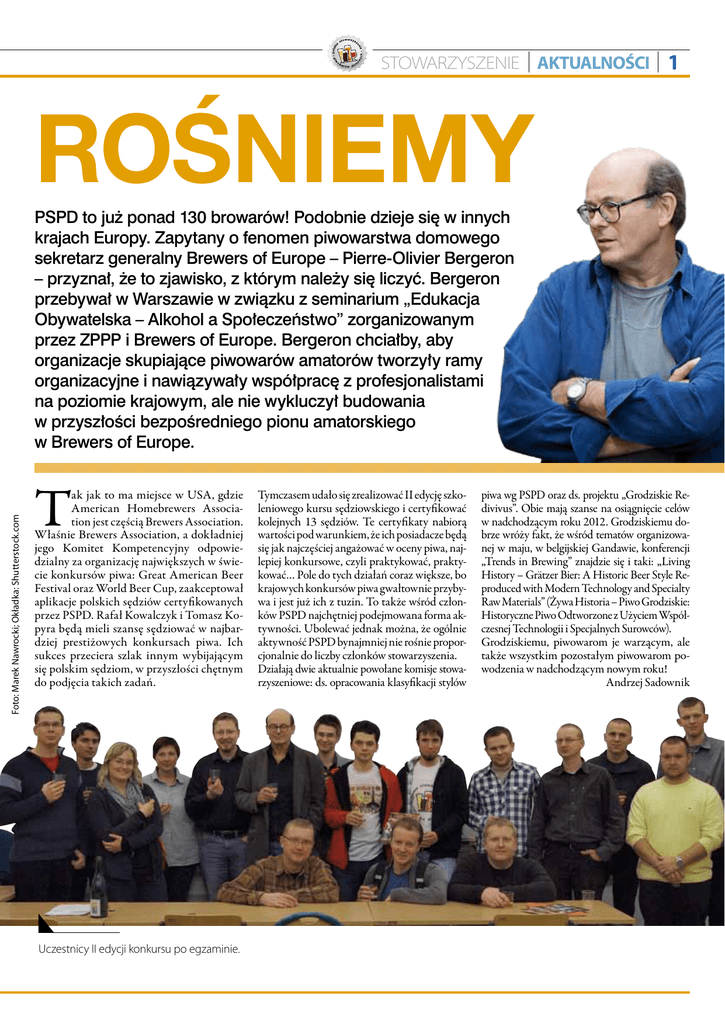 STOWARZYSZENIE AKTUALNOŚCI 1 Rośniemy Foto: Marek Nawrocki; Okładka: Shutterstock.com PSPD to już ponad 130 browarów! Podobnie dzieje się w innych krajach Europy. Zapytany o fenomen piwowarstwa domowego sekretarz generalny Brewers of Europe – Pierre-Olivier Bergeron – przyznał, że to zjawisko, z którym należy się liczyć. Bergeron przebywał w Warszawie w związku z seminarium „Edukacja Obywatelska – Alkohol a Społeczeństwo” zorganizowanym przez ZPPP i Brewers of Europe. Bergeron chciałby, aby organizacje skupiające piwowarów amatorów tworzyły ramy organizacyjne i nawiązywały współpracę z profesjonalistami na poziomie krajowym, ale nie wykluczył budowania w przyszłości bezpośredniego pionu amatorskiego w Brewers of Europe. T ak jak to ma miejsce w USA, gdzie American Homebrewers Association jest częścią Brewers Association. Właśnie Brewers Association, a dokładniej jego Komitet Kompetencyjny odpowiedzialny za organizację największych w świecie konkursów piwa: Great American Beer Festival oraz World Beer Cup, zaakceptował aplikacje polskich sędziów certyfikowanych przez PSPD. Rafał Kowalczyk i Tomasz Kopyra będą mieli szansę sędziować w najbardziej prestiżowych konkursach piwa. Ich sukces przeciera szlak innym wybijającym się polskim sędziom, w przyszłości chętnym do podjęcia takich zadań. Uczestnicy II edycji konkursu po egzaminie. Tymczasem udało się zrealizować II edycję szkoleniowego kursu sędziowskiego i certyfikować kolejnych 13 sędziów. Te certyfikaty nabiorą wartości pod warunkiem, że ich posiadacze będą się jak najczęściej angażować w oceny piwa, najlepiej konkursowe, czyli praktykować, praktykować… Pole do tych działań coraz większe, bo krajowych konkursów piwa gwałtownie przybywa i jest już ich z tuzin. To także wśród członków PSPD najchętniej podejmowana forma aktywności. Ubolewać jednak można, że ogólnie aktywność PSPD bynajmniej nie rośnie proporcjonalnie do liczby członków stowarzyszenia. Działają dwie aktualnie powołane komisje stowarzyszeniowe: ds. opracowania klasyfikacji stylów piwa wg PSPD oraz ds. projektu „Grodziskie Redivivus”. Obie mają szanse na osiągnięcie celów w nadchodzącym roku 2012. Grodziskiemu dobrze wróży fakt, że wśród tematów organizowanej w maju, w belgijskiej Gandawie, konferencji „Trends in Brewing” znajdzie się i taki: „Living History – Grätzer Bier: A Historic Beer Style Reproduced with Modern Technology and Specialty Raw Materials” (Żywa Historia – Piwo Grodziskie: Historyczne Piwo Odtworzone z Użyciem Współczesnej Technologii i Specjalnych Surowców). Grodziskiemu, piwowarom je warzącym, ale także wszystkim pozostałym piwowarom powodzenia w nadchodzącym nowym roku! Andrzej Sadownik