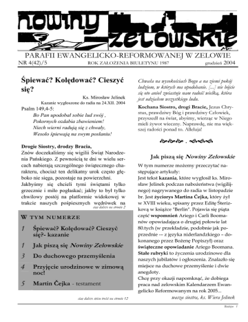 PARAFII EWANGELICKO-REFORMOWANEJ W ZELOWIE NR 4(42)/5 ROK ZAŁOŻENIA BIULETYNU 1987 Śpiewać? Kolędować? Cieszyć się? Ks. Mirosław Jelinek Kazanie wygłoszone do radia na 24.XII. 2004 Psalm 149,4-5: Bo Pan upodobał sobie lud swój , Pokornych ozdabia zbawieniem! Niech wierni radują się z chwały, Wesoło śpiewają na swym posłaniu! Drogie Siostry, drodzy Bracia, Znów doczekaliśmy się wigilii Świąt Narodzenia Pańskiego. Z pewnością te dni w wielu sercach nabierają szczególnego świątecznego charakteru, chociaż ten delikatny urok często głęboko nie sięga, pozostaje na powierzchni. Jakbyśmy się chcieli tymi świętami tylko grzecznie i miło pogłaskać; jakby to był tylko chwilowy postój na platformie widokowej w trakcie naszych pośpiesznych wędrówek na ciąg dalszy na stronie 2 W TYM NUMERZE 1 Śpiewać? Kolędować? Cieszyć się?- kazanie 1 3 4 Jak piszą się Nowiny Zelowskie 5 Martin Čejka - testament Do duchowego przemyślenia Przyjęcie urodzinowe w zimową noc! ciąg dalszy spisu treści na stronie 12 grudzień 2004 Chwała na wysokościach Bogu a na ziemi pokój ludziom, w których ma upodobanie. [...] nie bójcie się oto anioł zwiastuje nam radość wielką, która jest udziałem wszystkiego ludu. Kochana Siostro, drogi Bracie, Jezus Chrystus, prawdziwy Bóg i prawdziwy Człowiek, przyszedł na świat, abyśmy, wierząc w Niego mieli żywot wieczny. Naprawdę, nie ma większej radości ponad to. Alleluja! . Jak piszą się Nowiny Zelowskie W tym numerze możemy przeczytać następujące artykuły: Jest tekst kazania, które wygłosił ks. Mirosław Jelinek podczas nabożeństwa (wigilijnego) nagrywanego do radia w listopadzie br. Jest życiorys Martina Čejka, który żył w XVIII wieku, spisany przez Editę Śterizkovą w książce "Berlin". Pojawia się piąta część wspomnień Ariego i Carli Boomanów opowiadająca o drugiej połowie lat 80.tych (w przekładzie, podobnie jak poprzednie -– z języka niderlandzkiego – dokonanego przez Bożenę Popiszył) oraz świąteczne opowiadanie Ariego Boomana. Stałe rubryki to życzenia urodzinowe dla naszych jubilatów i ogłoszenia. Znalazło się miejsce na duchowe przemyślenie i dwie anegdoty. Chcę przy okazji napomknąć, że dobiega praca nad zelowskim Kalendarzem Ewangelicko Reformowanym na rok 2005... wasza siostra, ks. Wiera Jelinek Biuletyn 1 ciąg dalszy ze strony 1 zakurzonych szlakach życia; jakby to była tylko woń igliwia i świec wśród smrodu spalin i zanieczyszczeń; jakby to był tylko kawałek poczciwego ciasta między wyrafinowanymi delikatesami; jakby to był starodawny obrazek pomiędzy wrzaskiem radia i migającymi kineskopami. I za to wyciszenie chcemy być wdzięczni, za to wyczuwanie innego świata. Ale nie możemy pozostać tylko z powierzchniowym, sentymentalnym nastrojem. Przecież możemy dostać o wiele więcej, mało tego -wszystko! Jeśli pozwolimy wieści biblijnej powiedzieć sobie o co chodzi między świętym Bogiem i nami grzesznymi ludźmi. Przecież to tam jest jądro Świąt Narodzenia Pańskiego, w tym Bożym akcie, który sięga tej ziemi i naszego życia. Chcemy je sobie przybliżyć za pomocą słów naszego tekstu, który jest oczywiście tylko przed-obrazem, figurą stylistyczną radości wigilijnej, ale wyraża to, co staje się naszą własnością poprzez narodziny betelejemskiego Dzieciątka. Bo Pan upodobał sobie lud swój , Pokornych ozdabia zbawieniem! W Bibli Kralickiej i w Biblii Gdańskiej nad każdym dłuższym akapitem są króciutkie streszczenia kolejnego tekstu. Takie resume tego fragmentu mówi, że "prorok tymi słowy pobudza Kościół do uwielbienia Boga, za przyjęte od Niego, z łaski, zbawienie". W jaki sposób to Jego zbawienie jest ukazane w przyjściu Jezusa Chrystusa? Jego narodzenie najpierw nam ogłasza, że Bóg nas bardzo kocha. Mimo naszych grzechów i win, mimo naszej niesławy, fałszu i skąpstwa, niewdzięczności i zawiści, znalazł w nas upodobanie. Jeśli tylko pomyślimy o tym słabym ludzie Starego Testamentu z całą jego niewiernością wobec Przymierza z Bogiem, z całym jego narzekaniem na pustyni i bałwochwalstwem w ziemi kanaanejskiej, niechęcią do wyciągnięcia lekcji z ciężkich doświadczeń - musimy wpaść w zachwyt nad Bożą cierpliwością i nad tym, że Bóg nieustannie "upodobywał" Sobie swój lud – jakby wciąż na nowo się w nim „zakochiwał” i, że doszło do tego radykalnego i podstawowego umiłowania w postaci narodzenia obiecanego Mesjasza. I musimy również z wdzięcznością zachwycać się tym, że i nam dzisiaj może być ogłaszane: Bo Pan upodobał sobie lud swój. Mimo naszego lichego i pokrętnego sposobu wyznawania Boga jako naszego Pana i Zbawiciela oraz mimo naszego sprzeniewierzania się służbie i miłości Chrystusa. Mimo to wszystko - i do dzisiejszego świata wysyłana jest wiadomość: Dziś narodził się wam Zbawiciel, którym jest Chrystus Pan". A to dlatego, że Pan upodobał sobie lud swój. Boże umiłowanie, upodobanie w nas ludziach, jest największym blaskiem i największą chwałą wigilii Świąt Narodzenia Pańskiego. Jesteśmy obdarzeni miłością, chociaż mamy świadomość, że nie zasługujemy na absolutnie żadną miłość. I co teraz? Fakt, że to Boże upodobanie i zmiłowanie mogą przyjąć jedynie pokorni sercem. On pokornych ozdabia zbawieniem! Do Świąt Narodzenia Pańskiego przynależy pokora i świadomość naszej nędzy przed Bogiem. Domyślmy się głębi pokory Bożej, kiedy przychodzi w postaci najuboższego dziecka. W takim poniżeniu odwiedza ziemię. A my wciąż myślimy coś o sobie. Jakże często, właśnie podczas Świąt Narodzenia Pańskiego, ludzie wysoko cenią to, na co ich stać, na co sobie mogą pozwolić właśnie w te święta, dumni z tego, co są w stanie dać swoim dzieciom. I nie chodzi tylko o te rzeczy zewnętrzne, chodzi przede wszystkim o naszą wewnętrzną samowystarczalność i zaspokoje