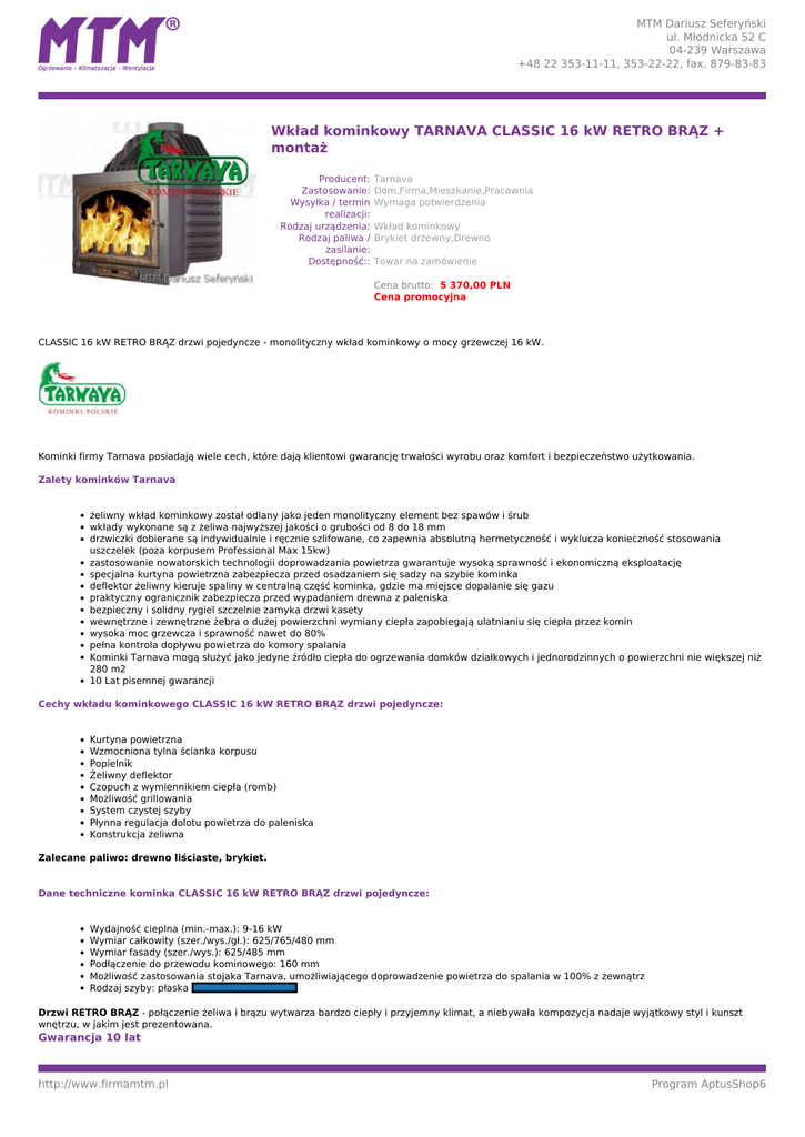 MTM Dariusz Seferyński ul. Młodnicka 52 C 04-239 Warszawa +48 22 353-11-11, 353-22-22, fax. 879-83-83 Wkład kominkowy TARNAVA CLASSIC 16 kW RETRO BRĄZ + montaż Producent: Zastosowanie: Wysyłka / termin realizacji: Rodzaj urządzenia: Rodzaj paliwa / zasilanie: Dostępność:: Tarnava Dom,Firma,Mieszkanie,Pracownia Wymaga potwierdzenia Wkład kominkowy Brykiet drzewny,Drewno Towar na zamówienie Cena brutto: 5 370,00 PLN Cena promocyjna CLASSIC 16 kW RETRO BRĄZ drzwi pojedyncze - monolityczny wkład kominkowy o mocy grzewczej 16 kW. Kominki firmy Tarnava posiadają wiele cech, które dają klientowi gwarancję trwałości wyrobu oraz komfort i bezpieczeństwo użytkowania. Zalety kominków Tarnava żeliwny wkład kominkowy został odlany jako jeden monolityczny element bez spawów i śrub wkłady wykonane są z żeliwa najwyższej jakości o grubości od 8 do 18 mm drzwiczki dobierane są indywidualnie i ręcznie szlifowane, co zapewnia absolutną hermetyczność i wyklucza konieczność stosowania uszczelek (poza korpusem Professional Max 15kw) zastosowanie nowatorskich technologii doprowadzania powietrza gwarantuje wysoką sprawność i ekonomiczną eksploatację specjalna kurtyna powietrzna zabezpiecza przed osadzaniem się sadzy na szybie kominka deflektor żeliwny kieruje spaliny w centralną część kominka, gdzie ma miejsce dopalanie się gazu praktyczny ogranicznik zabezpiecza przed wypadaniem drewna z paleniska bezpieczny i solidny rygiel szczelnie zamyka drzwi kasety wewnętrzne i zewnętrzne żebra o dużej powierzchni wymiany ciepła zapobiegają ulatnianiu się ciepła przez komin wysoka moc grzewcza i sprawność nawet do 80% pełna kontrola dopływu powietrza do komory spalania Kominki Tarnava mogą służyć jako jedyne źródło ciepła do ogrzewania domków działkowych i jednorodzinnych o powierzchni nie większej niż 280 m2 10 Lat pisemnej gwarancji Cechy wkładu kominkowego CLASSIC 16 kW RETRO BRĄZ drzwi pojedyncze: Kurtyna powietrzna Wzmocniona tylna ścianka korpusu Popielnik Żeliwny deflektor Czopuch z wymiennikiem ciepła (romb) Możliwość grillowania System czystej szyby Płynna regulacja dolotu powietrza do paleniska Konstrukcja żeliwna Zalecane paliwo: drewno liściaste, brykiet. Dane techniczne kominka CLASSIC 16 kW RETRO BRĄZ drzwi pojedyncze: Wydajność cieplna (min.-max.): 9-16 kW Wymiar całkowity (szer./wys./gł.): 625/765/480 mm Wymiar fasady (szer./wys.): 625/485 mm Podłączenie do przewodu kominowego: 160 mm Możliwość zastosowania stojaka Tarnava, umożliwiającego doprowadzenie powietrza do spalania w 100% z zewnątrz Rodzaj szyby: płaska Drzwi RETRO BRĄZ - połączenie żeliwa i brązu wytwarza bardzo ciepły i przyjemny klimat, a niebywała kompozycja nadaje wyjątkowy styl i kunszt wnętrzu, w jakim jest prezentowana. Gwarancja 10 lat http://www.firmamtm.pl Program AptusShop6 MTM Dariusz Seferyński ul. Młodnicka 52 C 04-239 Warszawa +48 22 353-11-11, 353-22-22, fax. 879-83-83 Produkt Wkład kominkowy TARNAVA CLASSIC 16 kW RETRO BRĄZ + montaż składa się z następujących pozycji : Wkład kominkowy TARNAVA CLASSIC 16 kW RETRO BRĄZ Stawka VAT 8% obowiązuje TYLKO przy zakupie urządzenia wraz z instalacją. Dotyczy jedynie osób prywatnych, spełniających warunki art. 41 Ustawy z dnia 11 marca 2004 r. o podatku od towarów i usług. Podana cena NIE ZAWIERA kosztów montażu. Koszty montażu ustalane są indywidualnie, w zależności od potrzeb Klienta. Cena brutto: 5 370,00 PLN Cena promocyjna Instalacja kominka TARNAVA CLASSIC 16 kW RETRO BRĄZ + montaż Instalacja kominka Tarnava wraz z materiałami. Cena brutto: Zapytaj o cenę http://www.firmamtm.pl Powered by TCPDF (www.tcpdf.org) Program AptusShop6
