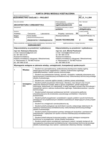 KARTA OPISU MODUŁU KSZTAŁCENIA Nazwa modułu/przedmiotu Kod BUDOWNICTWO OGÓLNE 3 - PROJEKT AU_K_1.4_004 Kierunek studiów Profil kształcenia (ogólnoakademicki, praktyczny) Rok / Semestr ARCHITEKTURA I URBANISTYKA ogólnoakademicki II/4 Specjalność Przedmiot oferowany w języku: Kurs (obligatoryjny/obieralny) polskim obligatoryjny - Liczba punktów Godziny: 2 Wykłady: Ćwiczenia: Stopień studiów: Forma studiów (stacjonarna/niestacjonarna) Obszar(y) kształcenia Podział ECTS (liczba i %) I stacjonarne i niestacjonarne NAUKI TECHNICZNE 2 Laboratoria: Projekty / seminaria: Status przedmiotu w programie studiów (podstawowy, kierunkowy, inny) KIERUNKOWY 30 100% (ogólnouczelniany, z innego kierunku) - Odpowiedzialny za przedmiot / wykładowca: Odpowiedzialny za przedmiot / wykładowca: mgr inż. Katarzyna Starzecka e-mail: [email protected] tel. 061 665 33 05 Wydział Architektury Katedra Architektury Usługowej i Mieszkaniowej ul. Nieszawska 21, 60-965 Poznań tel.: 061 665 33 05 mgr inż. arch. Michał Pawłowski e-mail: [email protected] tel. 061 665 33 05 Wydział Architektury Katedra Architektury Usługowej i Mieszkaniowej ul. Nieszawska 21, 60-965 Poznań tel.: 061 665 33 05 Wymagania wstępne w zakresie wiedzy, umiejętności, kompetencji społecznych: 1 Wiedza: Student ma uporządkowaną, podbudowaną teoretycznie wiedzę ogólną obejmującą kluczowe zagadnienia z zakresu budownictwa ogólnego, materiałoznawstwa i zasad rysunku technicznego, Student zna podstawowe metody, techniki, narzędzia i materiały stosowane przy opracowywaniu inwentaryzacji architektonicznej i dokumentacji technicznej prostego obiektu budowlanego, Student zna i rozumie ogólne zasady z zakresu prawa autorskiego. 2 Student potrafi pozyskiwać informacje z literatury, baz danych oraz innych, Umiejętno właściwie dobranych źródeł, także w języku angielskim, potrafi integrować ści: informacje, dokonywać ich interpretacji, a także wyciągać wnioski oraz formułować i uzasadniać opinie z zakresu budownictwa ogólnego, materiałoznawstwa i rysunku technicznego, Student potrafi stosować podstawowe techniki i oznaczenia graficzne charakterystyczne dla środowiska zawodowego architektów i inżynierów budownictwa, Student potrafi przygotować i przedstawić w języku polskim rysunki techniczne istniejących lub projektowanych obiektów budowlanych obejmujących prosty projekt budowlany, Student ma umiejętność samokształcenia się, Student potrafi posługiwać się technikami rysunku odręcznego właściwymi do realizacji inwentaryzacji architektonicznej i dokumentacji technicznej prostego obiektu budowlanego, Student potrafi przeprowadzać pomiary istniejących budynków i pomieszczeń interpretować i zapisywać ich wyniki w formie inwentaryzacji architektonicznobudowlanej, Student potrafi dokonać krytycznej analizy i ocenić istniejące rozwiązanie techniczne w szczególności proste obiekty budowlane, Student potrafi ocenić przydatność rutynowych metod i narzędzi służących do sporządzania inwentaryzacji architektonicznej i dokumentacji technicznej prostego obiektu budowlanego oraz wybrać i zastosować właściwą metodę i narzędzia. Kompeten Student rozumie potrzebę uczenia się przez całe życie, potrafi inspirować i cje organizować proces uczenia się innych osób, społeczne 3 Student potrafi odpowiednio określić priorytety służące realizacji inwentaryzacji architektonicznej i dokumentacji technicznej prostego obiektu budowlanego, Student potrafi identyfikować i rozstrzygać dylematy z zakresu tworzenia inwentaryzacji architektonicznej i dokumentacji technicznej prostego obiektu budowlanego. Cel przedmiotu: poznanie form i zakresów poszczególnych faz procesu projektowego w kontekście ustawy Prawo budowlane, poznanie zasad opracowywania projektu budowlanego budynku jednorodzinnego, zastosowanie poznanych zasad dotyczących projektu budowlanego budynku jednorodzinnego w wykonywanej pracy, doskonalenie umiejętności sporządzania zestawień poszczególnych elementów budynku jednorodzinnego ze szczególnym uwzględnieniem tych, które wykonuje Architekt, poznanie tradycyjnych technologii budowlanych w praktyce projektowej, rozwinięcie posiadanej wiedzy na temat materiałów budowlanych. Efekty kształcenia Wiedza: numer (symbol) W01 W02 W03 student, który zaliczył przedmiot, potrafi Student ma uporządkowaną, podbudowaną teoretycznie wiedzę ogólną obejmującą kluczowe zagadnienia z zakresu budownictwa ogólnego, materiałoznawstwa i zasad sporządzania projektu budowlanego budynku jednorodzinnego. Student zna podstawowe metody, techniki, narzędzia i materiały stosowane przy sporządzania projektu budowlanego budynku jednorodzinnego. Student ma szczegółową wiedzę, związaną z zakresem i formą projektu budowlanego budynku jednorodzinnego w branży architektoniczno-budowlanej. odniesienie do kierunkowych efektów kształcenia AU1_W01 AU1_W09 AU1_W12 Umiejętności: U01 U02 U03 U04 U05 U06 U07 U08 U09 Student potrafi pozyskiwać informacje z literatury, baz danych oraz innych, właściwie dobranych źródeł, potrafi integrować informacje, dokonywać ich interpretacji, a także wyciągać wnioski oraz formułować i uzasadniać opinie z zakresu budownictwa ogólnego, materiałoznawstwa i technologii budowlanych typowych dla budynków jednorodzinnych. Student ma umiejętność samokształcenia się. Student potrafi przygotować i przedstawić w języku polskim projekt budowlany obejmujących budynek jednorodzinny. Student potrafi porozumiewać się przy użyciu nazw elementów budynku jednorodzinnego charakterystycznych dla środowiska zawodowego architektów i inżynierów budownictwa. Student potrafi posługiwać się technikami rysunku odręcznego właściwymi do sporządzania projektu budowlanego budynku jednorodzinnego. Student potrafi wykorzystywać do projektowania elementów budynku jednorodzinnego metody analityczne, (np. szacować ga