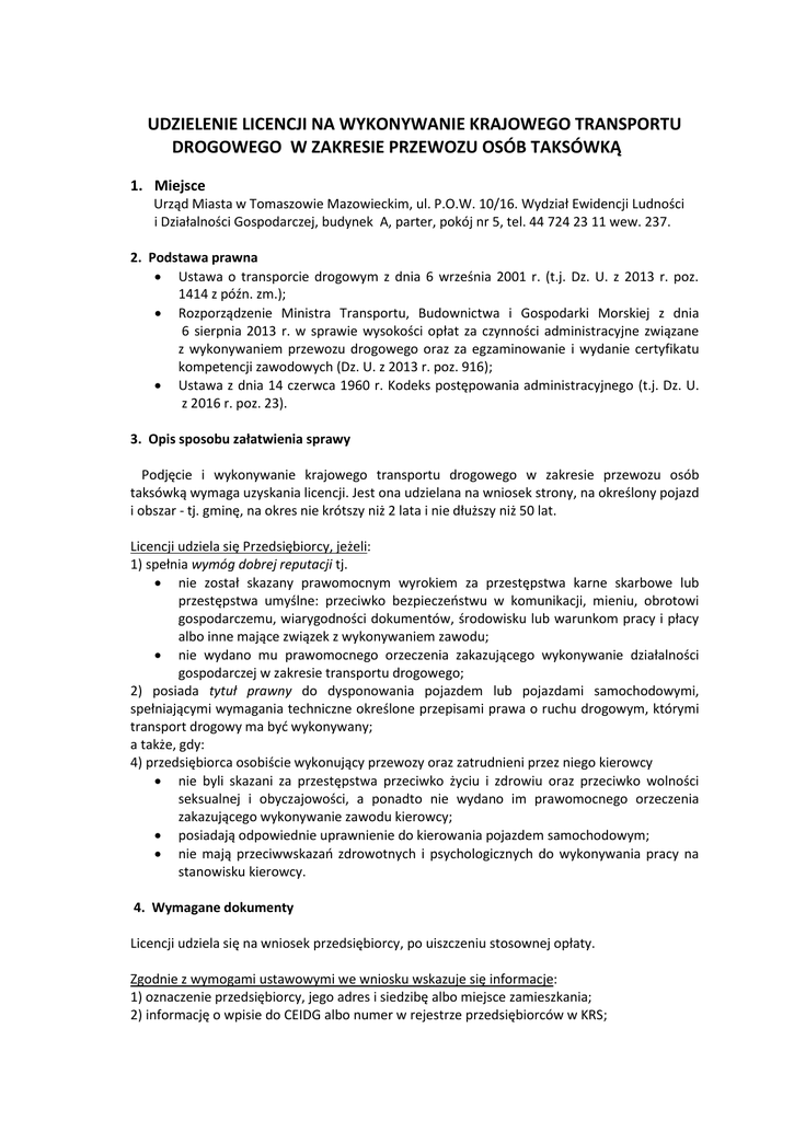 UDZIELENIE LICENCJI NA WYKONYWANIE KRAJOWEGO TRANSPORTU DROGOWEGO W ZAKRESIE PRZEWOZU OSÓB TAKSÓWKĄ 1. Miejsce Urząd Miasta w Tomaszowie Mazowieckim, ul. P.O.W. 10/16. Wydział Ewidencji Ludności i Działalności Gospodarczej, budynek A, parter, pokój nr 5, tel. 44 724 23 11 wew. 237. 2. Podstawa prawna  Ustawa o transporcie drogowym z dnia 6 września 2001 r. (t.j. Dz. U. z 2013 r. poz. 1414 z późn. zm.);  Rozporządzenie Ministra Transportu, Budownictwa i Gospodarki Morskiej z dnia 6 sierpnia 2013 r. w sprawie wysokości opłat za czynności administracyjne związane z wykonywaniem przewozu drogowego oraz za egzaminowanie i wydanie certyfikatu kompetencji zawodowych (Dz. U. z 2013 r. poz. 916);  Ustawa z dnia 14 czerwca 1960 r. Kodeks postępowania administracyjnego (t.j. Dz. U. z 2016 r. poz. 23). 3. Opis sposobu załatwienia sprawy Podjęcie i wykonywanie krajowego transportu drogowego w zakresie przewozu osób taksówką wymaga uzyskania licencji. Jest ona udzielana na wniosek strony, na określony pojazd i obszar - tj. gminę, na okres nie krótszy niż 2 lata i nie dłuższy niż 50 lat. Licencji udziela się Przedsiębiorcy, jeżeli: 1) spełnia wymóg dobrej reputacji tj.  nie został skazany prawomocnym wyrokiem za przestępstwa karne skarbowe lub przestępstwa umyślne: przeciwko bezpieczeństwu w komunikacji, mieniu, obrotowi gospodarczemu, wiarygodności dokumentów, środowisku lub warunkom pracy i płacy albo inne mające związek z wykonywaniem zawodu;  nie wydano mu prawomocnego orzeczenia zakazującego wykonywanie działalności gospodarczej w zakresie transportu drogowego; 2) posiada tytuł prawny do dysponowania pojazdem lub pojazdami samochodowymi, spełniającymi wymagania techniczne określone przepisami prawa o ruchu drogowym, którymi transport drogowy ma być wykonywany; a także, gdy: 4) przedsiębiorca osobiście wykonujący przewozy oraz zatrudnieni przez niego kierowcy  nie byli skazani za przestępstwa przeciwko życiu i zdrowiu oraz przeciwko wolności seksualnej i obyczajowości, a ponadto nie wydano im prawomocnego orzeczenia zakazującego wykonywanie zawodu kierowcy;  posiadają odpowiednie uprawnienie do kierowania pojazdem samochodowym;  nie mają przeciwwskazań zdrowotnych i psychologicznych do wykonywania pracy na stanowisku kierowcy. 4. Wymagane dokumenty Licencji udziela się na wniosek przedsiębiorcy, po uiszczeniu stosownej opłaty. Zgodnie z wymogami ustawowymi we wniosku wskazuje się informacje: 1) oznaczenie przedsiębiorcy, jego adres i siedzibę albo miejsce zamieszkania; 2) informację o wpisie do CEIDG albo numer w rejestrze przedsiębiorców w KRS; 3) numer identyfikacji podatkowej (NIP); 4) określenie rodzaju i zakresu transportu drogowego oraz obszaru wykonywania przewozu; 5) określenie czasu na jaki licencja ma być udzielona. Do wniosku dołącza się: 1) oświadczenie przedsiębiorcy o spełnieniu wymogu dobrej reputacji 2) oświadczenie o zamiarze zatrudnienia kierowców lub o zamiarze współpracy z osobami niezatrudnionymi przez przedsiębiorcę, lecz wykonującymi osobiście przewóz na jego rzecz w związku z art.8 ust. 3 pkt 4 ustawy z dnia 6 września 2001 r. o transporcie drogowym. 3) wykaz pojazdów zawierający informacje:  markę i typ,  rodzaj/ przeznaczenie,  numer rejestracyjny,  numer VIN,  wskazanie rodzaju tytułu prawnego do dysponowania pojazdem, 4) dowód uiszczenia opłaty za wydanie licencji. 5. Opłaty 1) Wysokość opłaty opłata za udzielenie licencji na wykonywanie krajowego transportu drogowego w zakresie przewozu osób taksówką na obszarze gminy wynosi:  200 zł - od 2 do 15 lat,  250 zł – powyżej 15 do 30 lat,  300 zł – powyżej 30 do 50 lat. 2) Sposób wniesienia opłaty:  w kasie Urzędu Miasta w Tomaszowie Mazowieckim (parter w budynku A) lub  na rachunek bankowy : ING Bank Śląski Nr 90 1050 1461 1000 0023 6464 4324 6. Termin udzielenia odpowiedzi w ciągu miesiąca od dnia złożenia wniosku wraz z załącznikami. 7. Jednostka odpowiedzialna Wydział Ewidencji Ludności i Działalności Gospodarczej, budynek A, parter, pokój nr 5, tel. 44 724 23 11 wew. 237. 8. Tryb odwoławczy Od decyzji stronie przysługuje odwołanie do Samorządowego Kolegium Odwoławczego w Piotrkowie Trybunalskim za pośrednictwem Prezydenta Miasta Tomaszowa Maz., w terminie 14 dni od dnia doręczenia decyzji. 9. Inne informacje Przedsiębiorca jest obowiązany zgłaszać na piśmie lub w postaci dokumentu elektronicznego organowi, który udzielił licencji na wykonywanie krajowego transportu drogowego w zakresie przewozu osób taksówką, wszelkie zmiany danych, o których mowa w art. 8 ustawy z dnia 6 września 2001 r. o transporcie drogowym, nie później niż w terminie 28 dni od dnia ich powstania. Jeżeli zmiany obejmują dane zawarte w licencji, przedsiębiorca jest obowiązany wystąpić z wnioskiem o zmianę treści licencji. 10. Załączniki 1) WLDG-23-01 wniosek o udzielenie licencji na wykonywanie krajowego transportu drogowego taksówką; 2) WLDG-23-02 oświadczenie przedsiębiorcy o spełnieniu wymogu dobrej reputacji; 3) WLDG-23-03 oświadczenie przedsiębiorcy osobiście wykonującego przewozy; 4) WLDG-23-04 oświadczenie o zamiarze zatrudnienia kierowców/współpracy z osobami niezatrudnionymi przez przedsiębiorcę, lecz wykonującymi osobiście przewóz na jego rzecz.