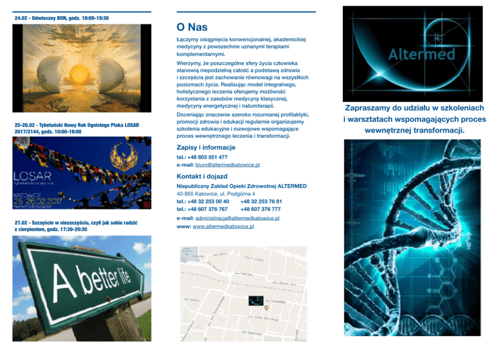 24.02 - Odwieczny BON, godz. 18:00-19:30 O Nas Łączymy osiągnięcia konwencjonalnej, akademickiej medycyny z powszechnie uznanymi terapiami komplementarnymi. Wierzymy, że poszczególne sfery życia człowieka stanowią niepodzielną całość a podstawą zdrowia i szczęścia jest zachowanie równowagi na wszystkich poziomach życia. Realizując model integralnego, holistycznego leczenia oferujemy możliwość korzystania z zasobów medycyny klasycznej, medycyny energetycznej i naturoterapii. 25-26.02 - Tybetański Nowy Rok Ognistego Ptaka LOSAR 2017/2144, godz. 10:00-18:00 Doceniając znaczenie szeroko rozumianej profilaktyki, promocji zdrowia i edukacji regularnie organizujemy szkolenia edukacyjne i rozwojowe wspomagające proces wewnętrznego leczenia i transformacji. Zapisy i informacje tel.: +48 603 551 477 e-mail: [email protected] Kontakt i dojazd Niepubliczny Zakład Opieki Zdrowotnej ALTERMED 40-955 Katowice, ul. Podgórna 4 tel.: +48 32 253 00 40 +48 32 253 76 81 tel.: +48 607 376 767 +48 607 376 777 27.02 - Szczęście w nieszczęściu, czyli jak sobie radzić z cierpieniem, godz. 17:30-20:30 e-mail: [email protected] www: www.altermedkatowice.pl Zapraszamy do udziału w szkoleniach i warsztatach wspomagających proces wewnętrznej transformacji. 02.02 - Zostań coachem mentalnym swojego dziecka, godz. 9:00-12:00 04-05.02 - TSA LUNG Joga tybetańska 10:00-18:00 16.02 - Klub coacha Katowice godz. 11:00 - 14:00 04.02 - Proces terapeutyczny metodą Spirali Świadomości, godz. 11:00 - 20:00 03.02 - Alchemia, tantra, joga, godz. 18:00-19:30 03.02 - Mit, Symbol - metaforyczny język nieświadomości, godz. 18:00 - 19.00 18.02 - The Alchemy of Sacred Geometry godz. 11:00 - 18:00 13.02 - Przenikliwość - głębokie pytania w drodze do Prawdy, godz. 17:30 - 20:00 23.02 - Dzień otwarty BON godz. 18:00 - 20:00
