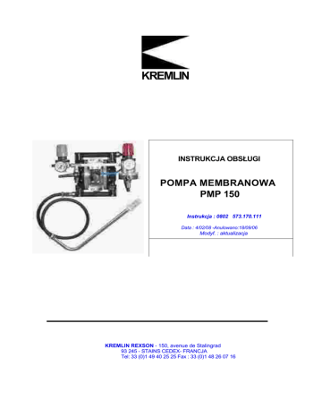 KREMLIN INSTRUKCJA OBSŁUGI POMPA MEMBRANOWA PMP 150 Instrukcja : 0802 573.170.111 Data : 4/02/08 -Anulowano:18/09/06 Modyf. : aktualizacja KREMLIN REXSON - 150, avenue de Stalingrad 93 245 - STAINS CEDEX- FRANCJA Tel: 33 (0)1 49 40 25 25 Fax : 33 (0)1 48 26 07 16 KREMLIN POMPA MEMBRANOWA PMP 150 SPIS TREŚCI 1. DEKLARACJA ZGODNOŚCI ..................................................................................................................... 2 1. ZALECENIA BHP .................................................................................................................................... 2 2. ZASADA DZIAŁANIA................................................................................................................................ 6 3. DANE TECHNICZNE ................................................................................................................................ 6 4. MONTAŻ .................................................................................................................................................. 7 5. URUCHOMIENIE ...................................................................................................................................... 9 6. ZAKOŃCZENIE PRACY ......................................................................................................................... 10 7. OBSŁUGA TECHNICZNA....................................................................................................................... 10 8. USTERKI DZIAŁANIA............................................................................................................................. 11 9. NAPRAWA ............................................................................................................................................. 11 Części zamienne : KREMLIN REXSON Pompa b/osprz. PMP 150 Pompa kompletna Pompa PMP 150 z obiegiem cyrk. Pompa PMP 150 PRATIK Zestaw reduktora ciśnienia silnika Str. 1 (dok. 573.249.050) (dok. 573.246.050) (dok. 573.247.050) (dok. 573.248.050) (dok. 573.030.050) lnstrukcja : 573.170.111 Szanowni Państwo, Dziękujemy za zakup nowej pompy PMP 150. Dołożyliśmy wszelkich starań, zarówno na etapie opracowywania projektu jak i produkcji, by wyrób ten w pełni Państwa zadowolił. Jeżeli jednak urządzenie nie odpowiada Państwa oczekiwaniom, prosimy o kontakt z naszą firmą. W celu poprawnego i optymalnego wykorzystania sprzętu prosimy o dokładne zapoznanie się z niniejszą instrukcją przed uruchomieniem urządzenia. 1. DEKLARACJA ZGODNOŚCI Producent : KREMLIN REXSON o kapitale wynoszącym 6 720 000 euro z siedzibą pod adresem : 150, avenue de Stalingrad - 93 245 - STAINS CEDEX FRANCJA Tel. 33 (0)1 49 40 25 25 - Faks : 33 (0)1 48 26 07 16 oświadcza, że poniższe urządzenie: pompa malarska – jest zgodne z następującymi dyrektywami WE – Dyrektywą Maszynową (Dyrektywa 98/37/CE) oraz z przepisami harmonizacyjnymi. Ex - Dyrektywą ATEX (Dyrektywa 94/9/CE) : gaz). II 2 G (grupa II, kategoria 2, Sporządzono w Stains, dnia 1ego marca 2003 roku, Daniel TRAGUS Dyrektor Generalny 2. GWARANCJA Zastrzegamy sobie prawo wprowadzania wszelkich zmian lub ulepszeń, nawet po przyjęciu zamówienia, co nie uprawnia do zarzucania nam braku zgodności z opisem zawartym w instrukcjach obsługi i w schematach roboczych. Nasze urządzenia są poddawane kontroli i testom przed wysyłką. Wszelkie reklamacje dotyczące urządzeń powinny zostać złożone na piśmie w terminie 10 dni od daty dostawy, pod rygorem nieważności. Urządzenia KREMLIN REXSON, oznaczone fabrycznymi tabliczkami znamionowymi są objęte roczną gwarancją (w systemie pracy jednozmianowej lub 1800 godzin pracy) od daty loco fabryka na wszelkie wady materiałowe lub konstrukcyjne, które podlegają naszej ocenie. Gwarancja nie obejmuje części podlegających zużyciu, uszkodzeń lub zużycia wynikających z nieprawidłowej eksploatacji lub niezgodnej z przeznaczeniem określonym przez KREMLIN REXSON, nie przestrzegania instrukcji dotyczących prawidłowego działania lub braku konserwacji. Gwarancja ogranicza się do naprawy lub wymiany części zwróconych do naszego zakładu i uznanych za wadliwe przez nasze służby i nie pokrywa części podlegających zużyciu. W żadnym wypadku nie możemy być obciążani ewentualnymi kosztami wynikającymi z przestoju. Koszty zwrotu do naszego zakładu są pokrywane przez klienta. Możemy wykonać naprawę na miejscu na zlecenie klienta. W tym przypadku koszty przejazdu i zakwaterowania naszych pracowników technicznych są pokrywane przez zamawiającego. Wszelkie zmiany dokonywane w naszych urządzeniach bez naszej zgody powodują uchylenie gwarancji. Nasza gwarancja ogranicza się do zakresu gwarancji naszych dostawców urządzeń, które wchodzą w skład naszych zespołów. | KREMLIN REXSON Str. 2 Instrukcja : 573.170.1111 3. ZALECENIA BHP ZALECENIA OGÓLNE UWAGA : Niewłaściwe użytkowanie niniejszego urządzenia zgodnie z zaleceniami zawartymi w niniejszej instrukcji może być źródłem zagrożeń . Należy dokładnie zapoznać się z instrukcją przed rozpoczęciem eksploatacji urządzenia. Pracownicy obsługujący urządzenie powinni zostać stosownie przeszkoleni. (W sprawie szkoleń należy skontaktować się z ośrodkiem szkoleniowym "KREMLIN REXSON UNIVERSITY" w Stains). Kierownik zakładu powinien sprawdzić czy operatorzy zrozumieli prawidłowo wszystkie instrukcje i zasady BHP dotyczące urządzenia i pozostałych elementów linii produkcyjnej. Należy zapoznać się uważnie z wszystkimi instrukcjami obsługi oraz tabliczkami umieszczonymi na urządzeniach przed uruchomieniem. Nieprawidłowa eksploatacja lub działanie może być przyczyną groźnych obrażeń. Urządzenie jest przeznaczone do zastosowań profesjonalnych. Powinno być używane wyłącznie zgodnie z przeznaczeniem. Nie przerabiać urządzenia i nie wprowadzać żadnych zmian. Części zamienne i wyposażeni