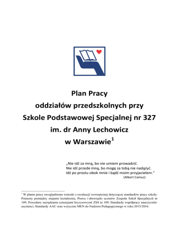 Plan Pracy oddziałów przedszkolnych przy Szkole Podstawowej Specjalnej nr 327 im. dr Anny Lechowicz w Warszawie1 „Nie idź za mną, bo nie umiem prowadzić. Nie idź przede mną, bo mogę za tobą nie nadążyć. Idź po prostu obok mnie i bądź moim przyjacielem.” (Albert Camus) W planie pracy uwzględniono wnioski z ewaluacji wewnętrznej dotyczącej standardów pracy szkoły: Pomosty pomiędzy etapami kształcenia, Prawa i obowiązki uczniów Zespołu Szkół Specjalnych nr 109, Procedury zarządzania sytuacjami kryzysowymi ZSS nr 109, Standardy współpracy nauczycieleasystenci, Standardy AAC oraz wytyczne MEN do Nadzoru Pedagogicznego w roku 2015/2016. 1 SPIS TREŚCI I OBSZAR GŁÓWNY: KONCEPCJA PRACY ODDZIAŁÓW PRZEDSZKOLNYCH ...................... 3 1. Obszar szczegółowy: Zarządzanie strategiczne................................................................................ 3 2. Obszar szczegółowy: Wewnątrzszkolny system zapewnienia jakości ............................................ 5 3. Obszar szczegółowy: Promocja ........................................................................................................ 7 II OBSZAR GŁÓWNY: ZARZĄDZANIE I ORGANIZACJA .............................................................. 9 1.Obszar szczegółowy: Nauczyciele ..................................................................................................... 9 2.Obszar szczegółowy: Rozwój zawodowy nauczycieli .................................................................... 10 3.Obszar szczegółowy: Warunki działalności szkoły......................................................................... 12 4. Obszar szczegółowy: Zdrowie, higiena i bezpieczeństwo pracy ................................................... 13 5.Obszar szczegółowy: Kierowanie szkołą, obieg informacji............................................................ 15 III OBSZAR GŁÓWNY KSZTAŁCENIE ............................................................................................. 16 1. Obszar szczegółowy: Programy nauczania..................................................................................... 16 2. Obszar szczegółowy: Organizacja procesu kształcenia.................................................................. 17 3. Obszar szczegółowy: Przebieg procesu kształcenia ....................................................................... 19 IV OBSZAR GŁÓWNY: WYCHOWANIE I OPIEKA ........................................................................ 21 1.Obszar szczegółowy: Równość szans .............................................................................................. 21 2. Obszar szczegółowy: Praca wychowawcza i profilaktyczna ......................................................... 22 3. Obszar szczegółowy: Praca opiekuńcza ..................................................................................... 24 Opracowanie ............................................................................................................................................ 25 2 I OBSZAR GŁÓWNY: KONCEPCJA PRACY ODDZIAŁÓW PRZEDSZKOLNYCH 1. Obszar szczegółowy: Zarządzanie strategiczne Przedszkole posiada wyraźnie określone i akceptowane przez nauczycieli, przedszkolaków i rodziców cele i kierunki działania. Nauczyciele uczestniczą w procesie planowania, rozumieją i akceptują strategię działania oddziału przedszkolnego. Dyrektor angażuje nauczycieli i rodziców do tworzenia i modyfikowania programu przedszkola. Zadania Zapoznanie ze Statutem Szkoły i realizacja zapisów statutowych. Włączenie wszystkich podmiotów przedszkola w proces planowania, realizacji, ewaluacji, modyfikacji programu rozwoju oddziałów przedszkolnych. Uzupełnienie dokumentacji regulującej pracę Oddziałów Przedszkolnych. Sposób realizacji Osoby odpowiedzialne 1. Zapoznanie nauczycieli i rodziców ze Statutem i podstawową dokumentacją istniejącą w Szkole i w Oddziałach Przedszkolnych. Dyrektor szkoły 2. Realizacja zapisów Statutu Szkoły. Wszystkie Organy Szkoły Termin realizacji 31 sierpnia i wrzesień 2015 r. Uwagi o realizacji dokumentacja szkolna 1. Przeszkolenie personelu pedagogicznego Rehabilitanci wrzesień 2015 r. i pomocniczego w zakresie opieki nad dziećmi: Terapeuci indywidualni właściwe asystowanie podczas zajęć przedszkolnych i wspomaganie podczas codziennych czynności, w szczególności w trakcie karmienia, przemieszczania się, toalety oraz technik przenoszenia, użytkowania i zabezpieczenia sprzętu rehabilitacyjnego. dokumentacja szkolna 2. Przydział czynności dodatkowych dla nauczycieli, przydział uroczystości przedszkolnych – załącznik nr 1, załącznik nr 2. Dyrektor szkoły 27 sierpnia 2015 r. protokół z posiedzenia Rady Pedagogicznej 3. Zapoznanie rodziców z planowanymi działaniami szkoły i Oddziałów Przedszkolnych na najbliższy rok. Dyrektor szkoły Wychowawcy grup wrzesień 2015 r. zapisy w dziennikach 1. Dopilnowanie złożenia przez rodziców dzieci rozpoczynających edukację w przedszkolu orzeczeń o potrzebie kształcenia specjalnego i potrzebie wczesnego wspomagania. Wychowawcy grup Psycholog wrzesień 2015 r. dotyczy dzieci rozpoczynających i kontynuujących edukację w przedszkolu 3 Zadania Sposób realizacji 2. Dopilnowanie złożenia przez rodziców wniosków o zmianę orzeczenia o potrzebie kształcenia specjalnego i potrzebie wczesnego wspomagania, dzieciom posiadającym nieaktualne i nieadekwatne orzeczenia. Osoby odpowiedzialne Termin realizacji Uwagi o realizacji Wychowawcy grup Psycholog 3.Dbanie o prowadzenie zgodnie z przepisami dokumentacji Oddziałów Przedszkolnych. 4. Opracowanie planu pracy Oddziałów Przedszkolnych. 4 2. Obszar szczegółowy: Wewnątrzszkolny system zapewnienia jakości Nadzór pedagogiczny w Oddziałach Przedszkolnych zapewnia ciągły rozwój i doskonalenie pracy oraz zmierza do zaspokajania potrzeb dzieci, rodziców i nauc
