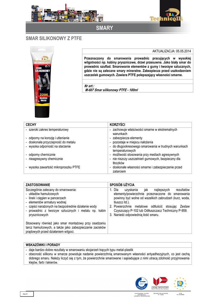 SMAR SILIKONOWY Z PTFE AKTUALIZACJA: 05.05.2014 Przeznaczony do smarowania prowadnic pracujących w wysokiej wilgotności np. kabiny prysznicowe, drzwi przesuwne. Jako biały smar do prowadnic szuflad. Smarowanie elementów z gumy i tworzyw sztucznych, gdzie nie są zalecane smary mineralne. Zabezpiecza przed uszkodzeniem uszczelek gumowych. Zawiera PTFE polepszający własności smarne. Nr art.: M-607 Smar silikonowy PTFE - 100ml CECHY - szeroki zakres temperaturowy - odporny na korozję i utlenianie - doskonała przyczepność do metalu - wysoka odporność na starzenie - odporny chemicznie - nieagresywny chemicznie - wysoka zawartość mikroproszku PTFE ZASTOSOWANIE Szczególnie zalecany do smarowania: - układów hamulcowych - linek i cięgien w pancerzach - elementów armatury wodnej - części narażonych na bezpośrednie działanie wody - prowadnic z tworzyw sztucznych i metalu np. kabin prysznicowych KORZYŚCI - zachowuje właściwości smarne w ekstremalnych warunkach - zabezpiecza elementy - pozostaje w miejscu nałożenia - do długookresowego smarowania w trudnych warunkach temperaturowych - możliwość stosowania przy mediach agresywnych - nie niszczy uszczelnień gumowych, bezpieczny dla tłoczków - doskonałe własności smarne i zabezpieczenie przed zatarciem SPOSÓB UŻYCIA 1. Dla uzyskania jak najlepszych rezultatów elementy/powierzchnie przeznaczone do smarowania powinny być wolne od wszelkich zabrudzeń (kurz, woda, tłuszcz itd.). 2. Powierzchnie metalowe odtłuścić stosując Zestaw Czyszczący P-102 lub Odtłuszczacz Techniczny P-959. 3. Nanieść odpowiednią ilość smaru. Stosowany również jako smar montażowy przy osadzaniu tarcz hamulcowych, a także jako zabezpieczanie zacisków prądowych przed działaniem wilgoci. WSKAZÓWKI I PORADY - daje bardzo dobre rezultaty w smarowaniu skojarzeń trących typu metal-plastik - obecność silikonu w smarze powoduje nadanie powierzchnią smarowanym własności antyadhezyjnych, co jest cechą dobrego smaru. Należy liczyć się z tym, że powierzchnie smarowane i sąsiadujące z nimi utracą zdolność przyjmowania klejów, farb i lakierów. PD-PT SMAR SILIKONOWY Z PTFE DANE TECHNICZNE nr art.: kod taryfy celnej: EAN: opakowanie: okres ważności: klasa NLGI: M-607 3403 19 10 5902051001607 100 ml 48 miesięcy 2 kolor: gęstość: odporność na temp.: lotność: działanie korodujące na płytkach miedzi, 100C/3h: biały 1,25 g/cm3 -40°C ÷ 200°C < 2% 1 stopień korozji PRZECHOWYWANIE Przechowywać w temperaturze od 5°C do 25°C. Chronić przed wilgocią. PRODUKTY POKREWNE Odtłuszczacz Techniczny, Zestaw Czyszczący, Smar do tłoczków, Zestaw naprawczy do hamulców INFORMACJA DOTYCZĄCA BEZPIECZEŃSTWA I OCHRONY ZDROWIA Patrz: Karta charakterystyki preparatu chemicznego. UWAGA: Chronić przed dziećmi. Niniejsze informacje opierają się na aktualnym stanie wiedzy firmy NALMAT Trzebinia i są podane w celu opisania produktu. Nie mogą być interpretowane jako gwarancja jego właściwości. Na użytkowniku spoczywa obowiązek sprawdzenia przydatności wyrobu do określonych zastosowań oraz zapewnieniu bezpiecznego stanowiska pracy i przestrzegania wszystkich obowiązujących uregulowań prawnych. Dział handlowy: ul. Kościuszki 88, 32-540 Trzebinia tel. +48 32 612 10 10, fax. +48 32 612 10 66, Pon - Pt godz. 6:00 - 16:00 www.technicqll.pl [email protected] Produkcja i magazyn: ul. 22-go Lipca 64a, 32 -540 Trzebinia tel./fax. +48 32 711 53 27, tel./fax. +48 32 711 57 32, Pon - Pt godz. 6:00 - 14:00 PD-PT