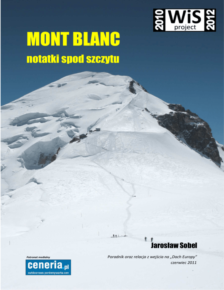 Mont Blanc – notatki spod szczytu MONT BLANC notatki spod szczytu Jarosław Sobel Patronat medialny Poradnik oraz relacja z wejścia na „Dach Europy” czerwiec 2011 str. 1 Mont Blanc – notatki spod szczytu Poradnik ten zawiera informacje przydatne w czasie przygotowywania się do wyprawy na najwyższy szczyt Europy jakim jest Mont Blanc. Aktualna wersja poradnika znajduje się na stronie internetowej: http://wisproject.wordpress.com/. Autor Jarosław Sobel Zdjęcia Jarosław Sobel, Małgorzata Kucyniak Korekta Małgorzata Kucyniak Wyposażenie apteczki górskiej mgr farm. Małgorzata Kucyniak Copyright © Jarosław Sobel, 2011 Autor tego poradnika dołożył wszelkich starań by jego informacje były rzetelne i sprawdzone, nie może jednak wziąć odpowiedzialności za jakiekolwiek skutki wynikające z podanych w nim informacji. Rybnik, 2011 Numer wydania 1 str. 2 Mont Blanc – notatki spod szczytu Spis treści Od Autora ................................................................................................................................................ 4 Dojazd .................................................................................................................................................. 5 Punkty kontrolne – wysokość oraz koordynaty GPS ........................................................................... 6 Dzień przed … (24.06) .......................................................................................................................... 8 Relacja ..................................................................................................................................................... 9 Dzień pierwszy (25.06) ........................................................................................................................ 9 Dzień drugi (26.06) ............................................................................................................................ 14 Dzień trzeci (27.06)............................................................................................................................ 18 Dzień czwarty (28.06) ........................................................................................................................ 23 Poradnik ................................................................................................................................................ 24 Wyposażenie ..................................................................................................................................... 24 Apteczka górska................................................................................................................................. 27 Sprzęt wypróbowany na wyprawie ................................................................................................... 29 Potrzebne umiejętności..................................................................................................................... 29 Miejsca – informacje praktyczne....................................................................................................... 30 Pomysły na trasę ............................................................................................................................... 33 Fakty i mity ........................................................................................................................................ 33 Przydatne linki ................................................................................................................................... 36 Podziękowania....................................................................................................................................... 36 Uwagi końcowe ..................................................................................................................................... 39 str. 3 Mont Blanc – notatki spod szczytu Od Autora Niniejsza relacja nie ma być tylko opisem wejścia na Mont Blanc. Takich streszczeń można znaleźć mnóstwo w Internecie. Natomiast mi zależało na tym, aby oprócz samego opisu przejścia przekazać dodatkowo wskazówki praktyczne (informacje o schroniskach, o cenach oraz o potrzebnym wyposażeniu). Podczas planowania wyprawy szukaliśmy z Gosią przydatnych informacji w Internecie oraz wśród znajomych. W sieci znaleźliśmy tysiące relacji, jednak zazwyczaj były to tylko uogólnione opisy samego przejścia, np. osoby piszą: „wyszliśmy z Les Houches do Tete Rousse” (z którego miejsca dokładnie w Les Houches? jaką trasą? itp.). Nie znaleźliśmy również dość istotnych informacji o cenach, m.in. jakie są opłaty za nocleg w schroniskach, ile kosztuje butelka wody oraz czy można płacić kartą płatniczą. Stąd też, podczas schodzenia ze szczytu, zrodził się pomysł, aby przygotować taki oto poradnik dla osób chcących zdobyć najwyższy szczyt Europy (kwestię tego, czy Mont Blanc czy też Elbrus jest najwyższym szczytem naszego kontynentu pozostawmy geografom i zwolennikom Messnera). Co więcej, w jednym ze sklepów w Chamonix widziałem przewodnik, w którym na zdjęciach zaznaczone były kolorowymi liniami przejścia poszczególnych odcinków trasy. Zainspirowało mnie to do tego, aby podobne ilustracje umieścić w swojej relacji. Życzę miłej lektury. Jarosław Sobel str. 4 Mont Blanc – notatki spod szczytu Dojazd Nasza wyprawa odbyła się w czerwcu 2011r. Początkowo plan zakładał wyście w dniu 18 czerwca. Niestety prognoza pogody, która zapowiadała burze, powstrzymała nas przed wyjściem i zmusiła do przesunięcia terminu na 22 czerwca. Wybraliśmy drogę „klasyczną” (francuską) od strony Chamonix, a konkretnie z Les Houches. Wiele osób, które dopiero przymierzają się do wspinaczki dowiaduje się, że u stóp masywu leży znany kurort narciarski (Chamonix) stąd też skojarzenie, że trasa rozpoczyna się właśnie tutaj. Jest to jednak b